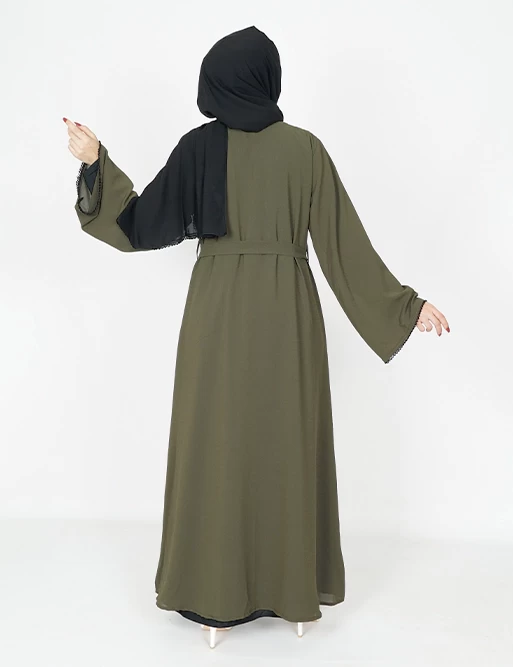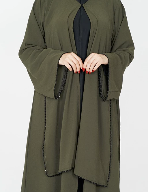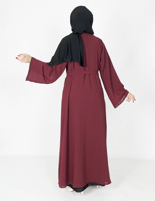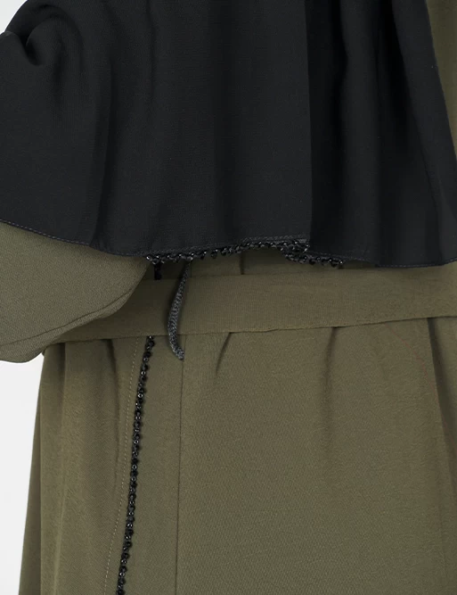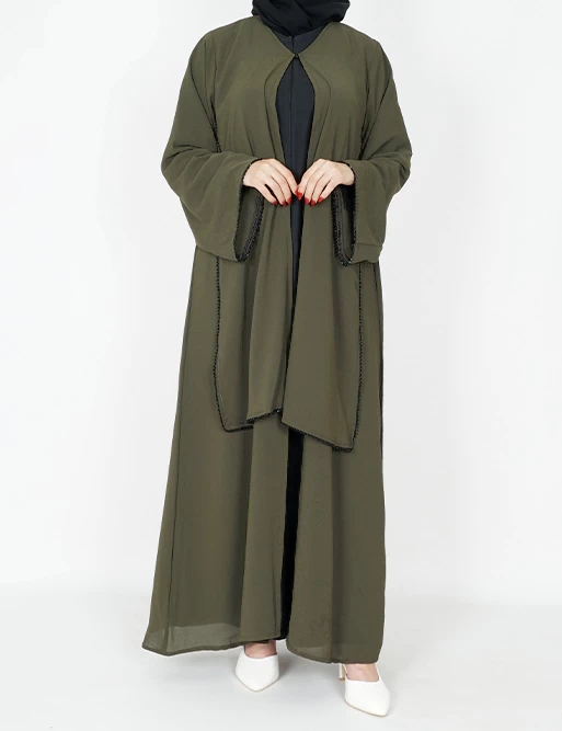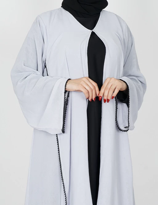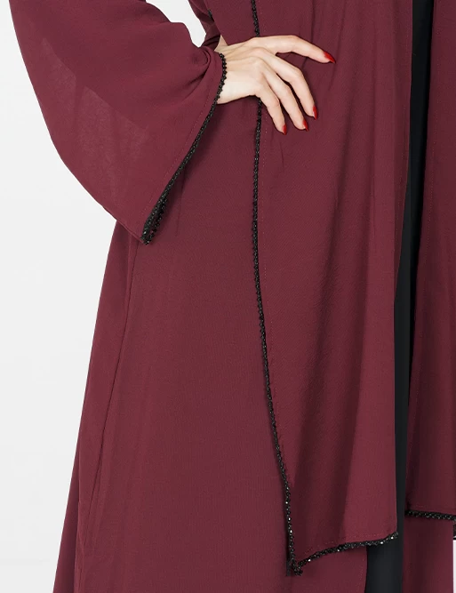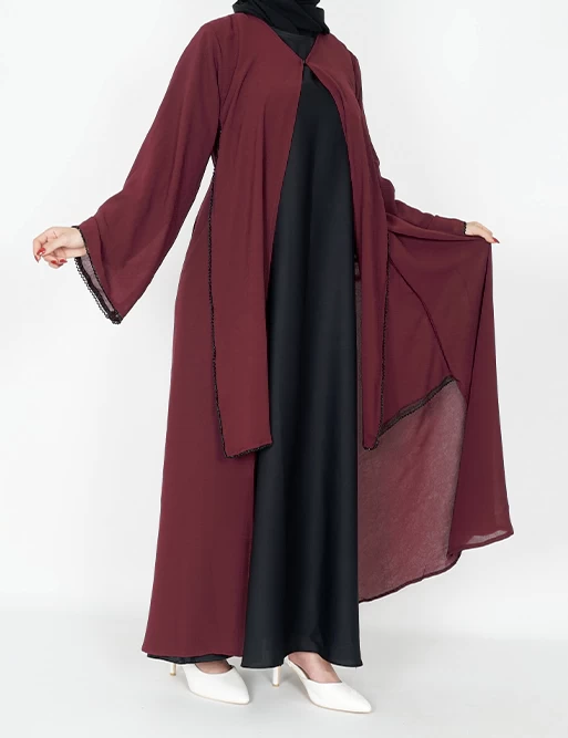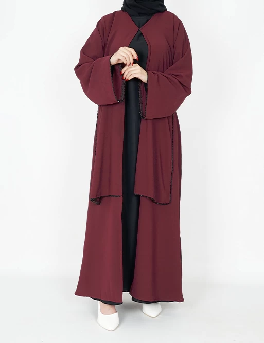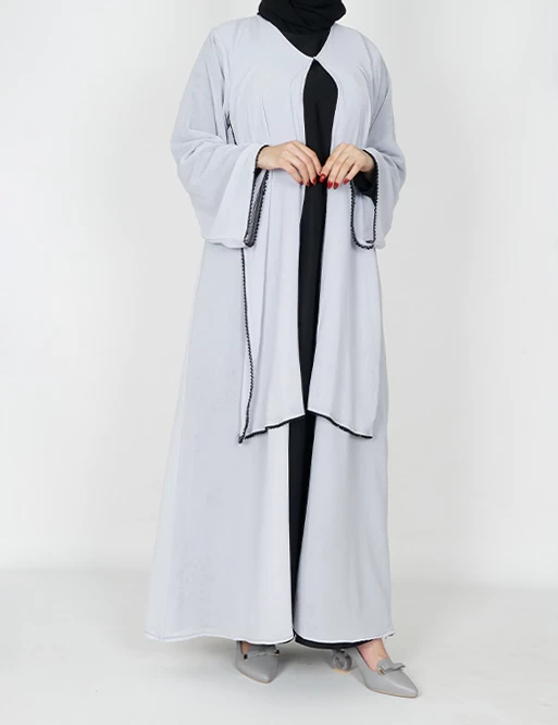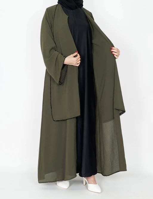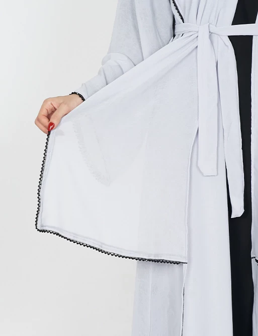 نوع القماش : شيفونطبقتين طبقة بلون أسود وطبقة أخرى بلون آخرعلى قيطان بالأمامأكمام عريضه على زرارت من الأطراف للتحكم بالكم.