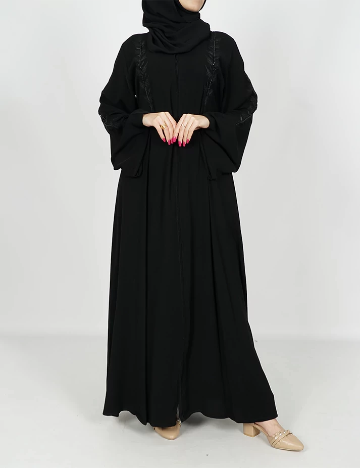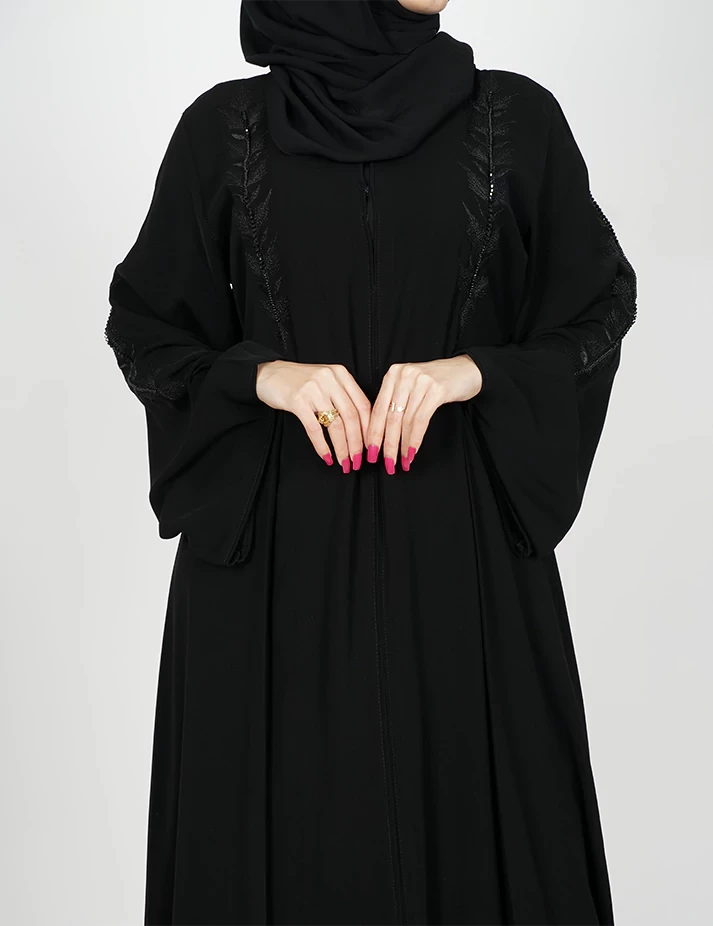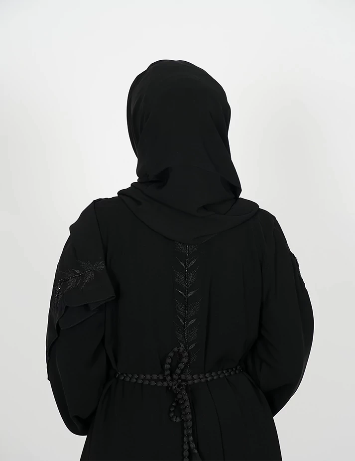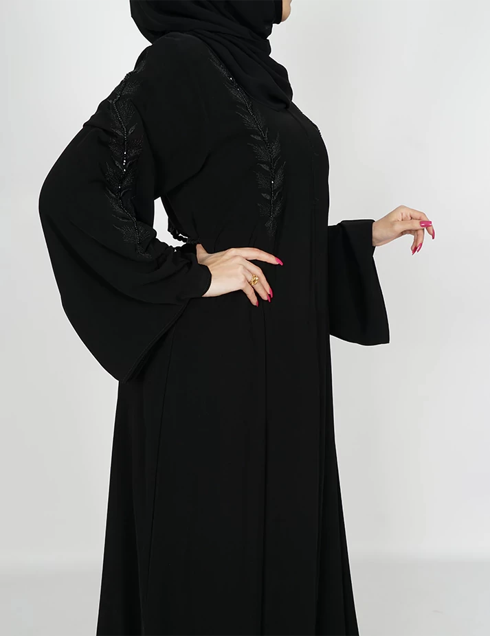 القماش : نصف القمر كوري رقبة سبعة على زرارين بالصدر و من تحت مغلق نقشة تطريزه بالصدر و اليدات و الخلف و على ربطة بالخصر يدات كم عريضه و زرارت باليدات