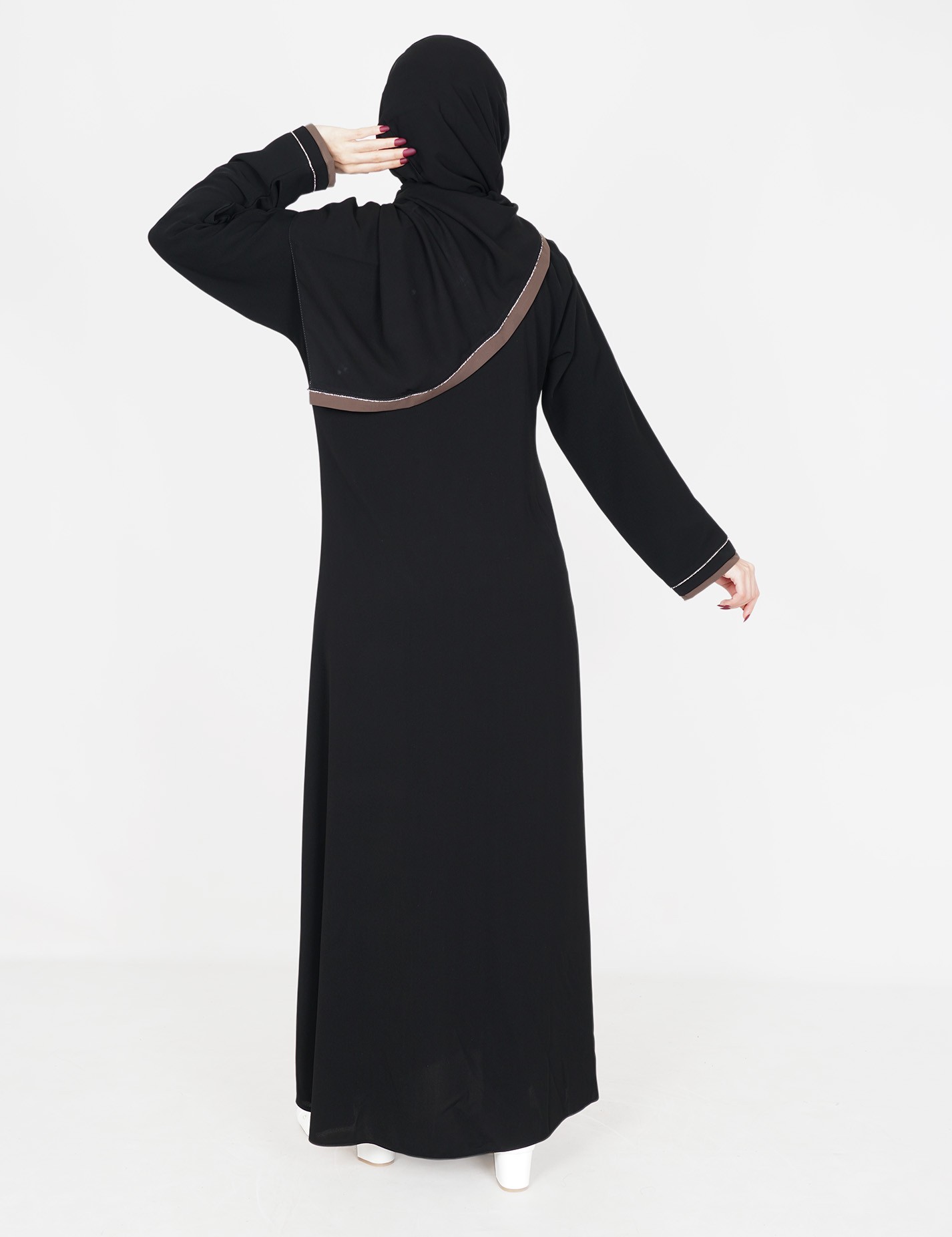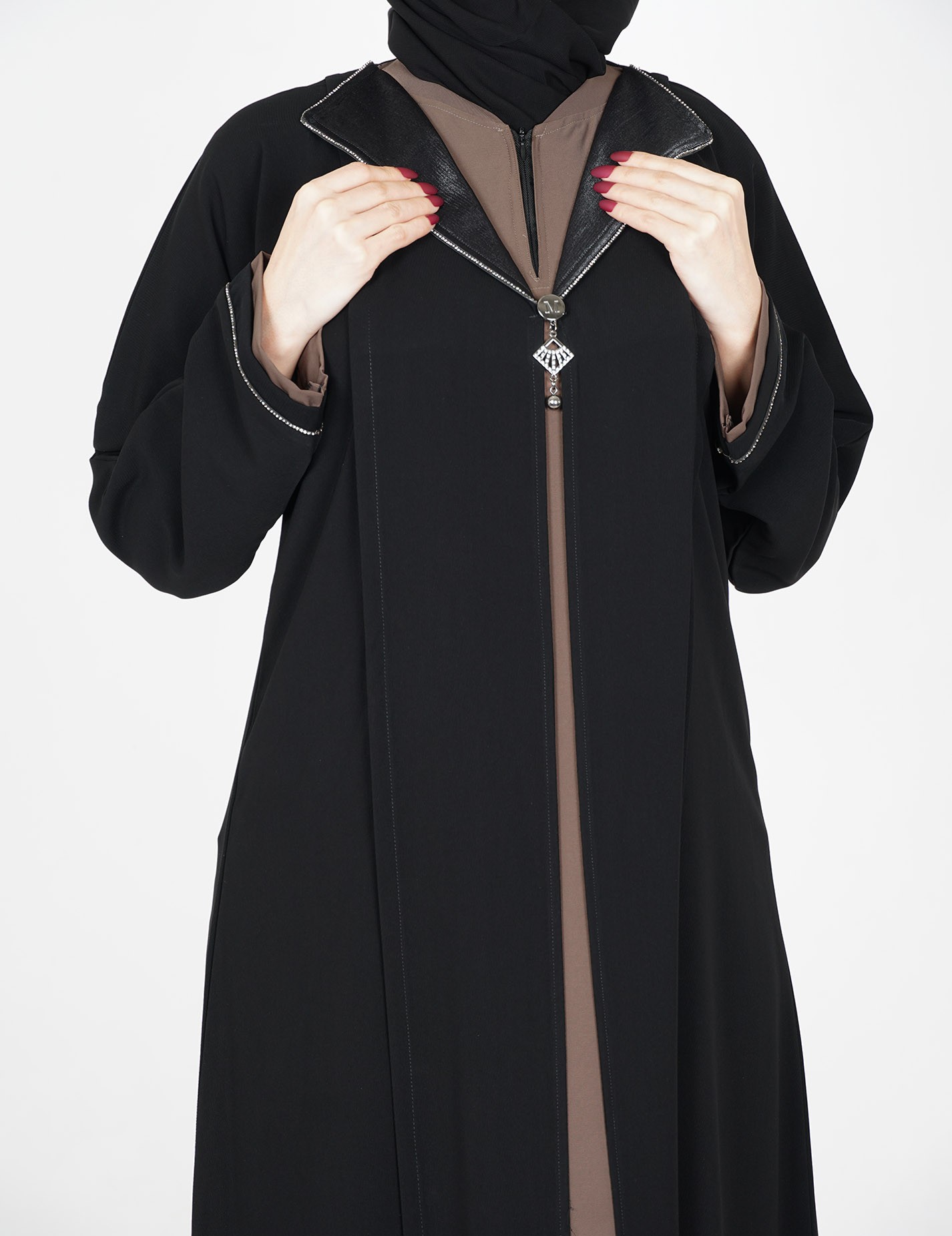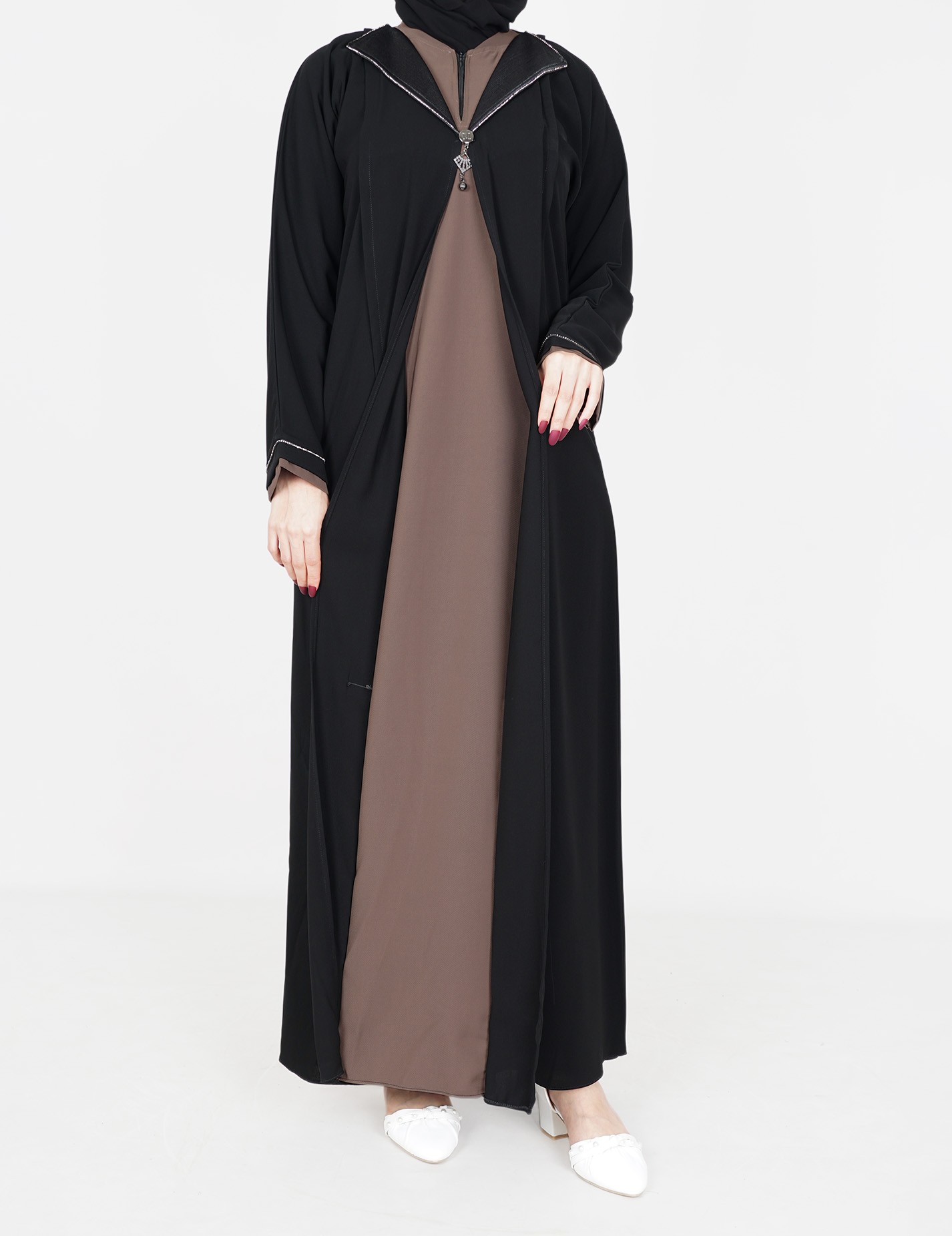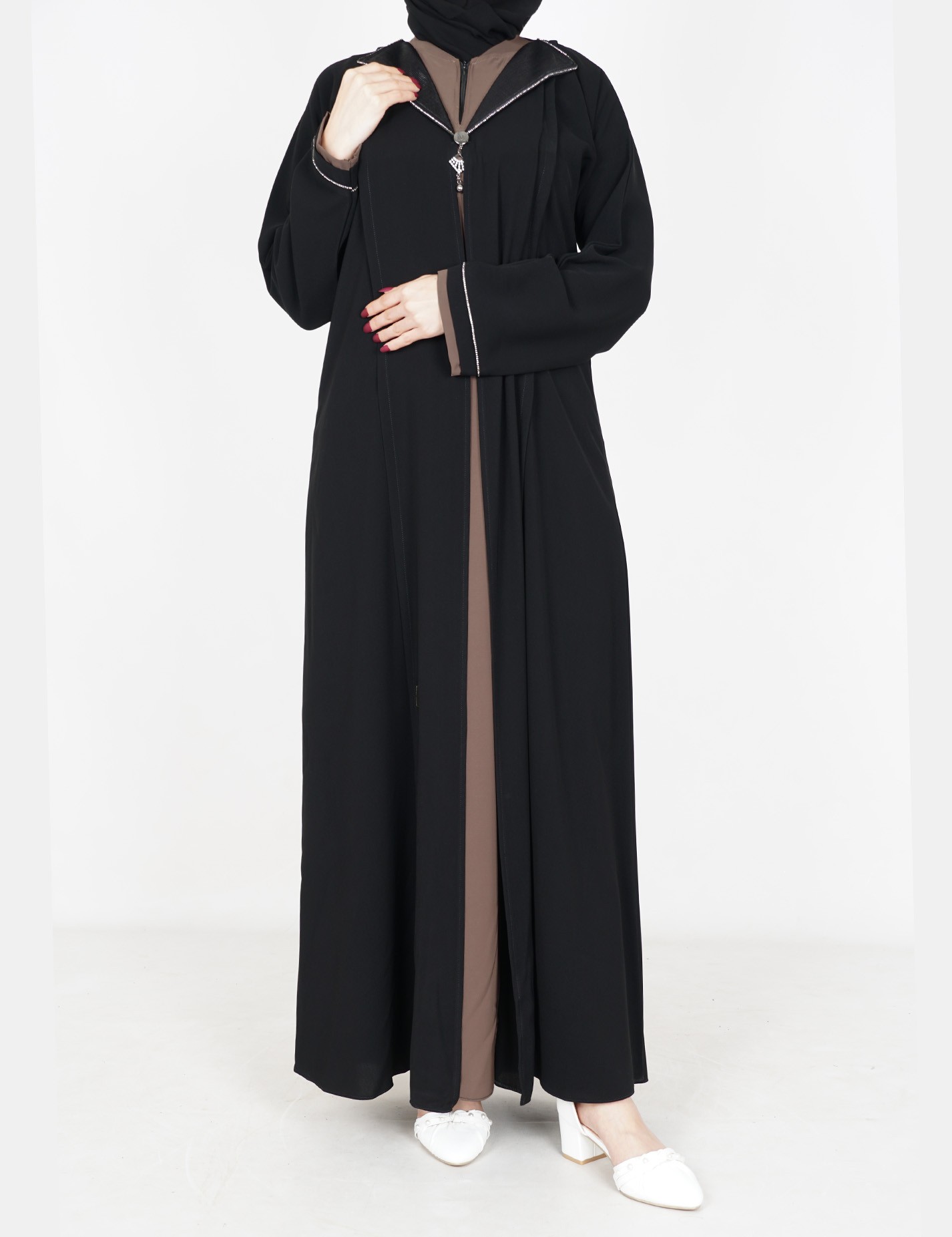 القماش : نصف القمر كوري رقبة سبعة على سحاب بالصدر و من تحت مغلق عباية مفتوح الامام على قماش ملون من تحت على رقبة معطوفه يدات عادية |