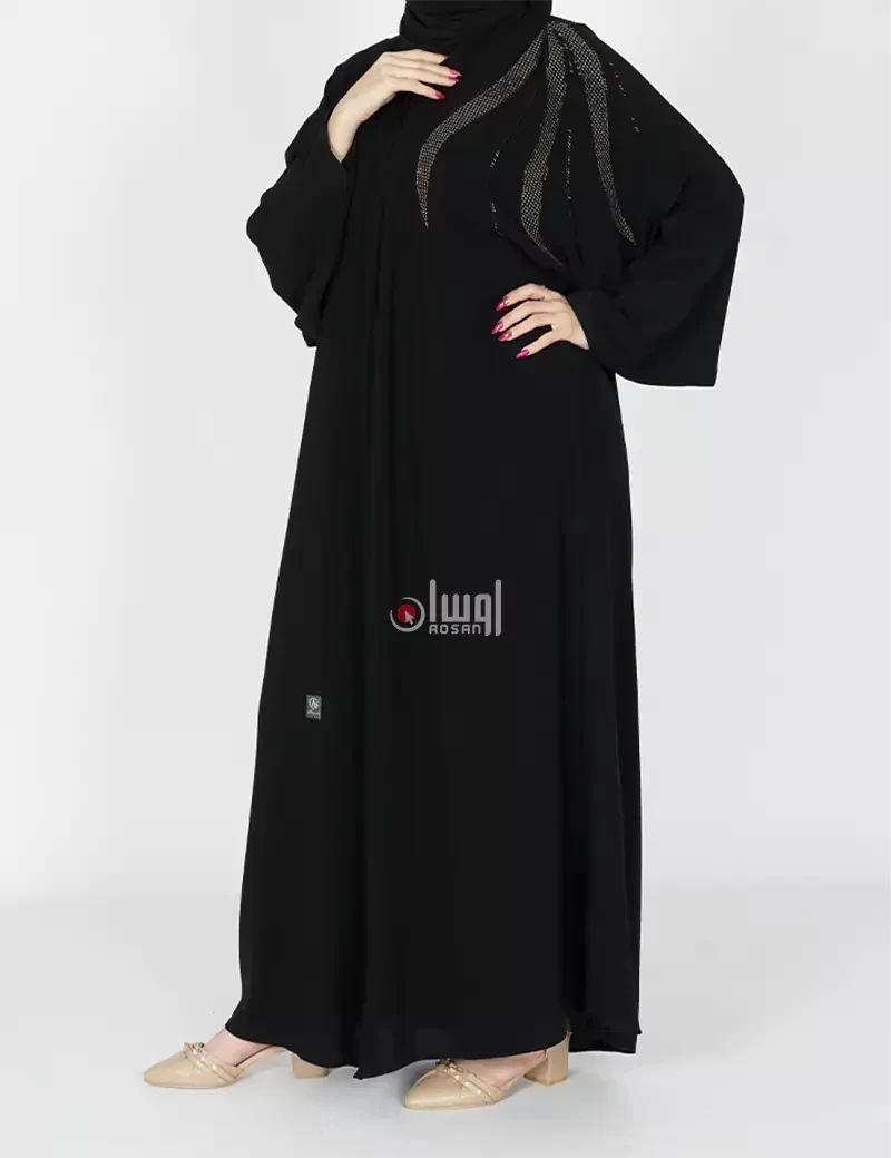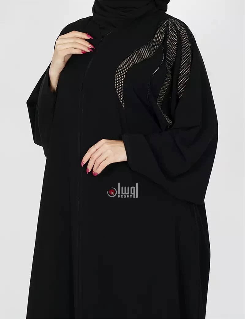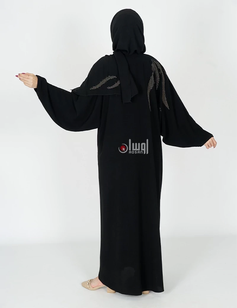القماش : نصف القمركوري رقبة سبعة على زرار بالامام و من تحت مغلق نقشة تطريز بالامام و الظهر يدت عادية |