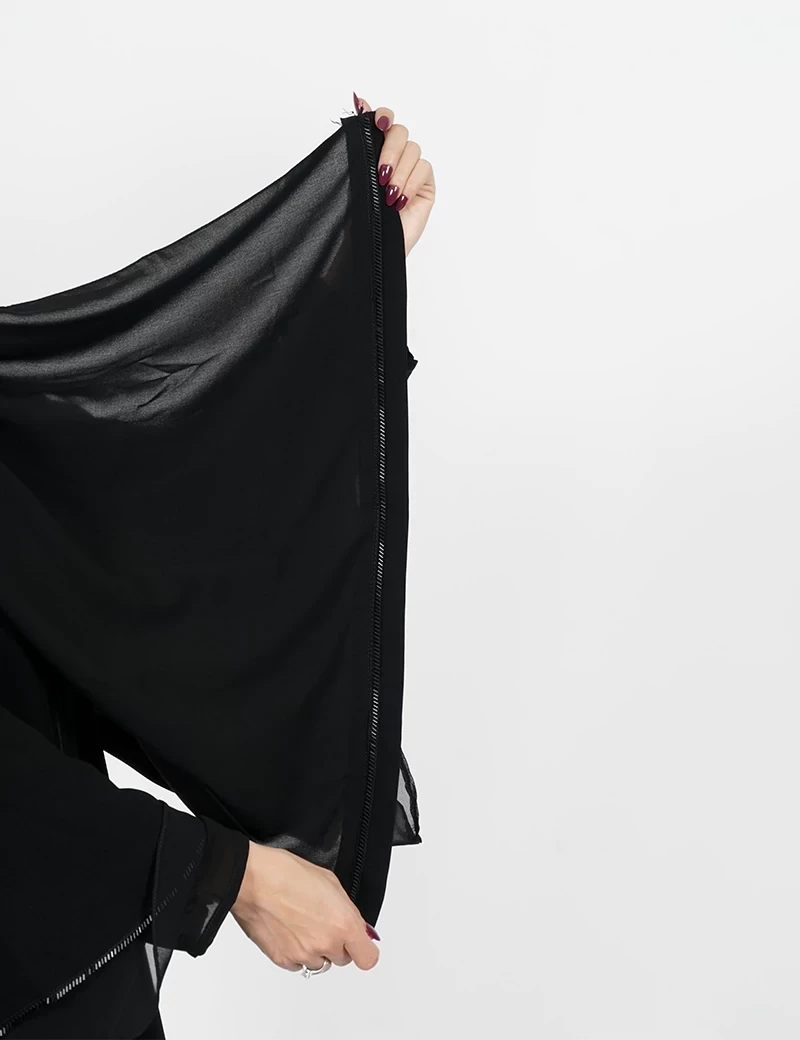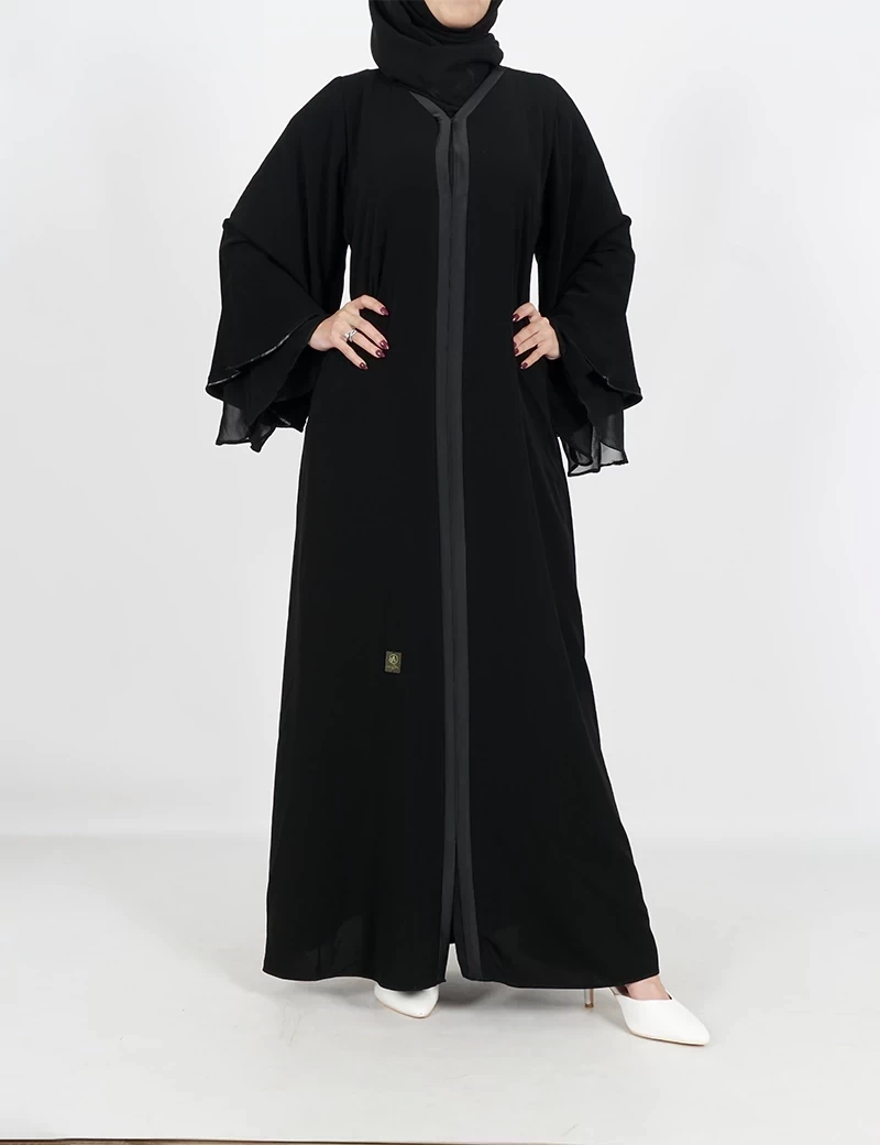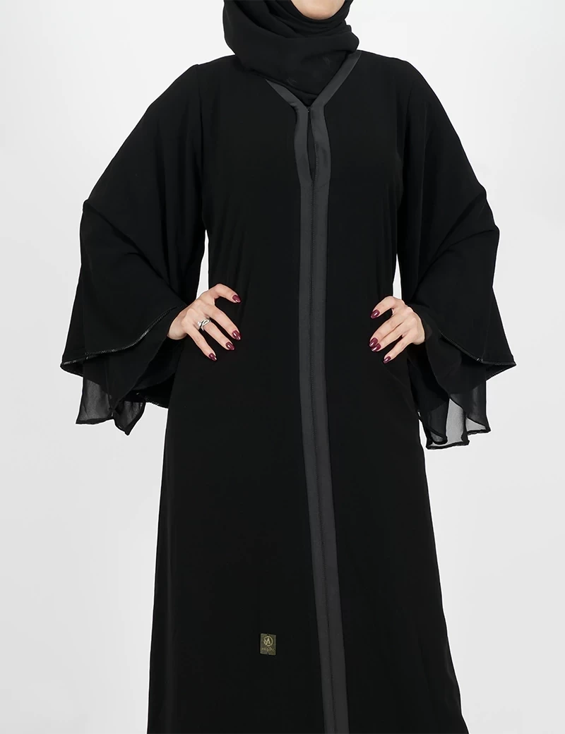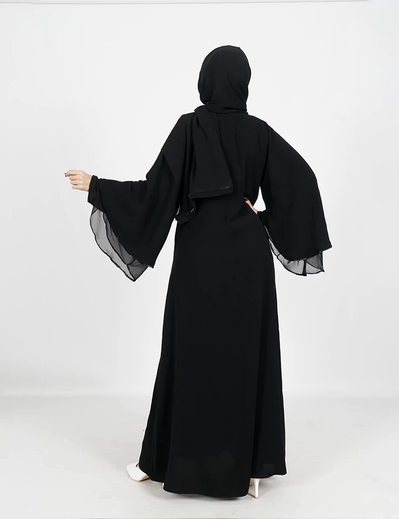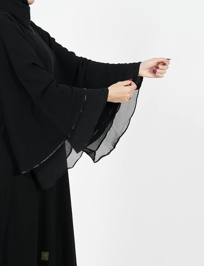 فوقها طبقة تل وأكمام مفتوحة مطرزة بخرز أسود، وخط من الأمام, عباية أنيقة وراقية.