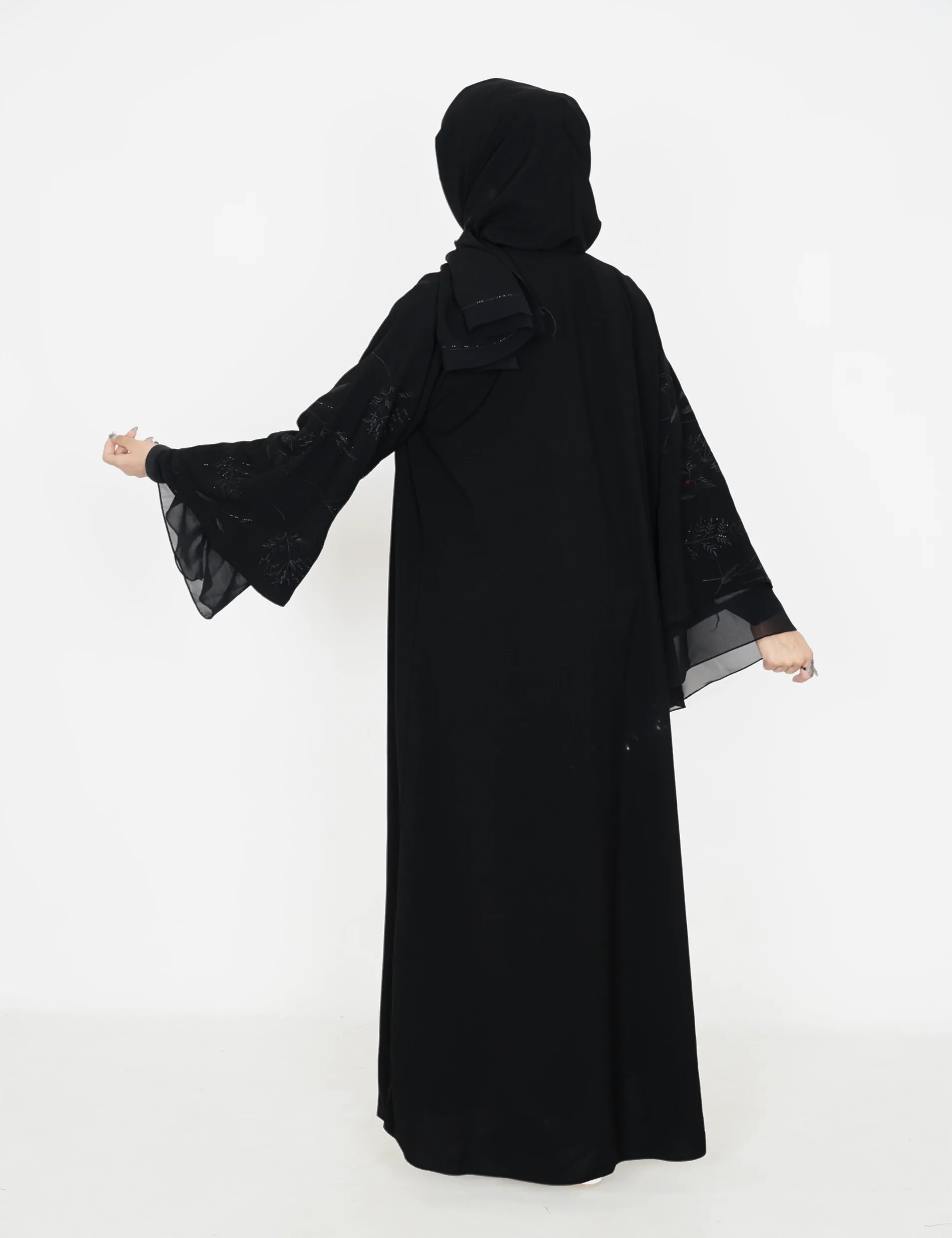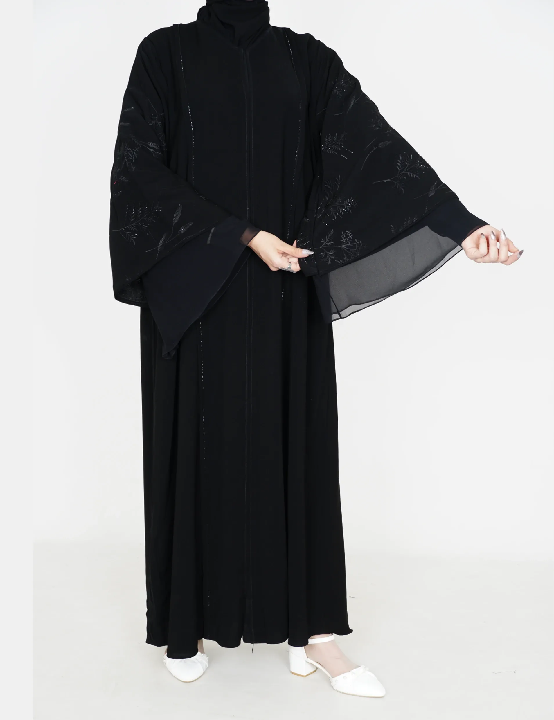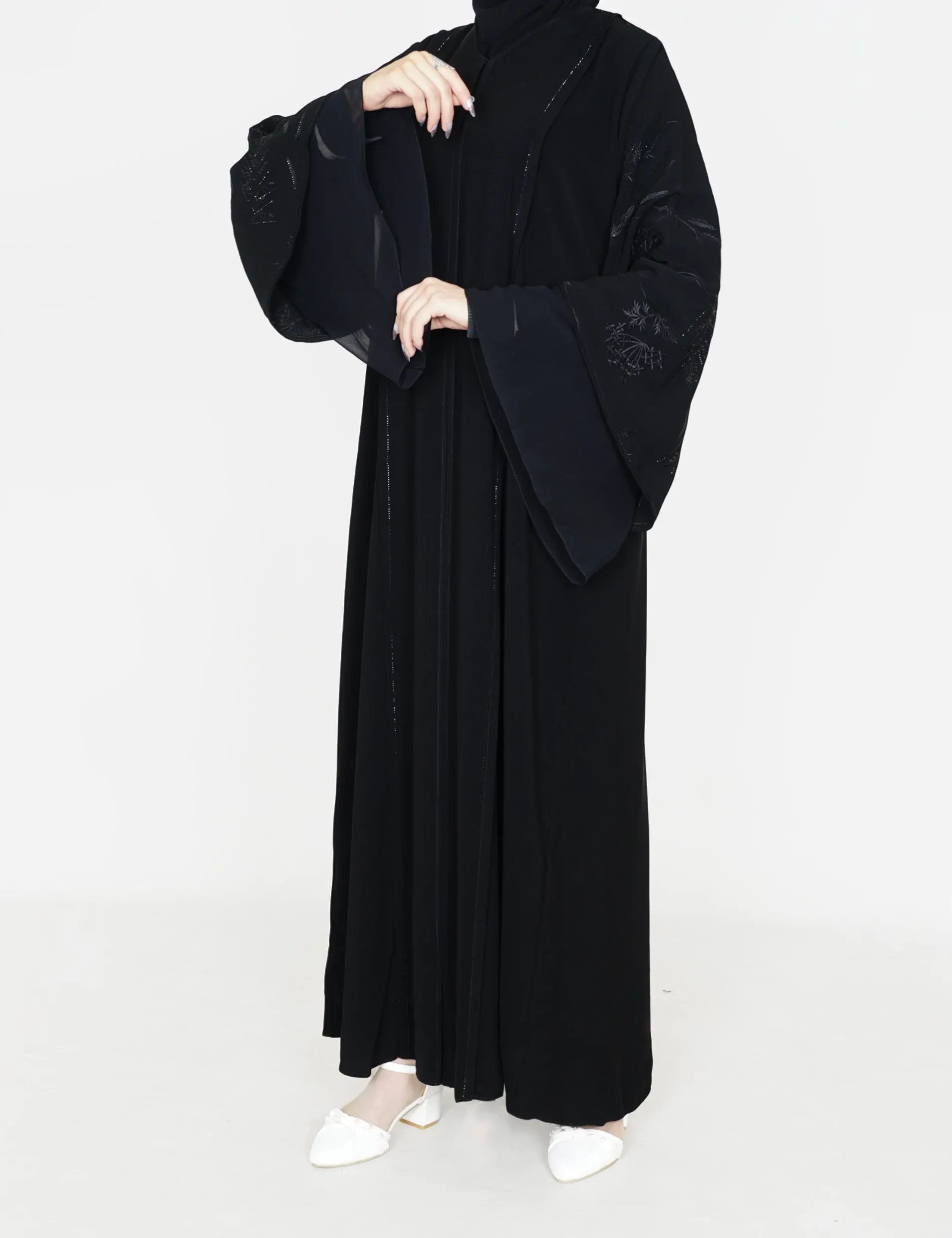 القماش : نصف القمر كوريرقبة سبعة على زرار بالامام ومن تحت مغلقفصوص بالامامتطريز وفصوص بي اليداتاليدات : طبقتين طبقة نص القمر مدخل بقماش شيفون |