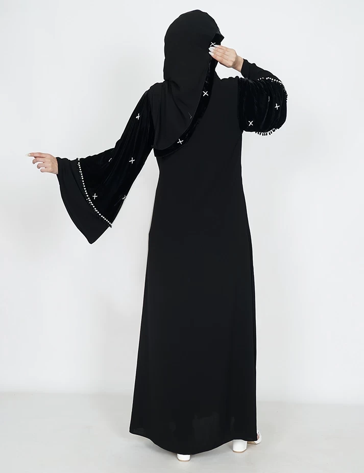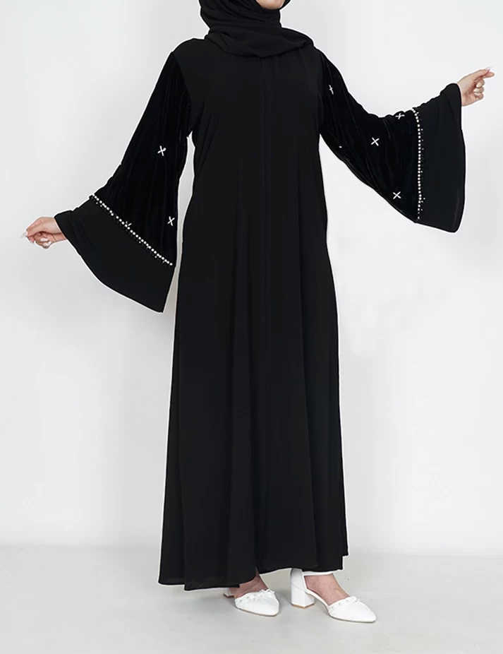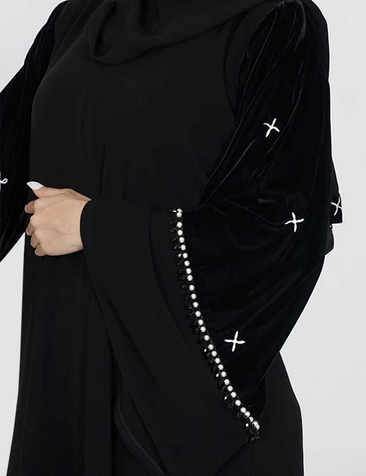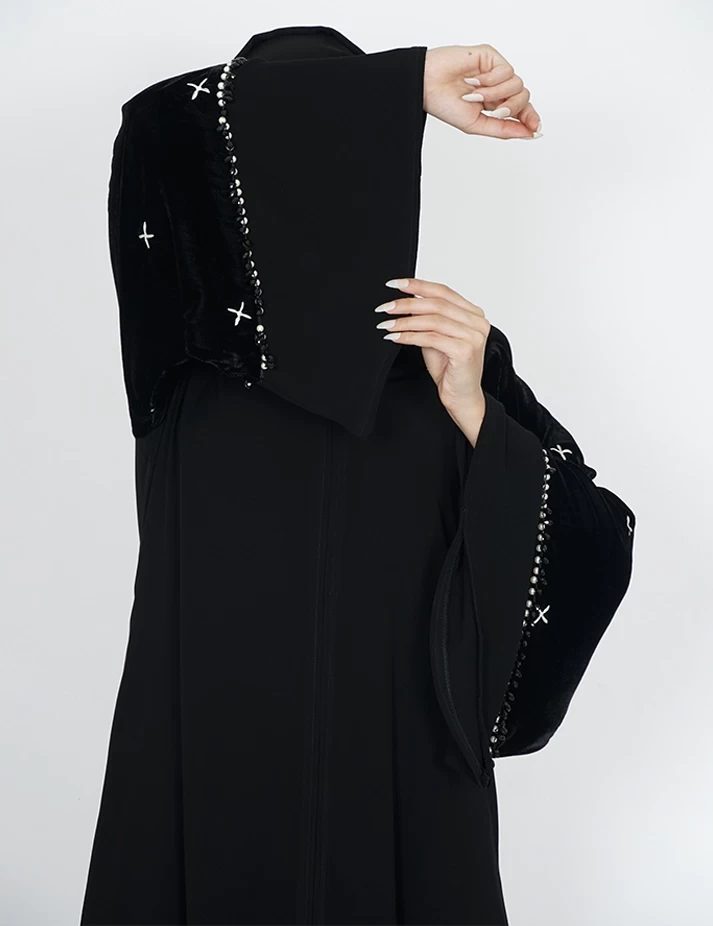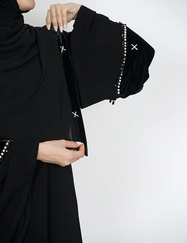القماش : نصف القمر كوري رقبة سبعة على زرار بالامام و من تحت مغلق يدات عريضه على زرارت على قطيفة و خرز باليدات |
