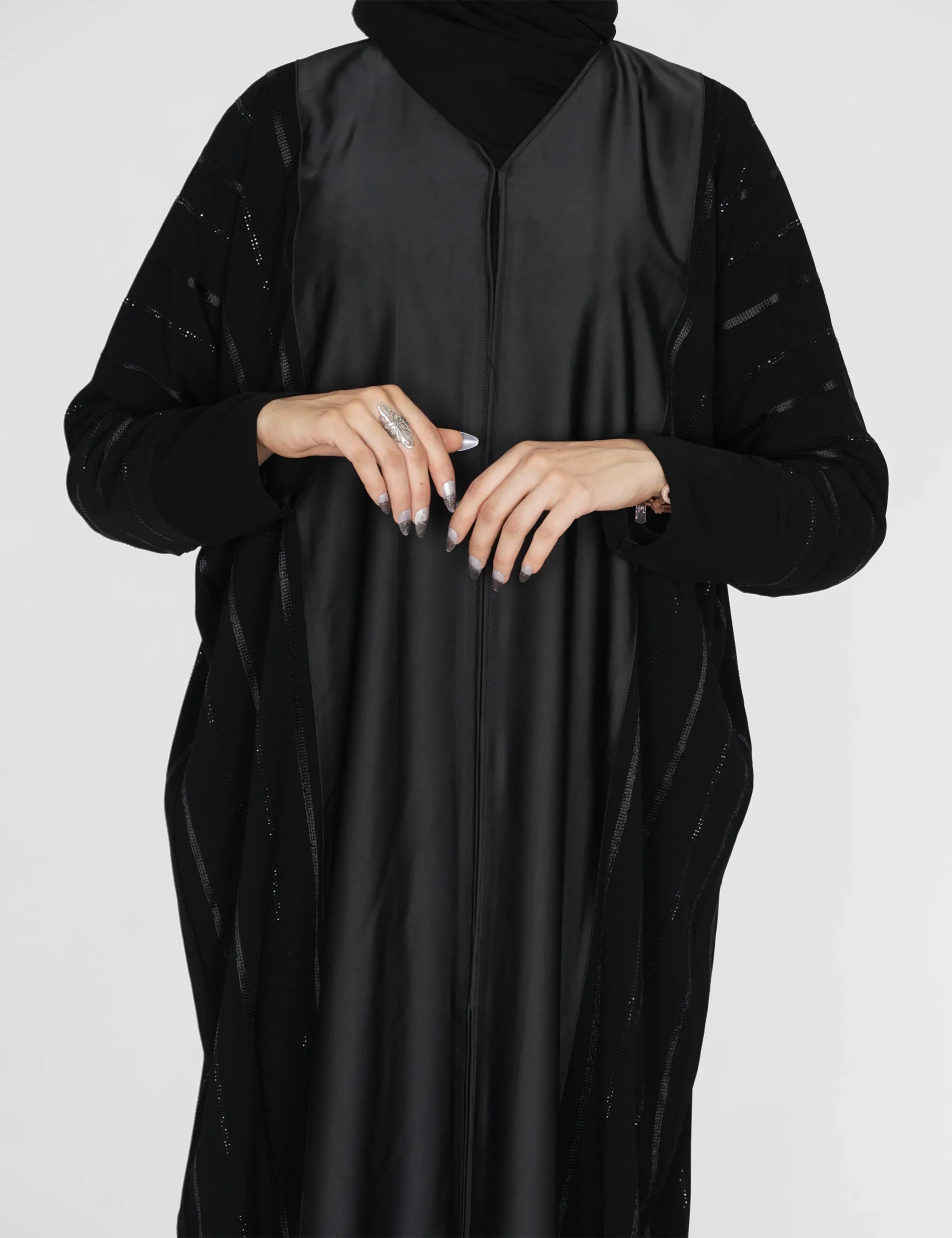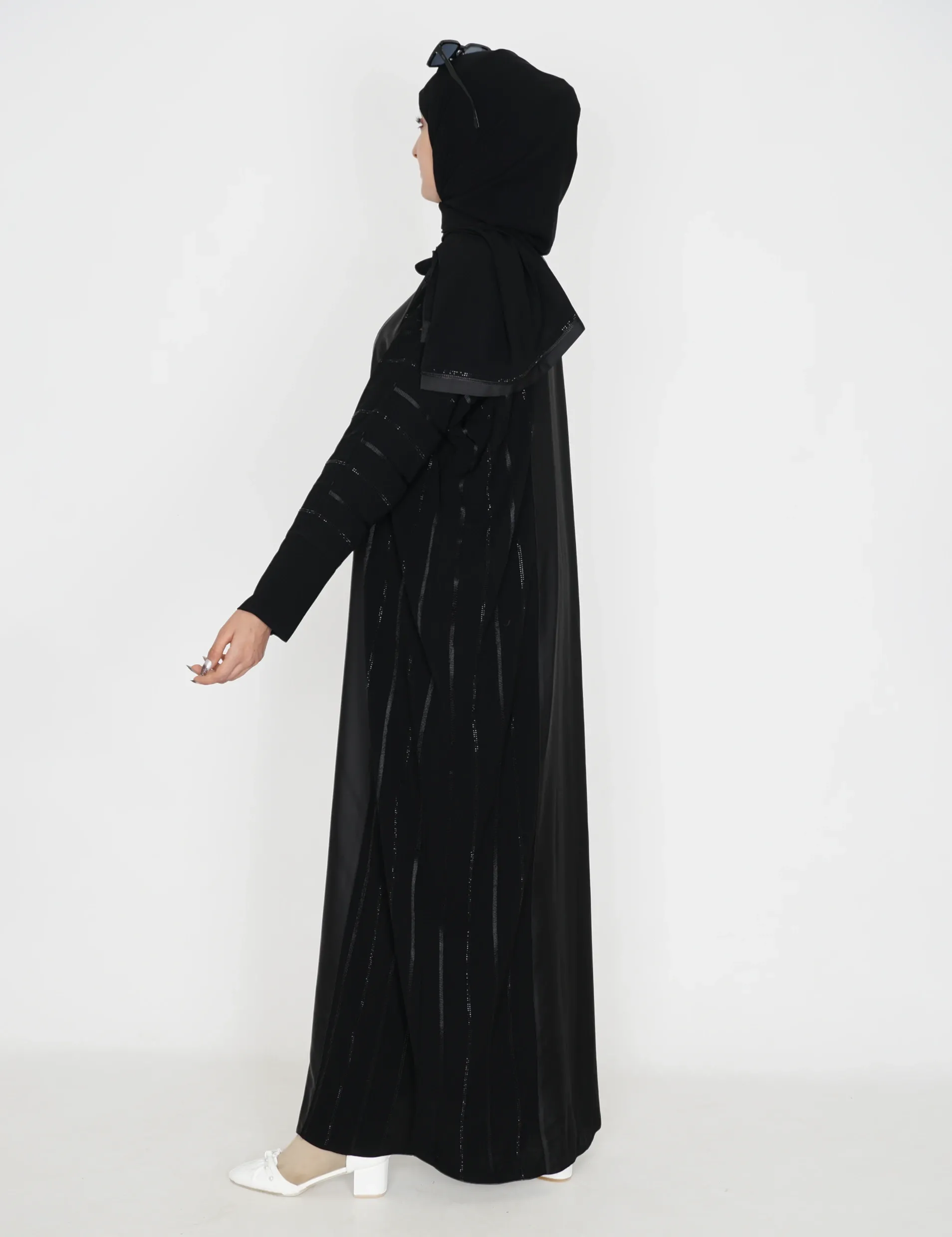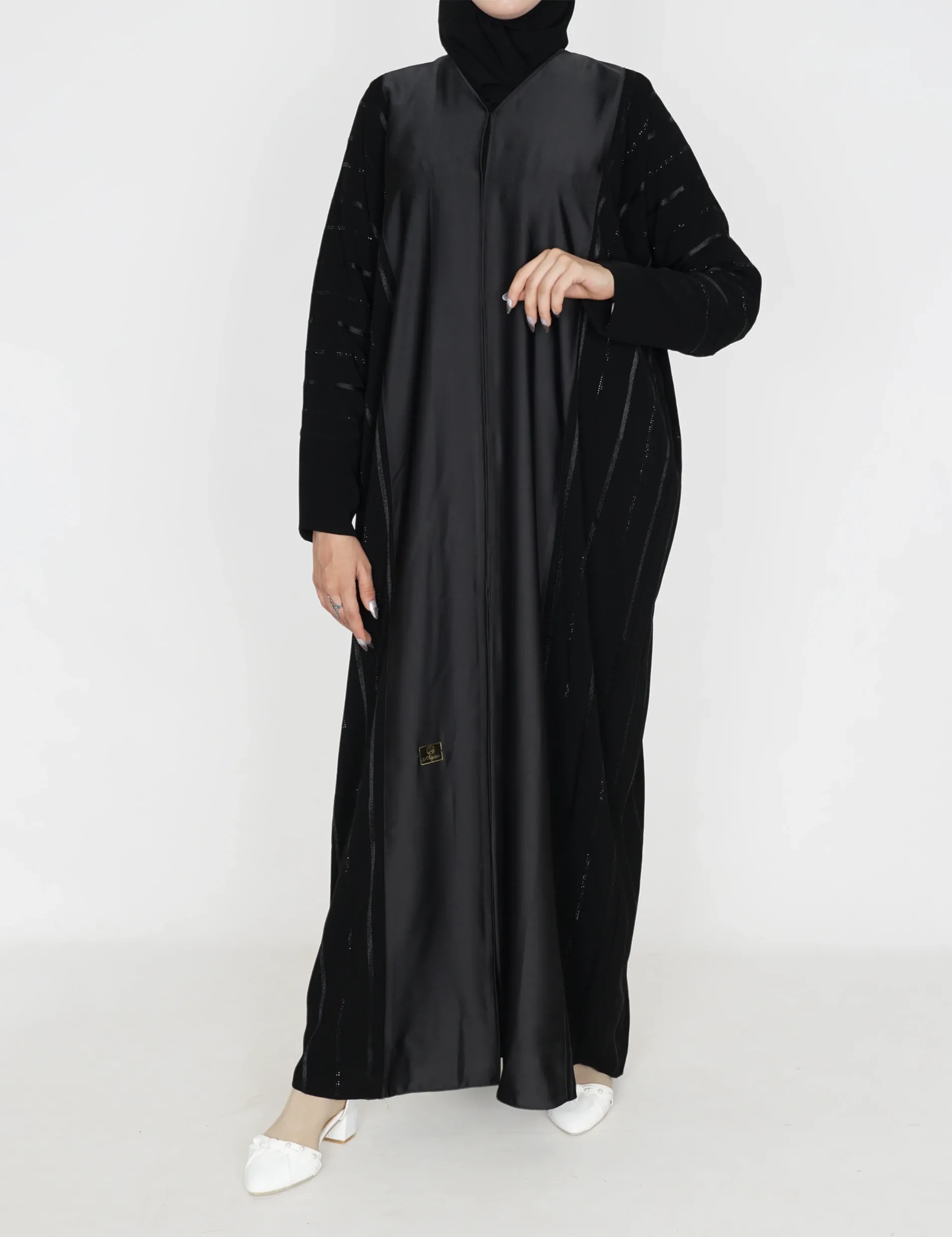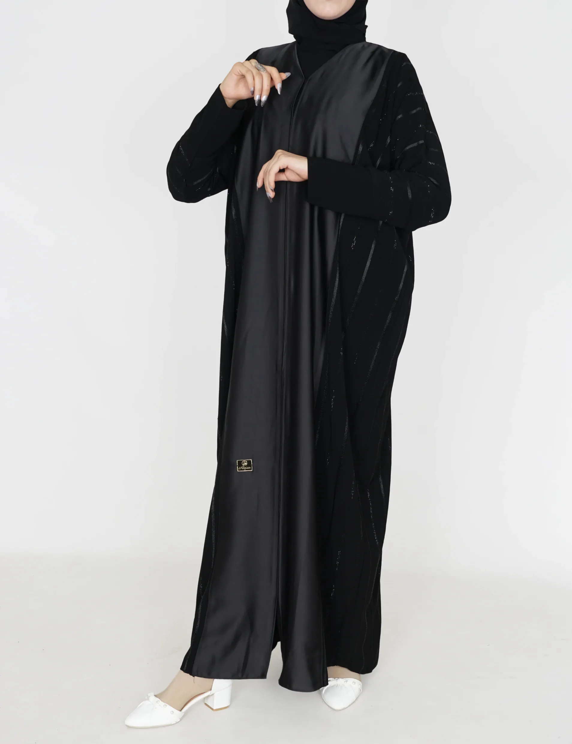 القماش : نصف القمر كوري + حريررقبة سبعة على زرار ومن تحت مغلققيطان وفصوص بالامام والخلف واليداتيدات عادية |