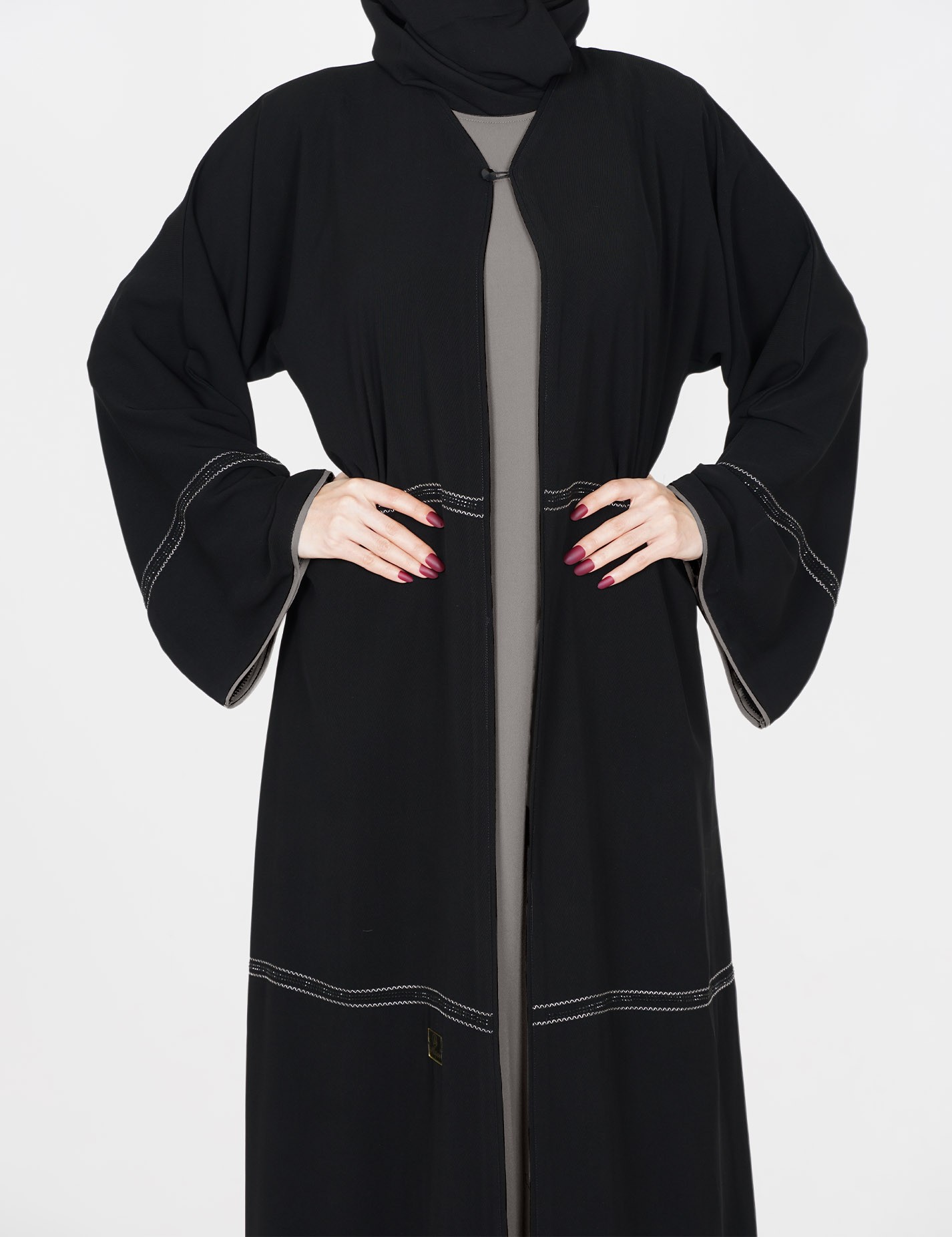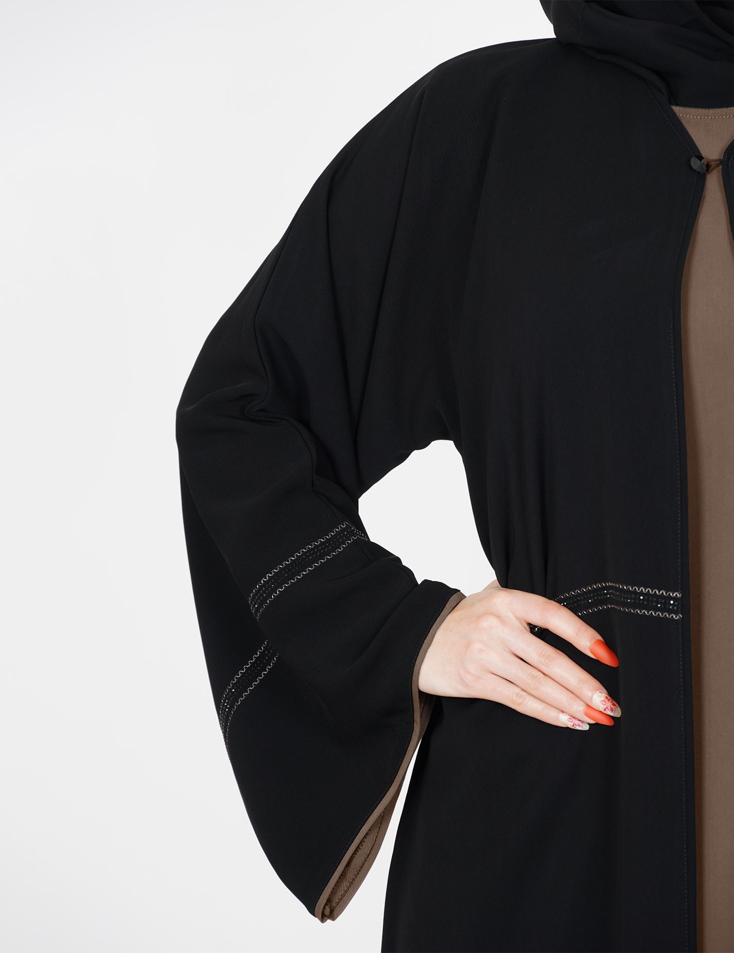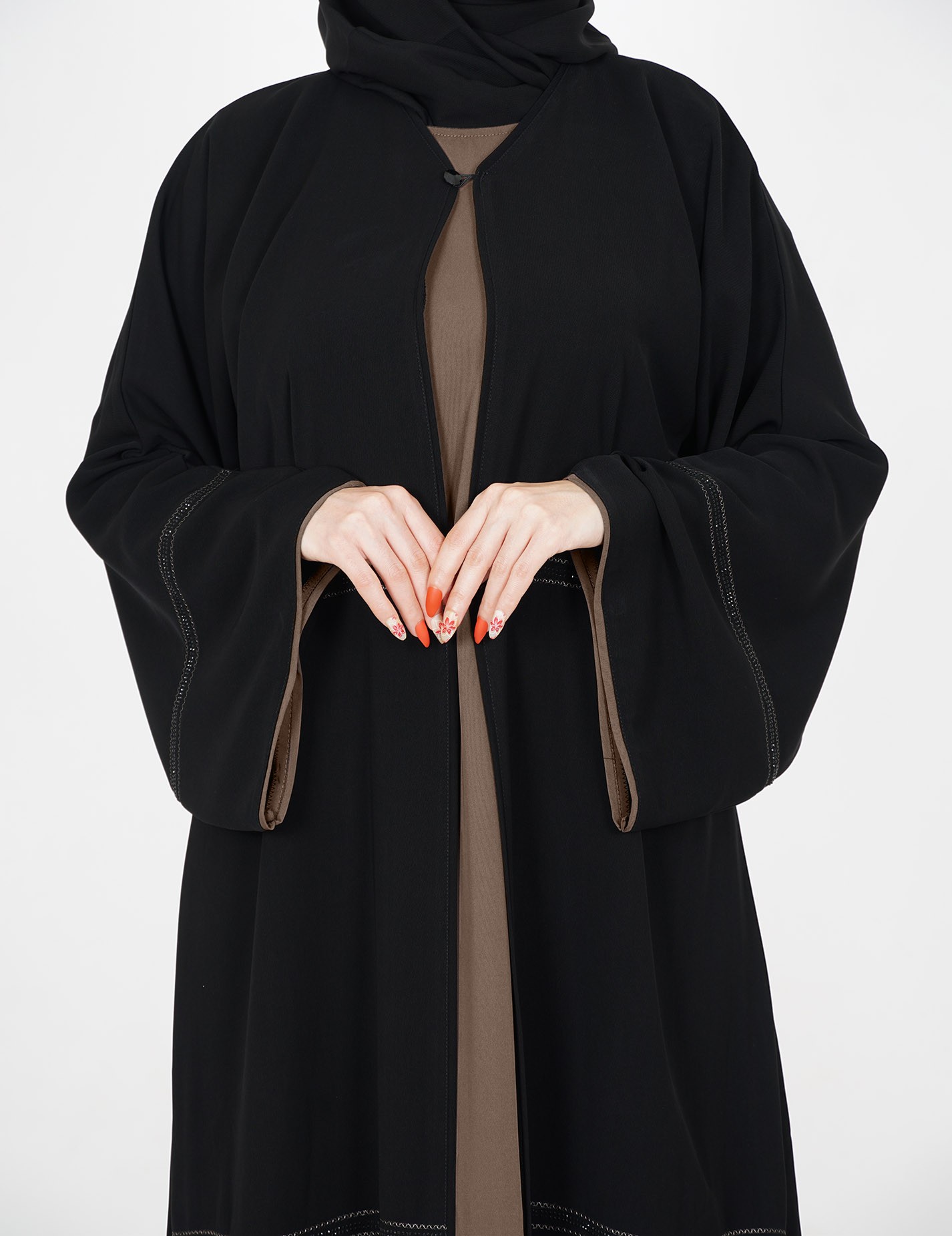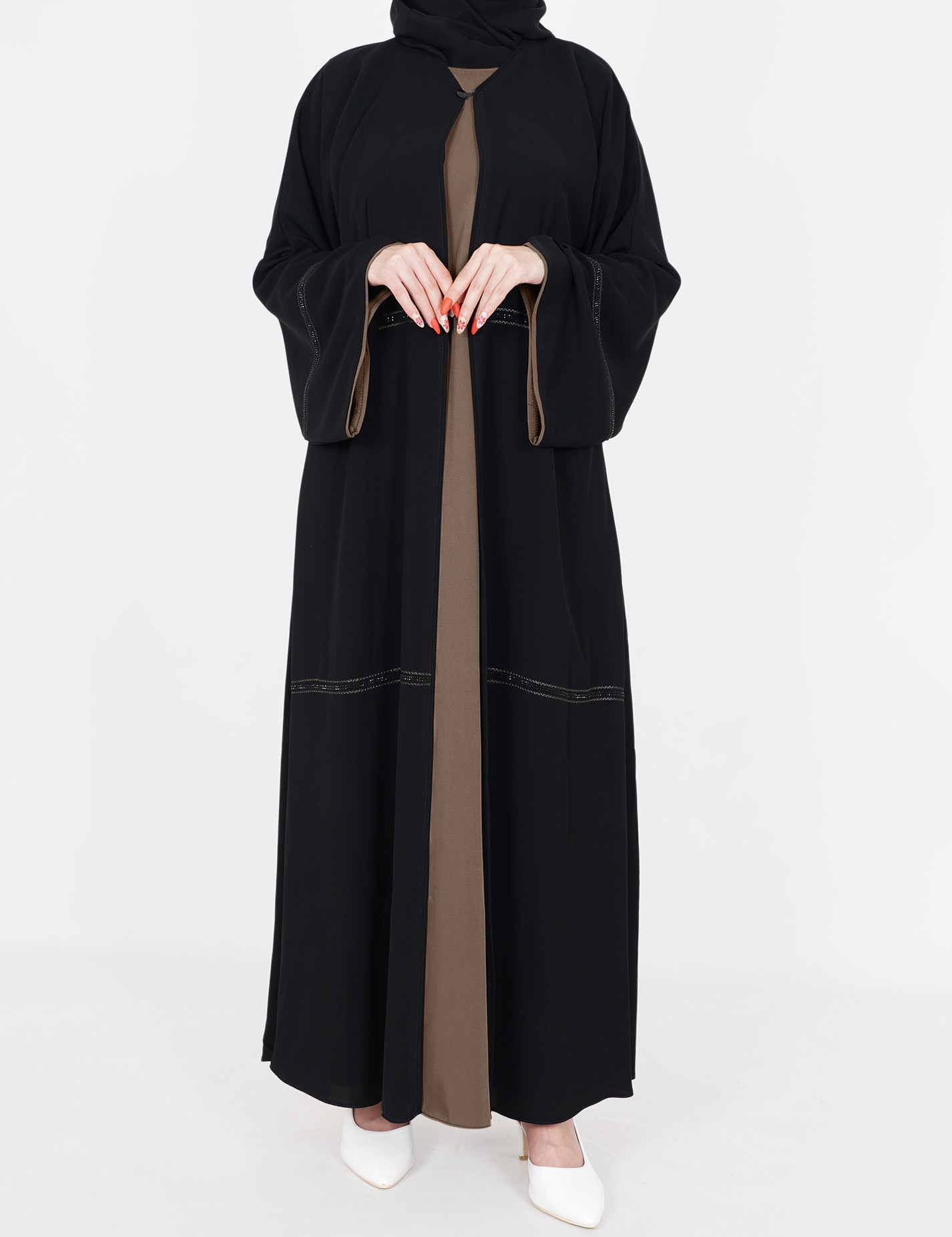 القماش : نصف القمر كوريرقبة سبعة على زرار مفتوح الامام على بطانه ملون + طرحةعلى قيطان و فصوص بالاماميدات عريضة على زرار |