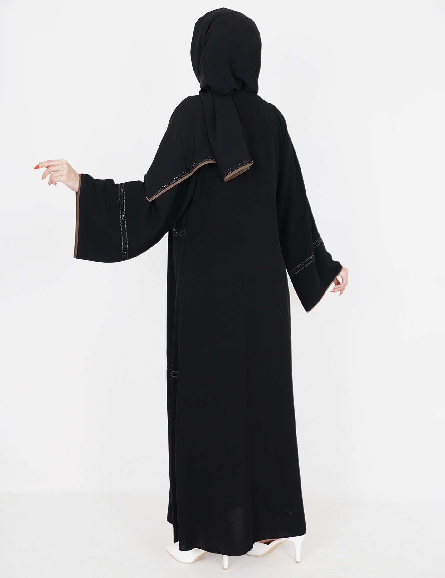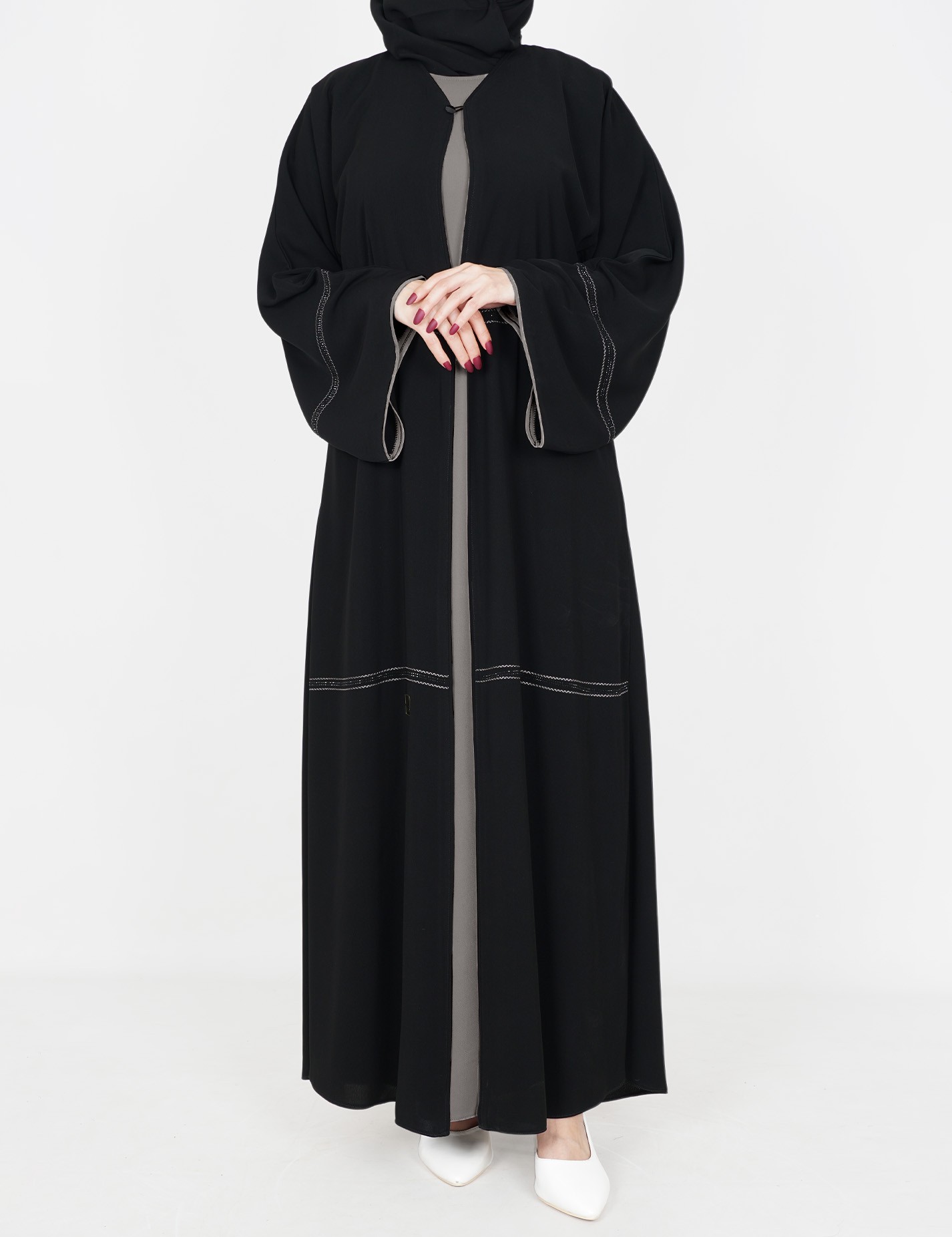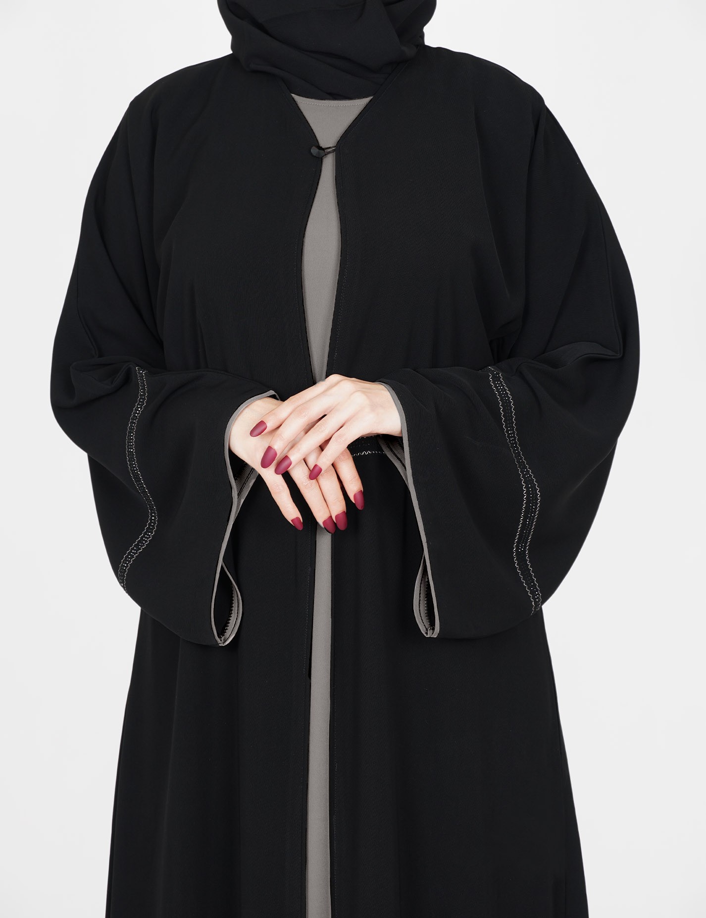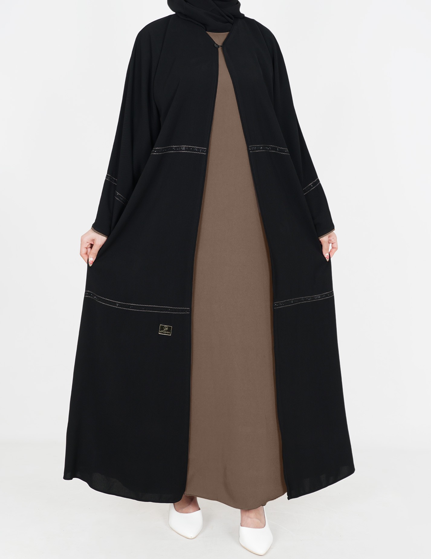 القماش : نصف القمر كوريرقبة سبعة على زرار مفتوح الامام على بطانه ملون + طرحةعلى قيطان و فصوص بالاماميدات عريضة على زرار |