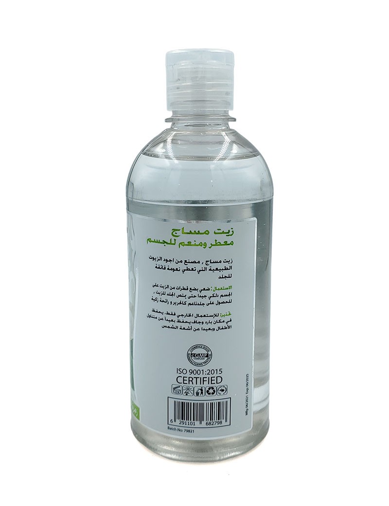 زيت مساج معطر ومنعم للجسم ٥٠٠ مل زيت مساج مصنوع من آفضل وأجود الزيوت الطبيعية التي تعطي نعومة فائقة للجلد. طريقة الاستعمال: ضعي بضع قطرات من الزيت على الجسم دلكي جيدا حتى يمتص الجلد للزيت، للحصول على جلد ناعم كالحرير ورائحة زكية. تحذير: للاستعمال الخارجي فقط. يحفظ في مكان بارد وجاف بعيدا عن متناول الأطفال وبعيدا عن اشعة الشمس |