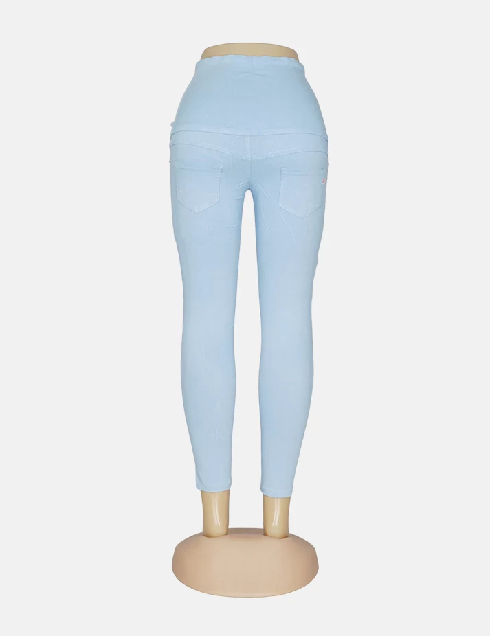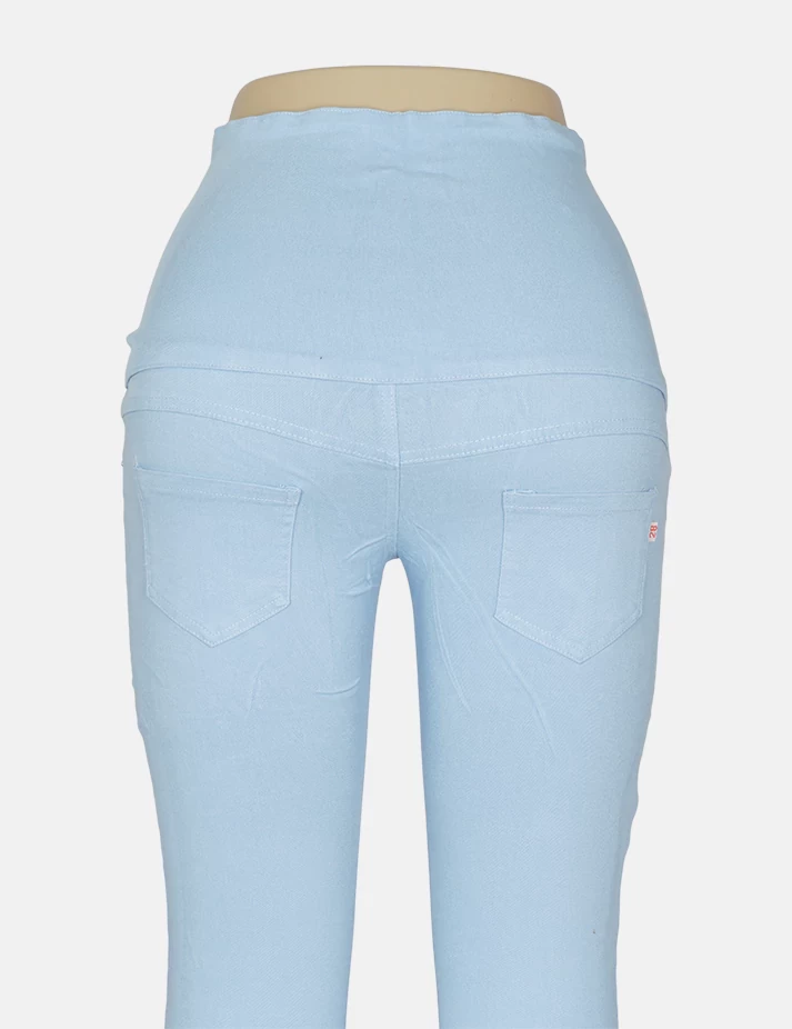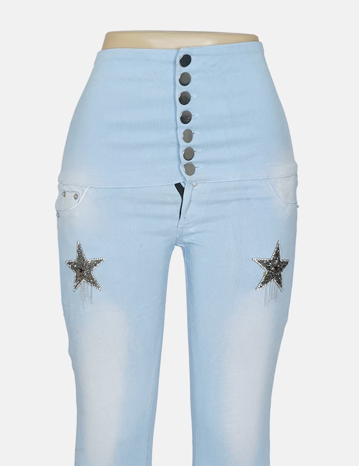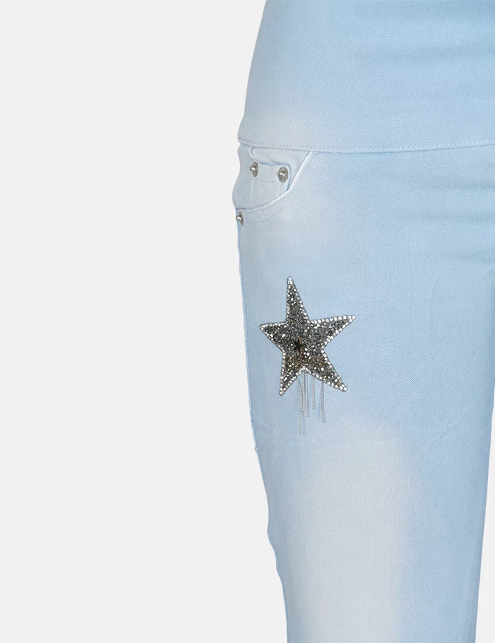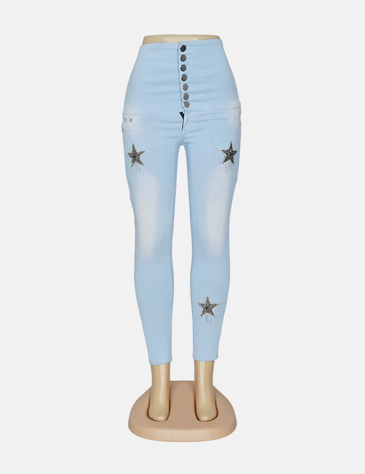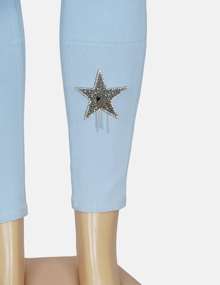 بنطلون جنز فاتح ضيق على زرارات على طبعة نجوم على الساق والفخذ. |