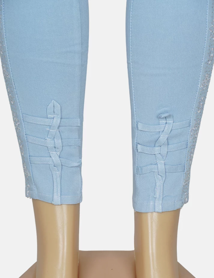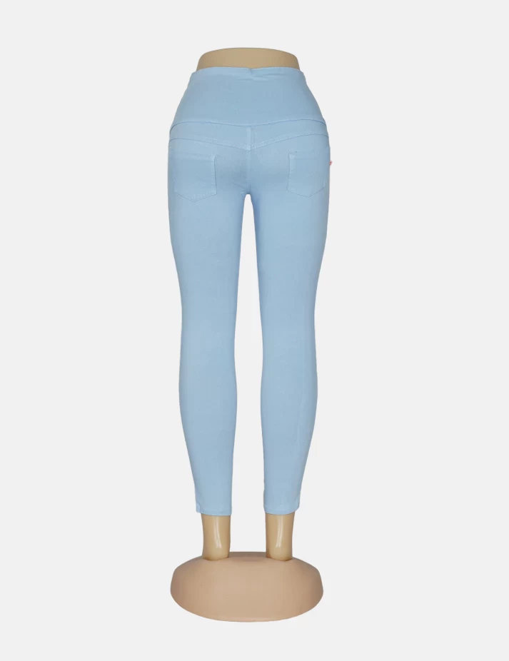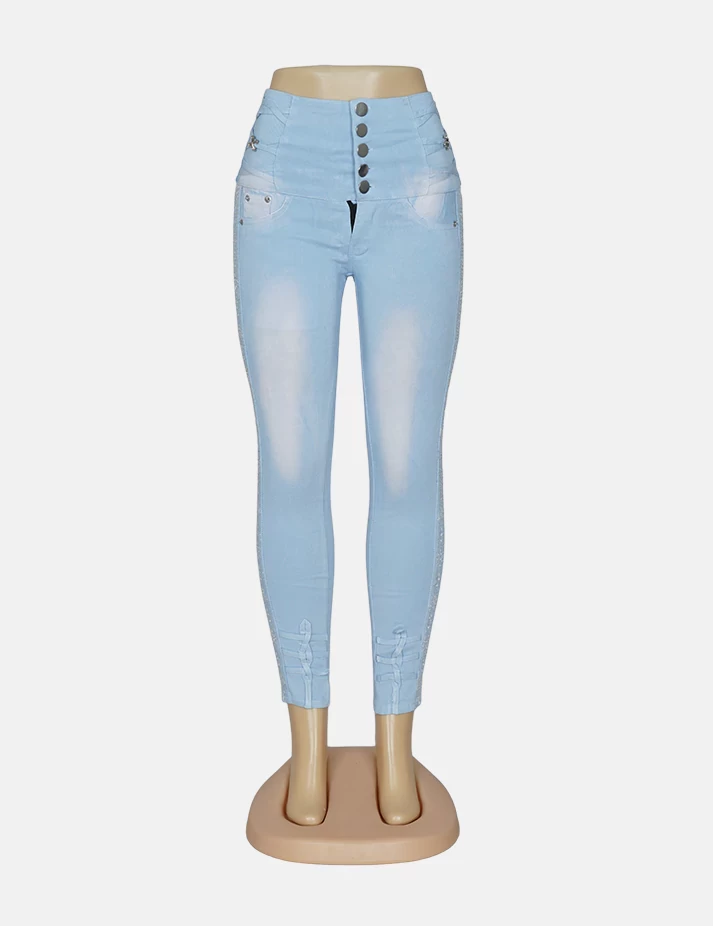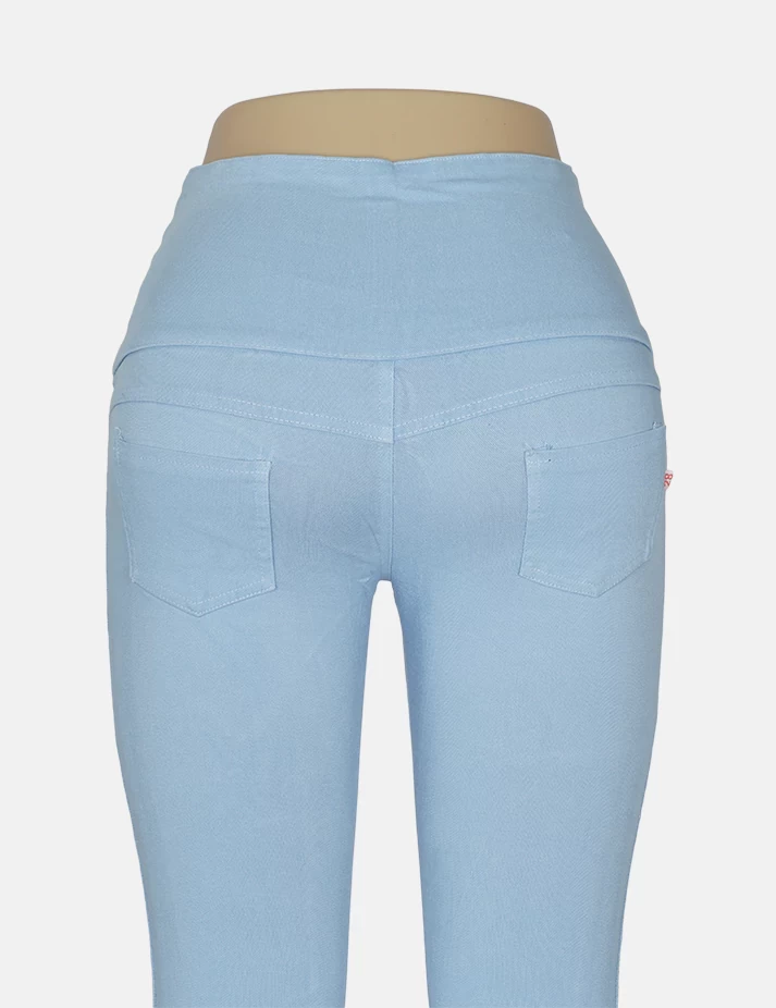 بنطلون جنز فاتح ضيق، على زرارات من الخصر يبين تقاسيم الجسم قماش عملي ومريح. |