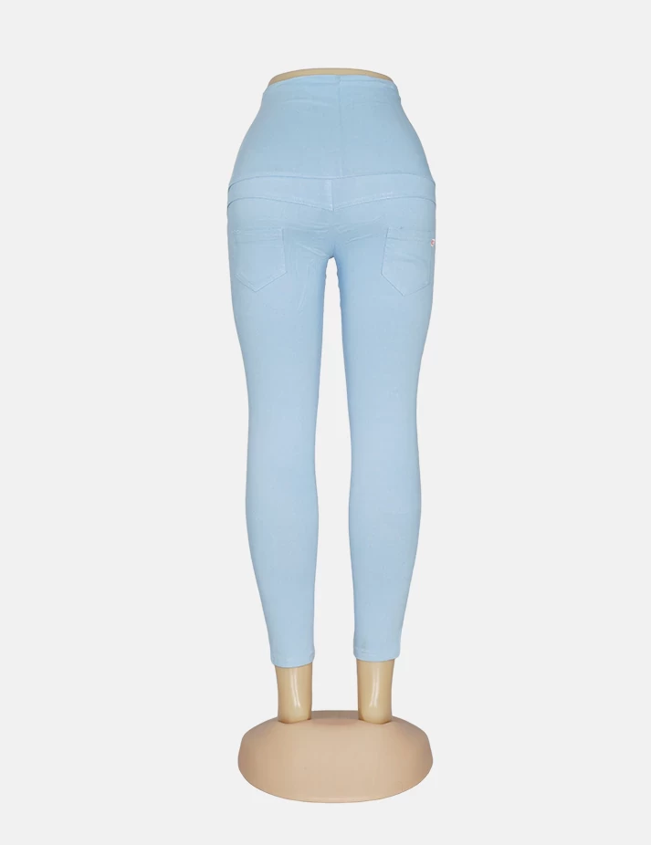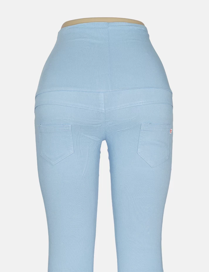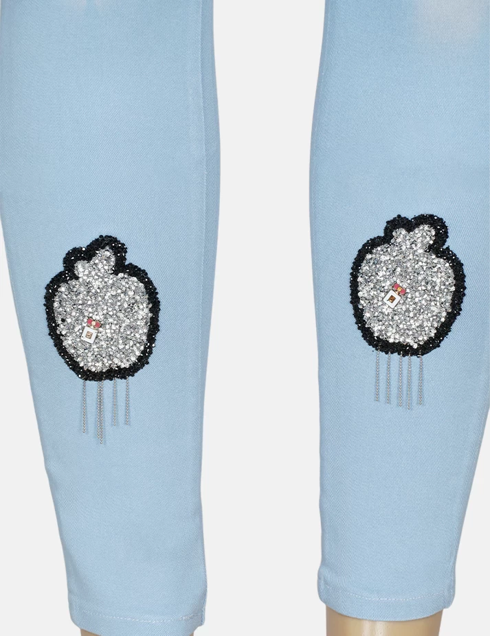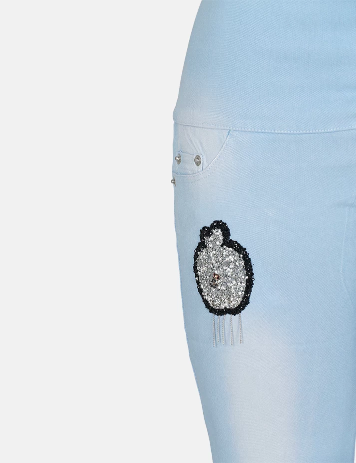 بنطلون جنز فاتح على تدرجات لونية على الفخذ والساق وطبعة على الساقين والفخذ من الجنب وزرارات على الخصر. |