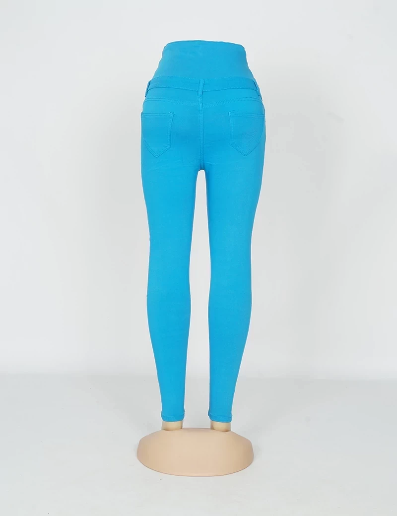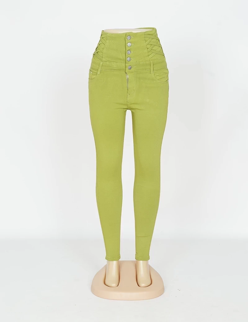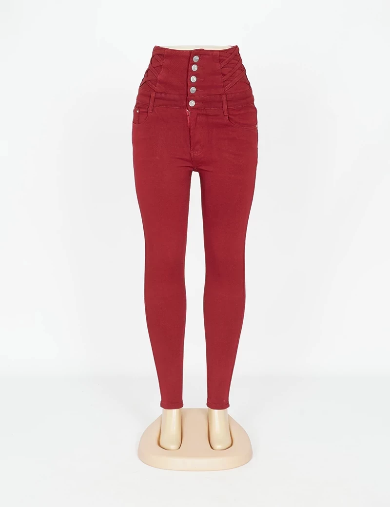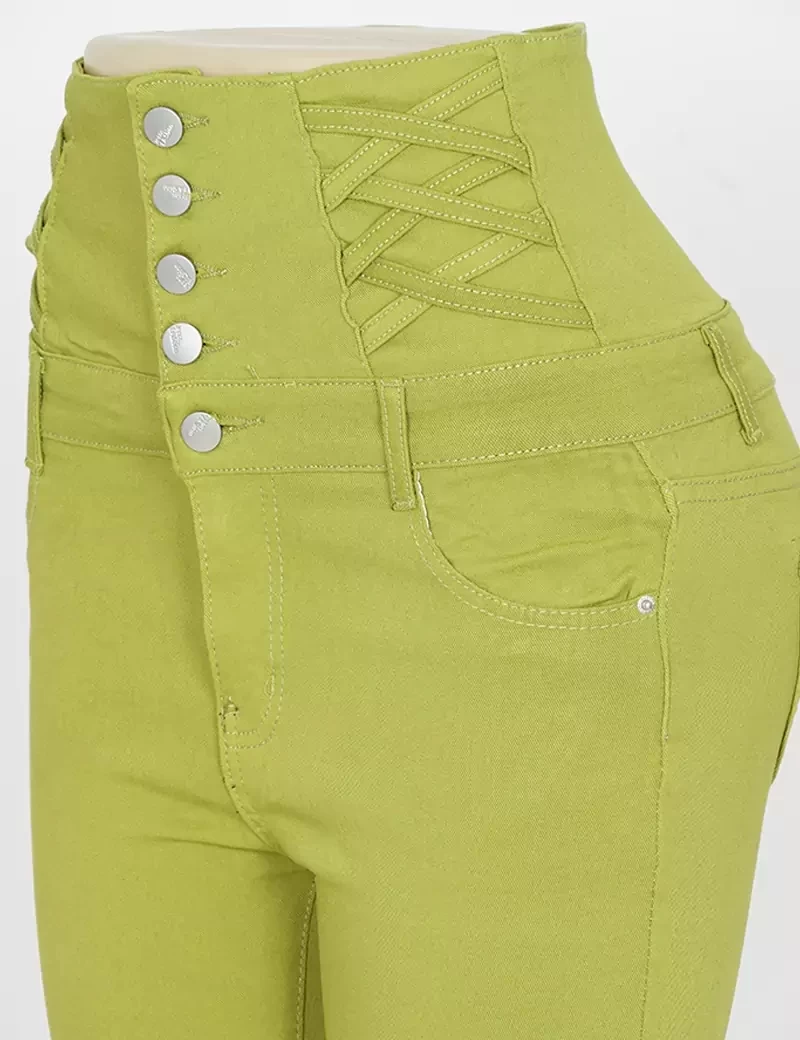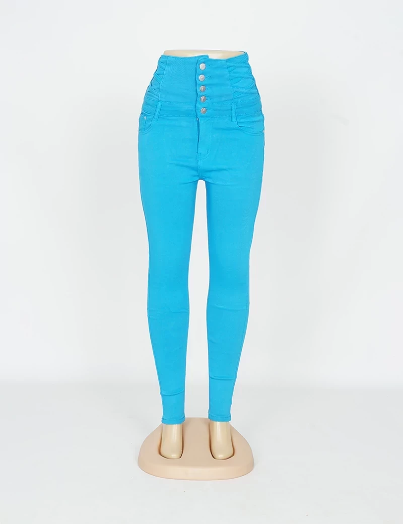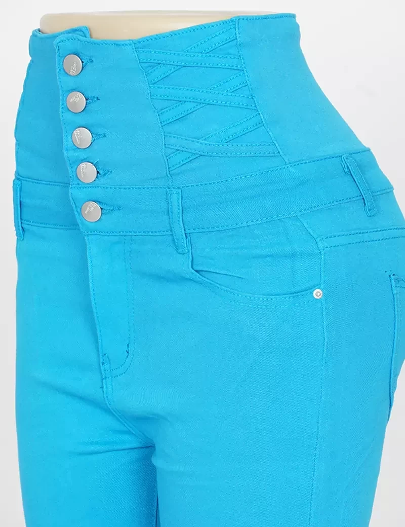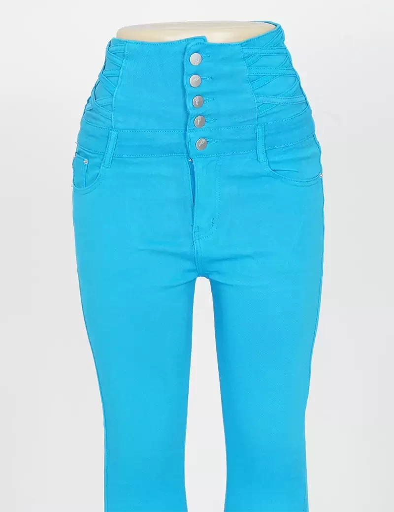 بنطلون جنز ملون بألوان عديدة ومغرية ضيق على زرارات من الأمام على الخصر. |
