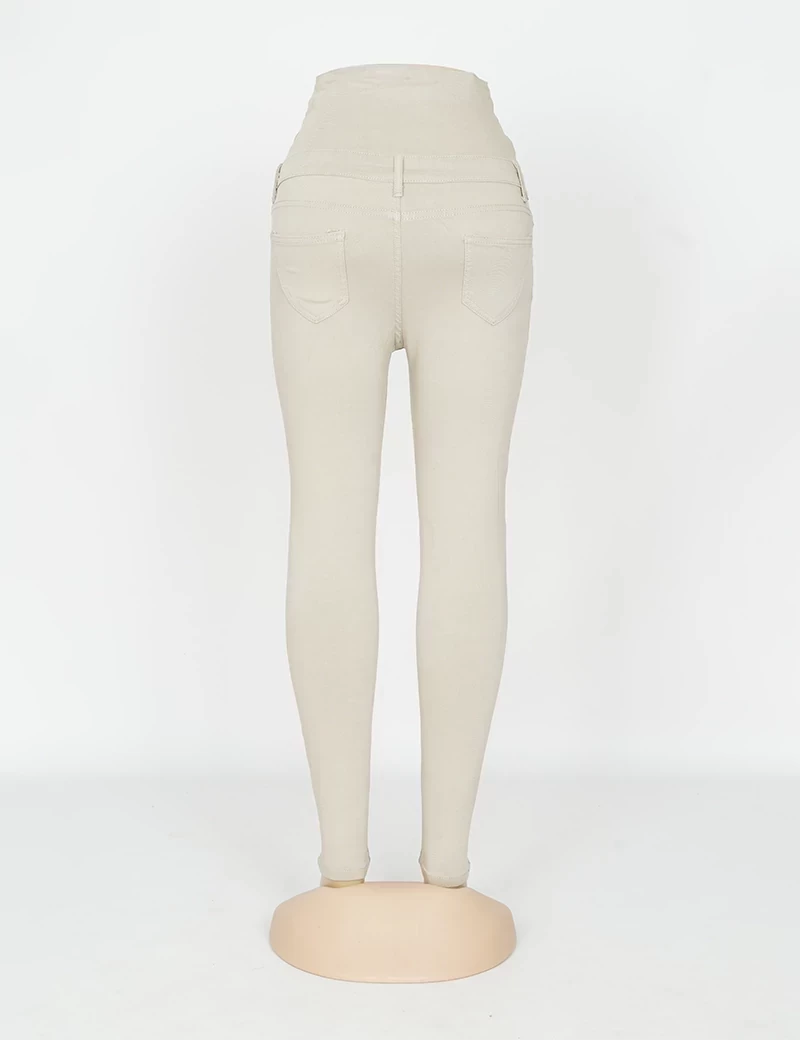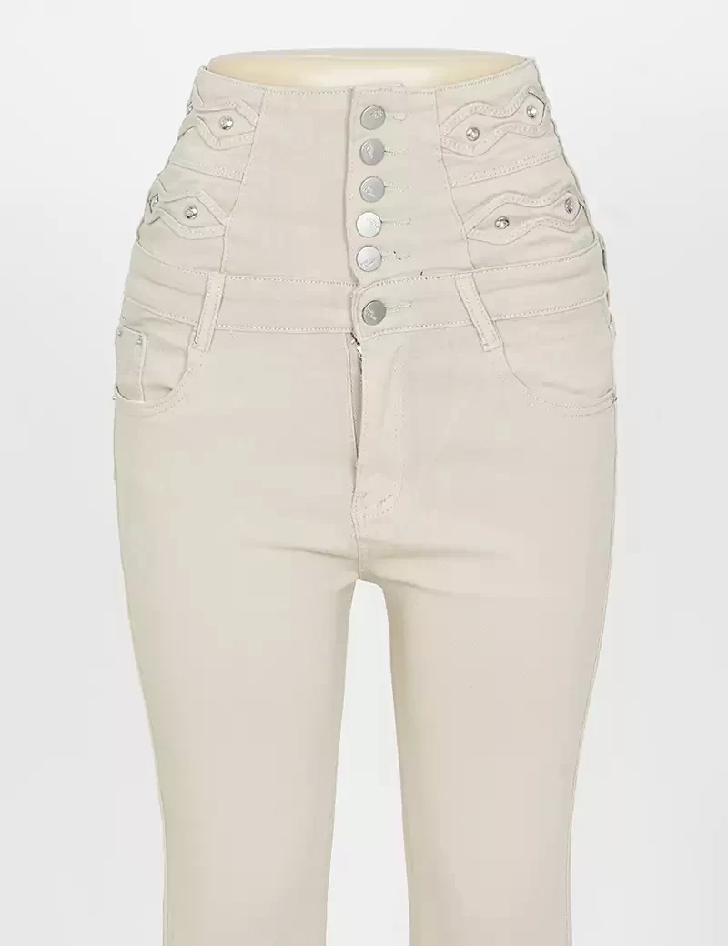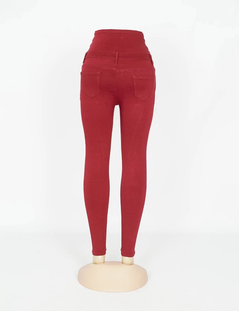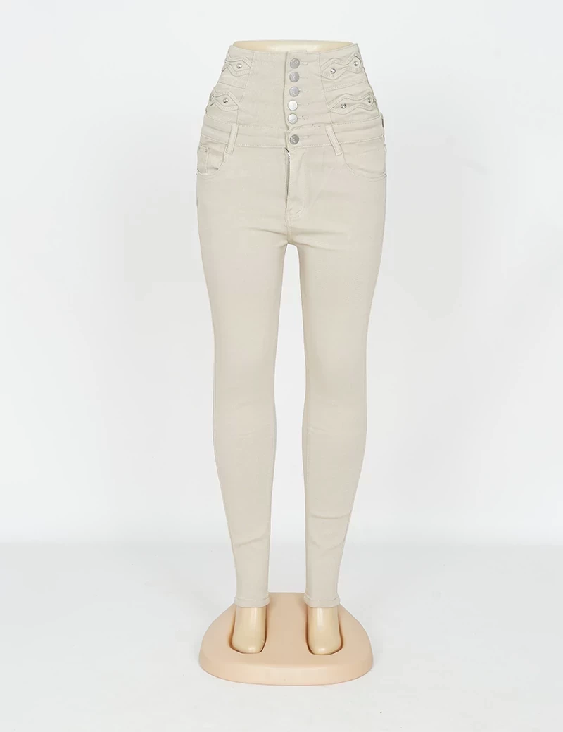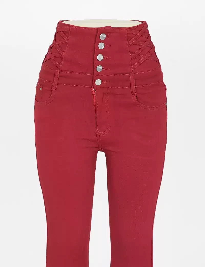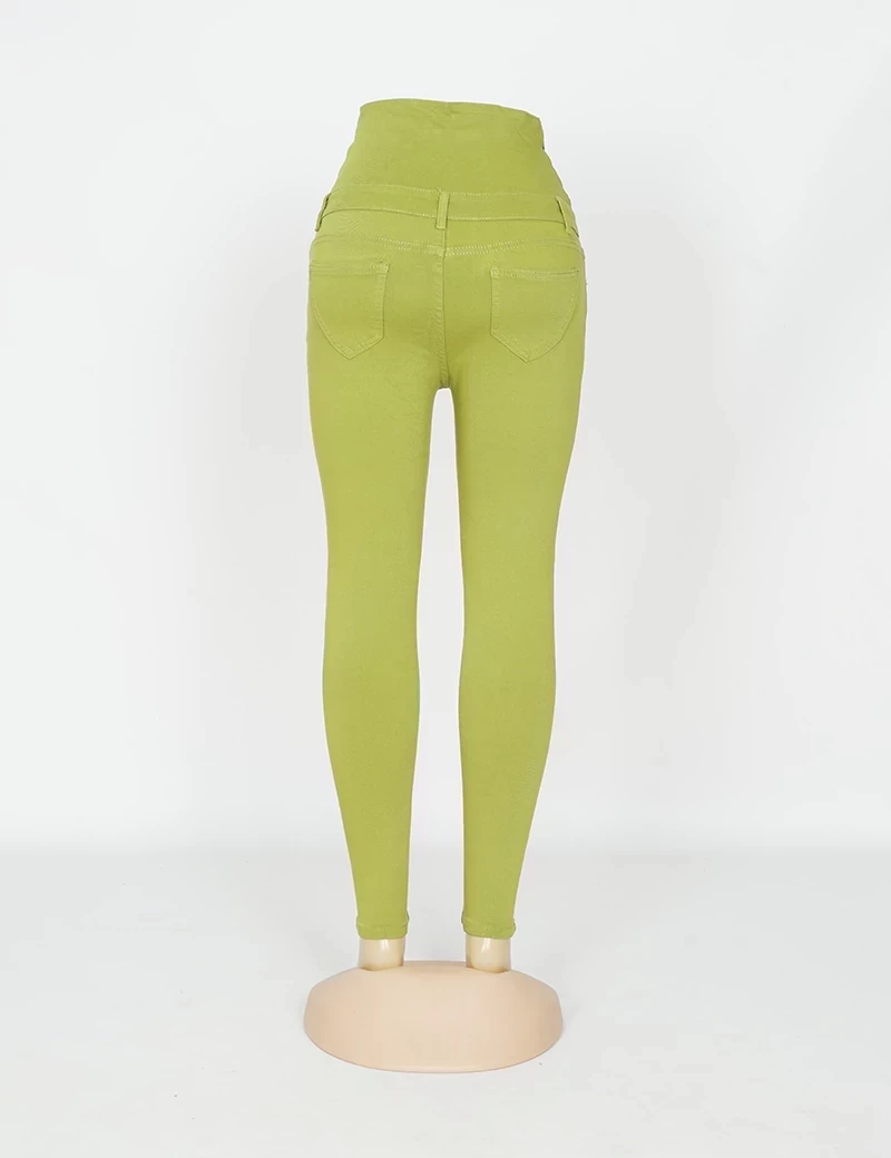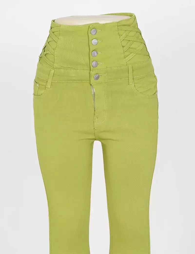 بنطلون جنز ملون بألوان عديدة ومغرية ضيق على زرارات من الأمام على الخصر. |