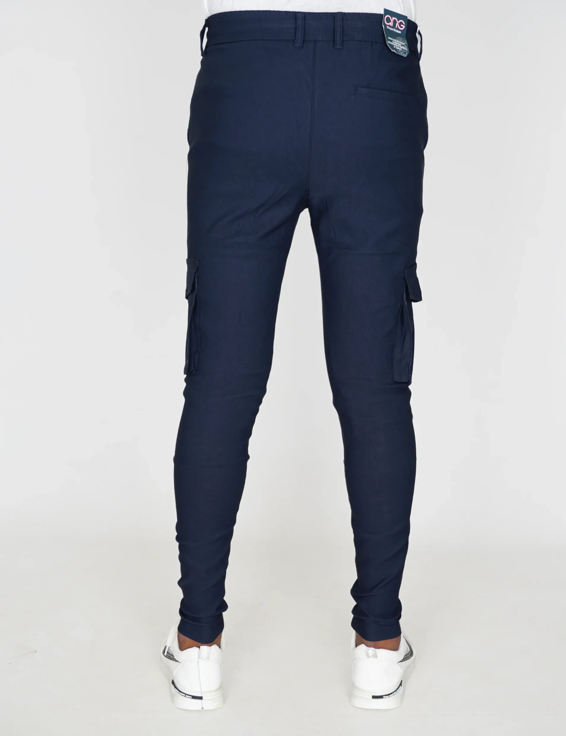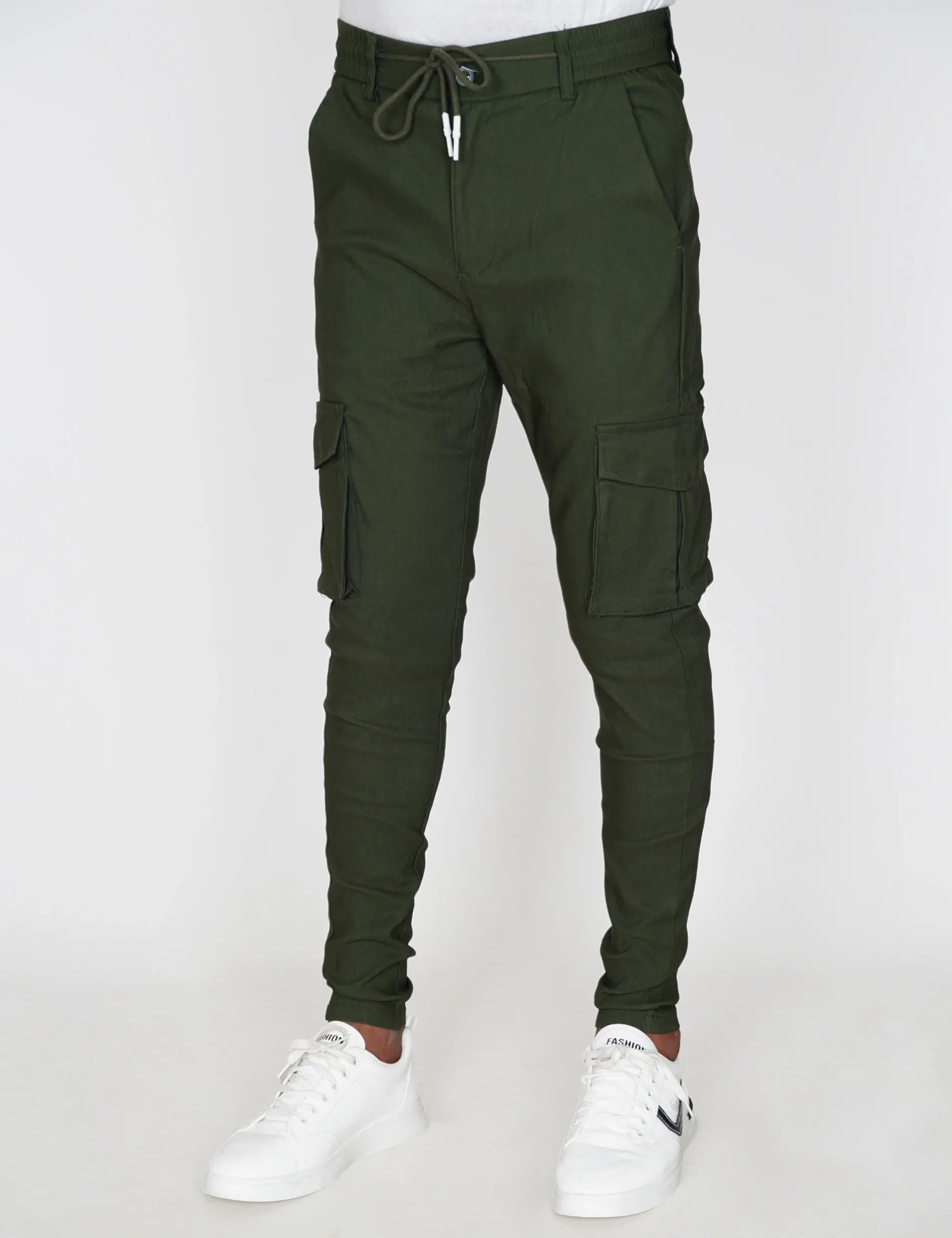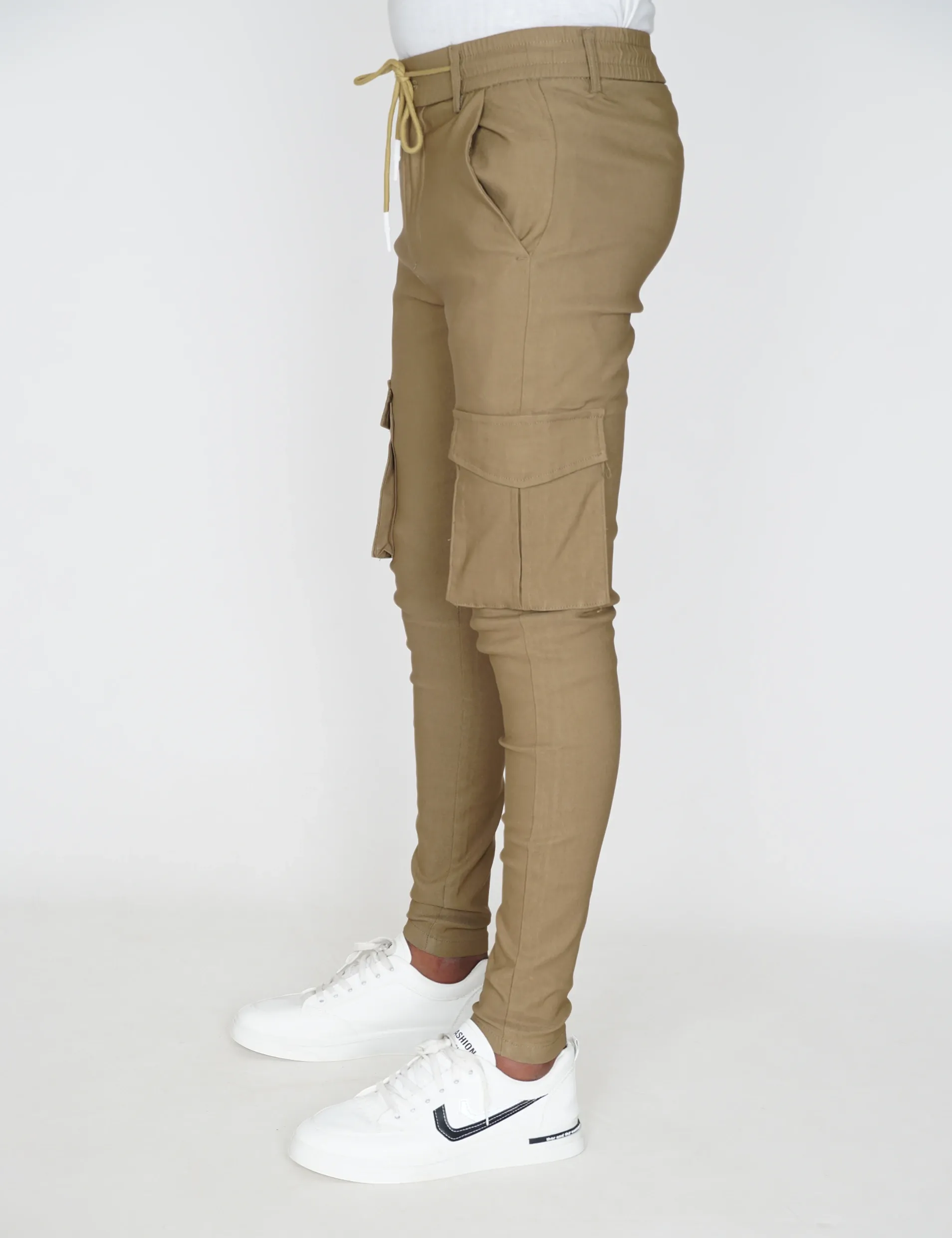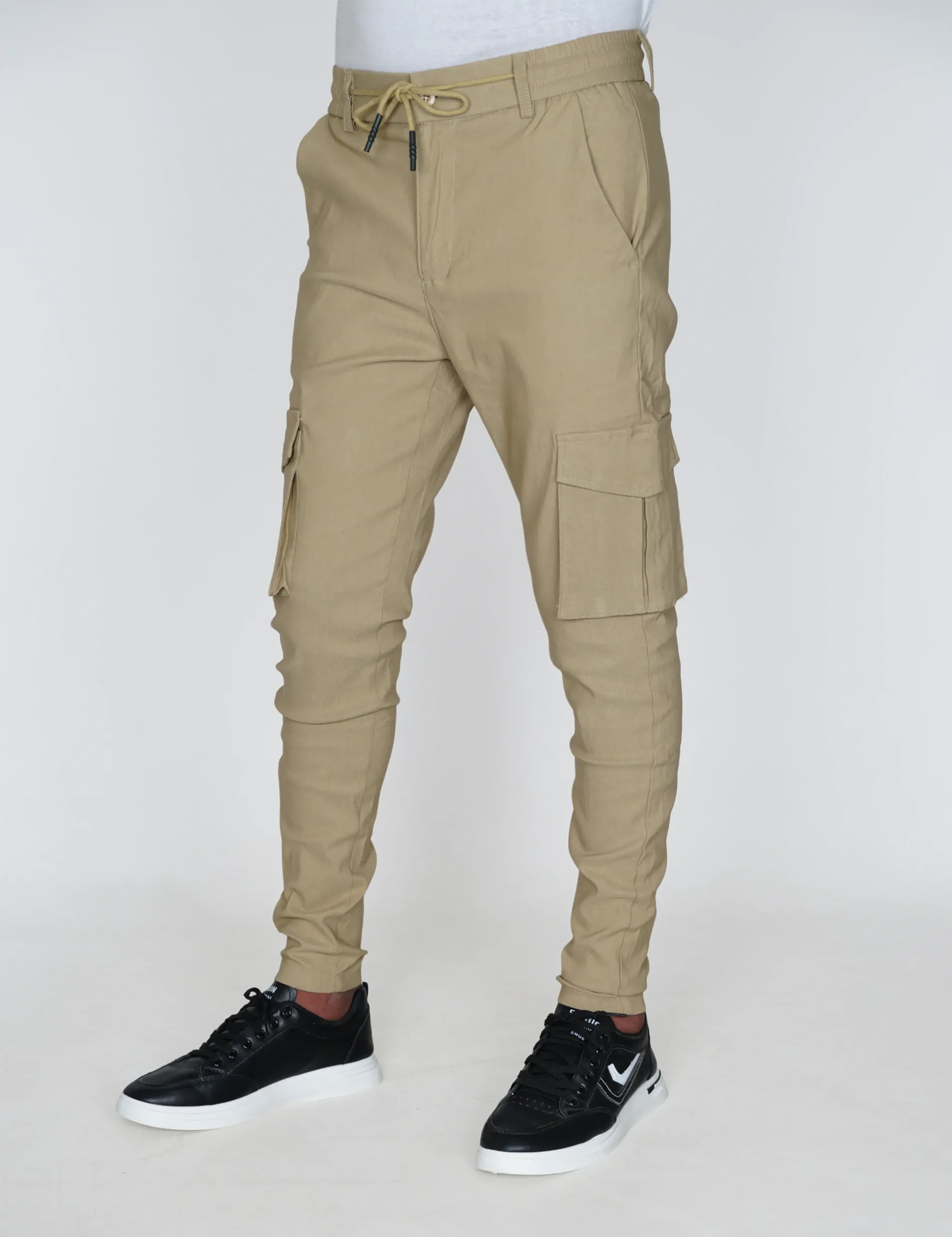 رباط في الخصر بالاضافة الى خمسة جيوب واحد في الخلف واثنين جيوب مخفية في الأمام واثنين عند الركبة