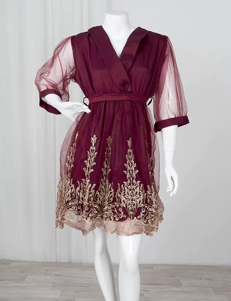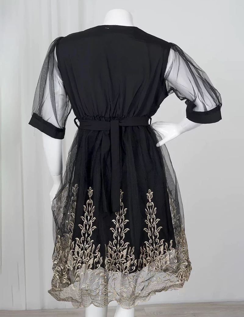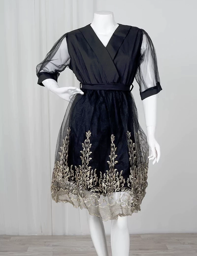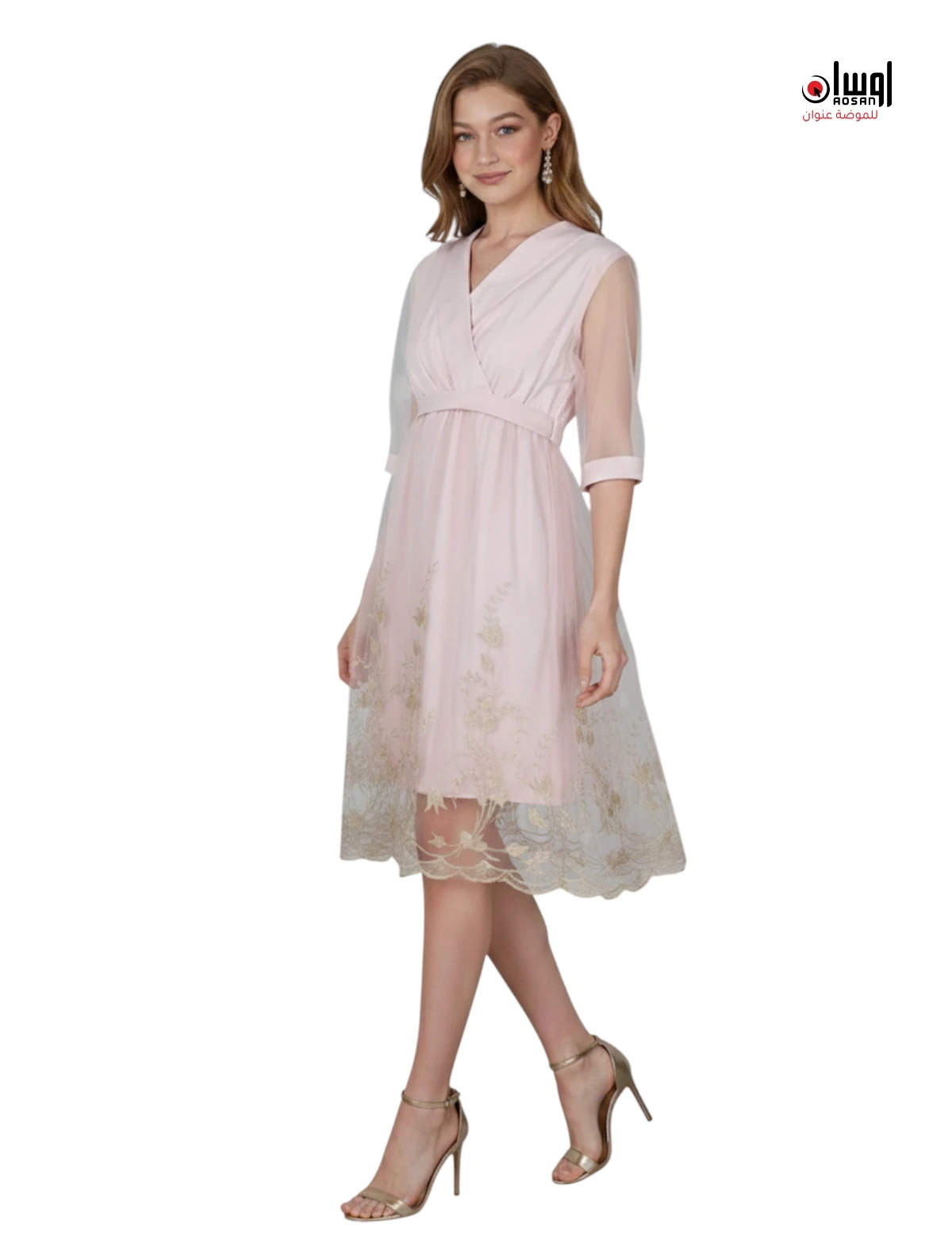 فستان قصير بنقشة خفيفة من أطراف الفستان، وحزام على الخصر وكم شفاف متوسط الطول