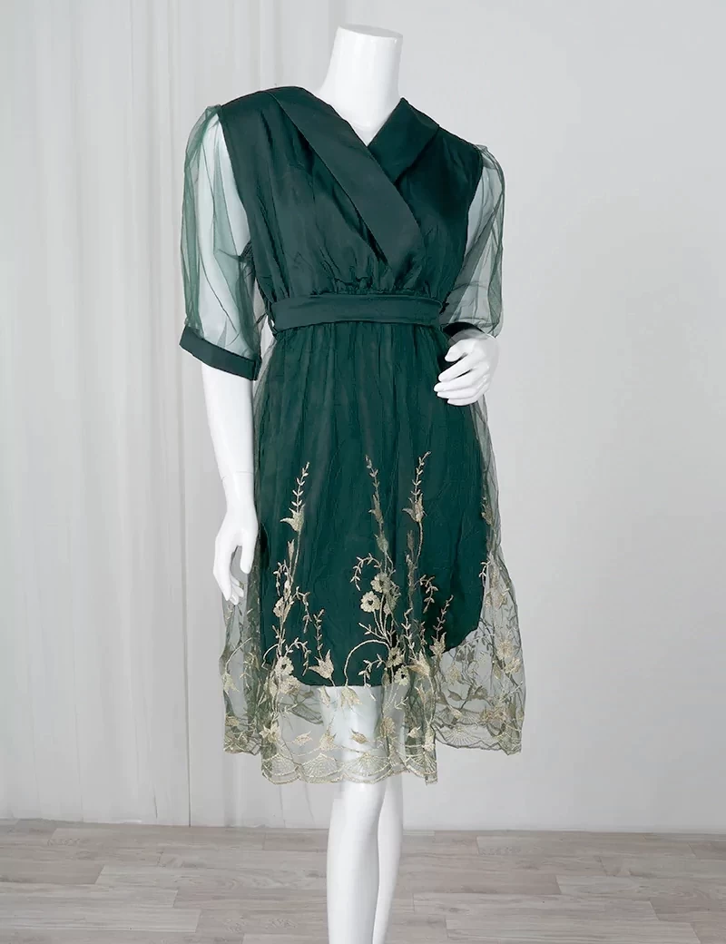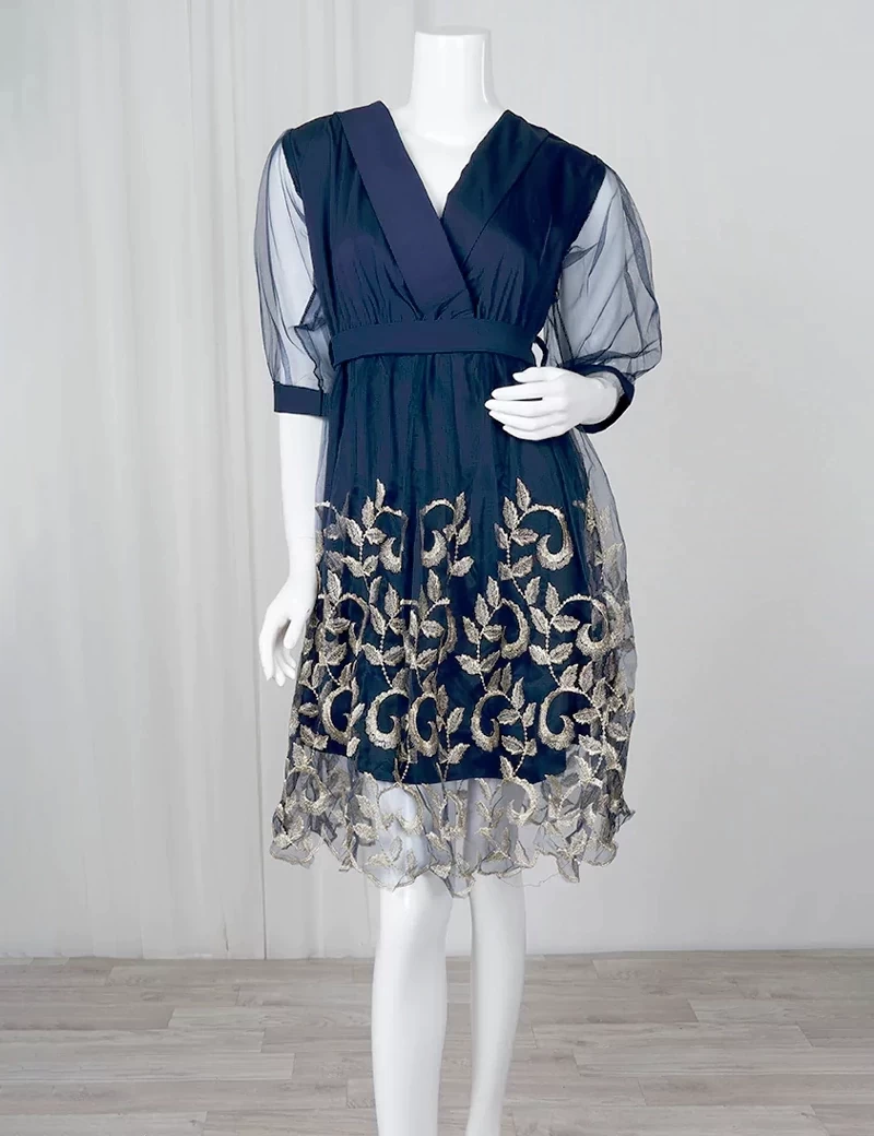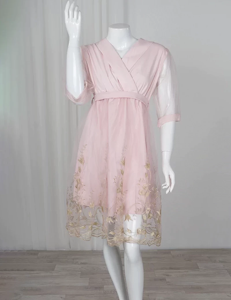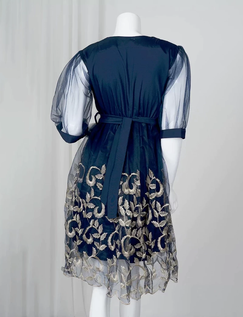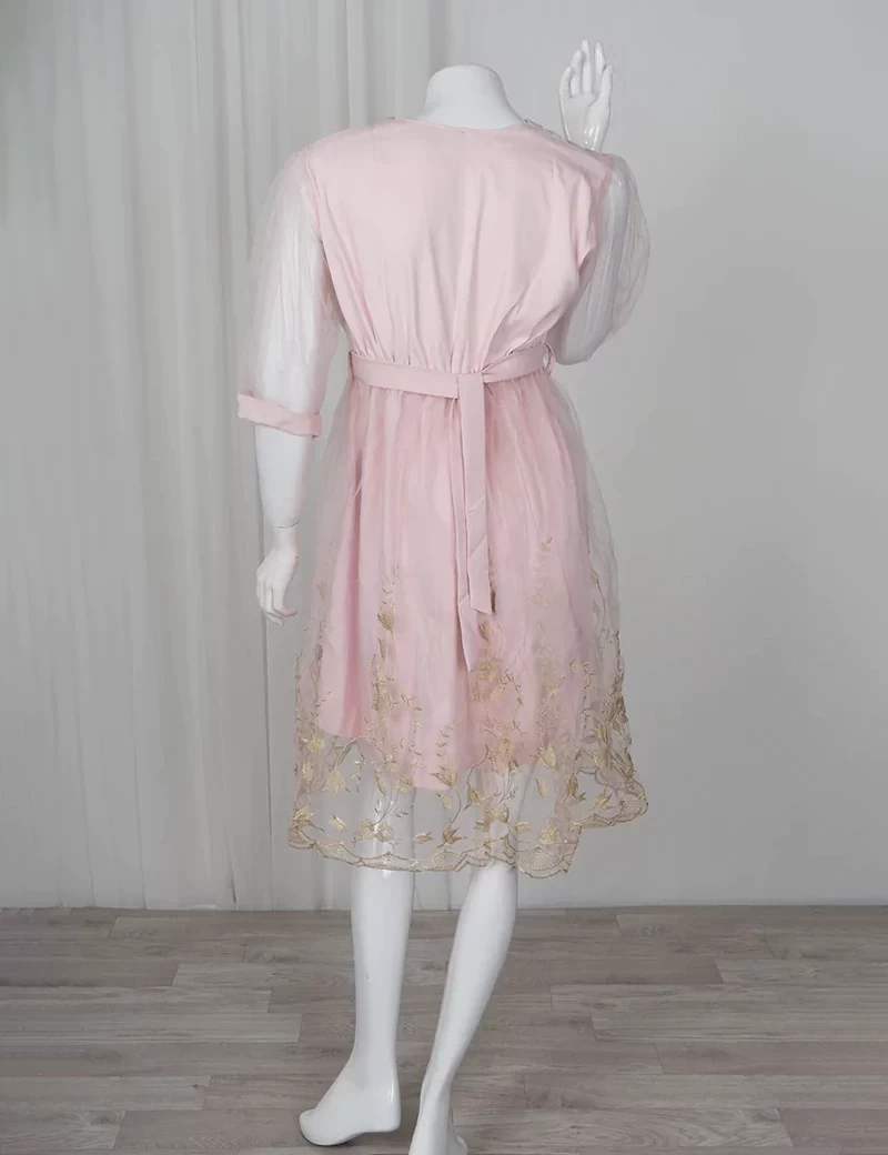 فستان قصير بنقشة خفيفة من أطراف الفستان، وحزام على الخصر وكم شفاف متوسط الطول