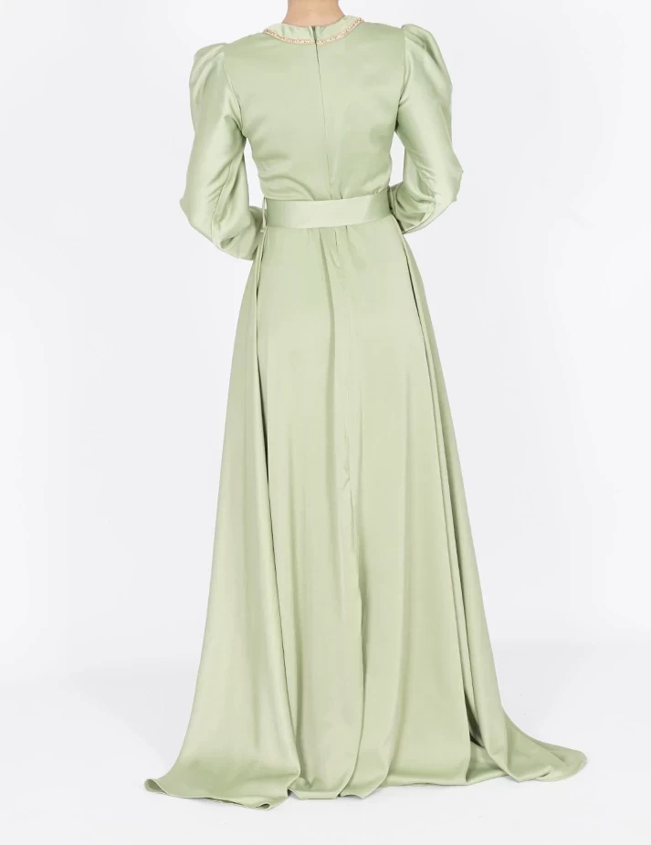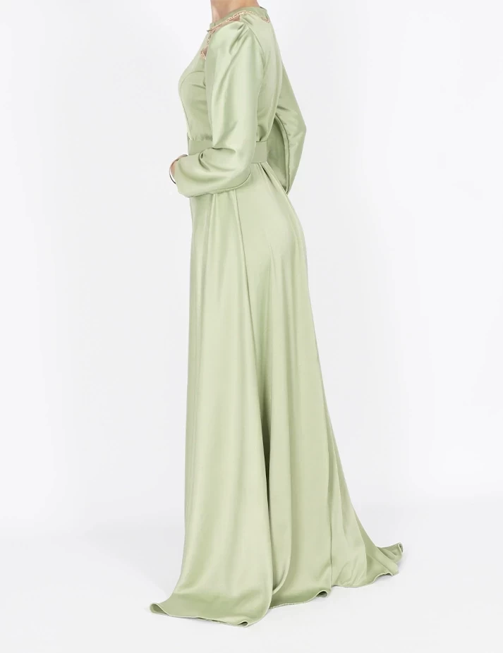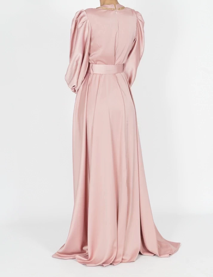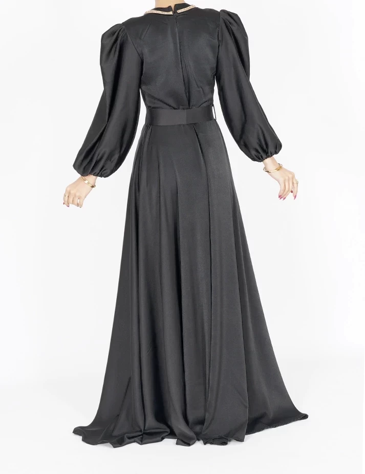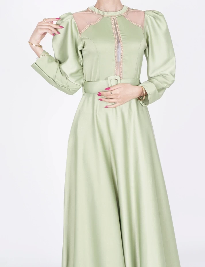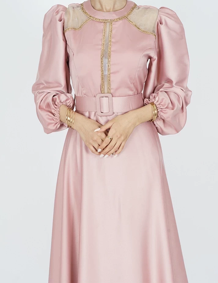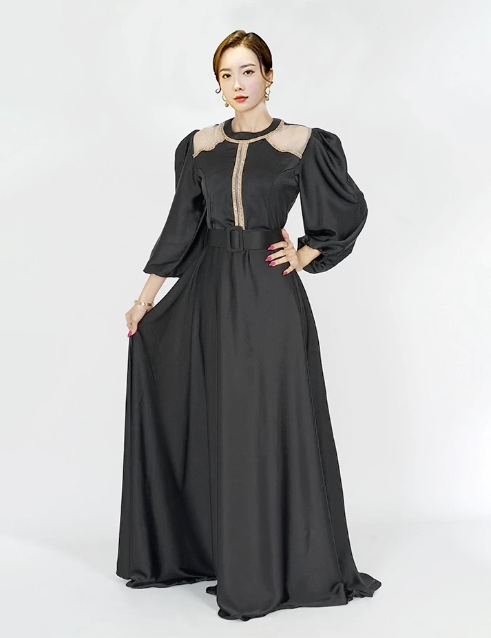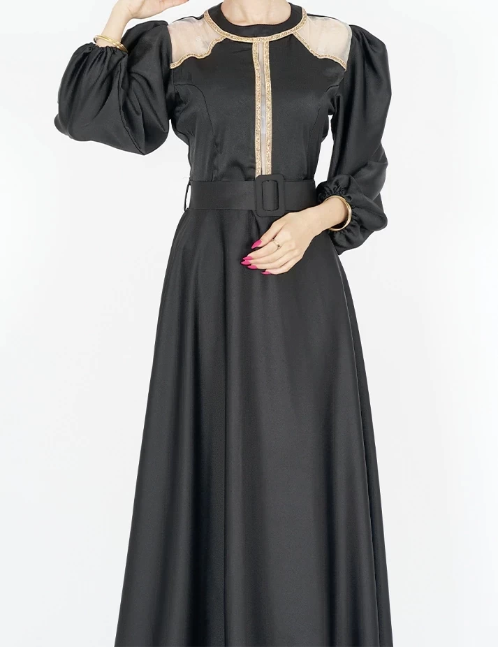 القماش : حريررقبة دائرية على شلش بالرقبةأكمام طويلة على قبضةشبك شفاف على الكتفربطة حزام بالخصر تبرز جمال خصرك. |