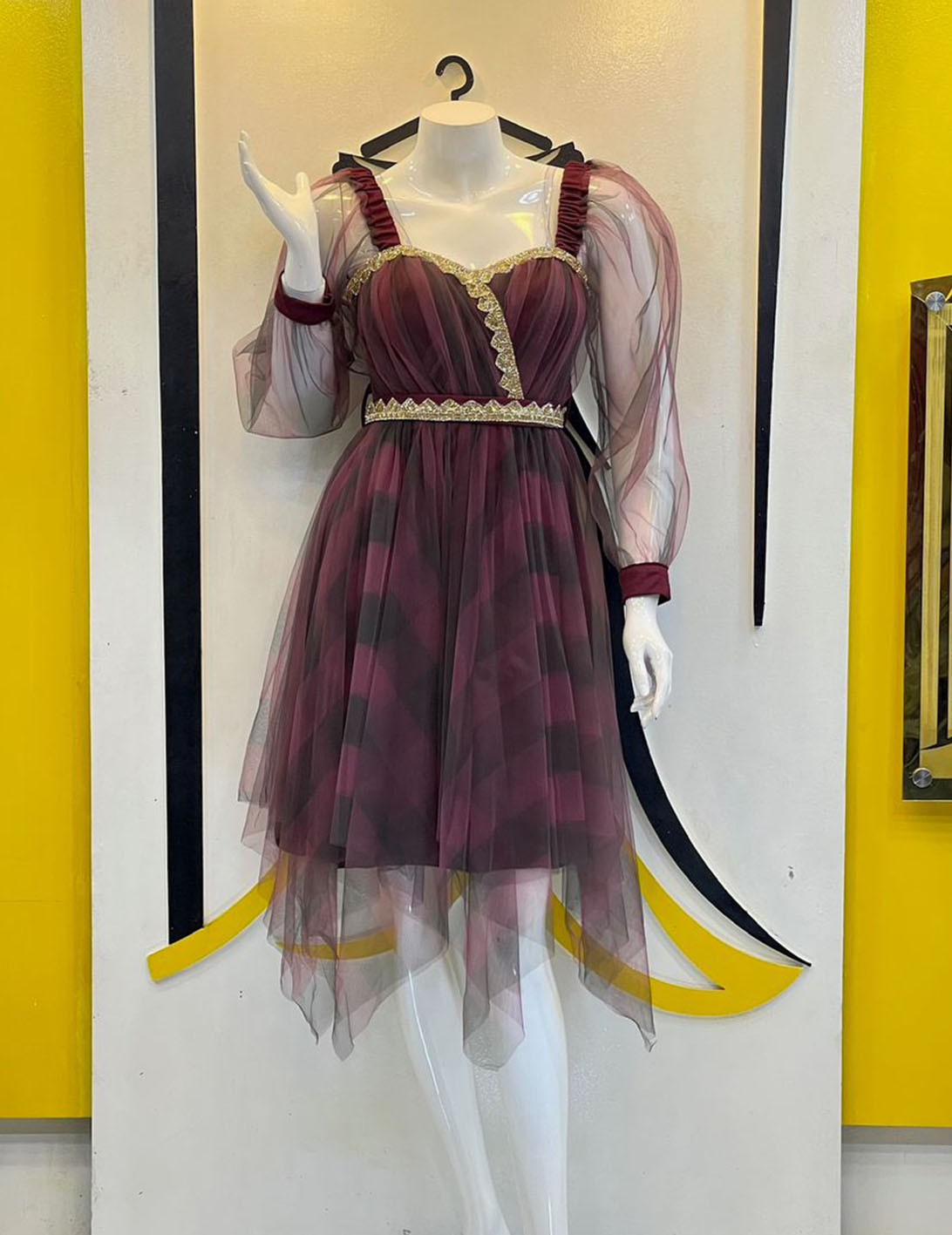 قماش : نل مقلممكون من طبقتين طبقة تل و طبقة بطانةكرمشة بالكتفكرستال بالصدريدتن قماش شبك على جبزور بطرف اليد |
