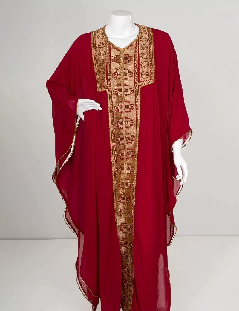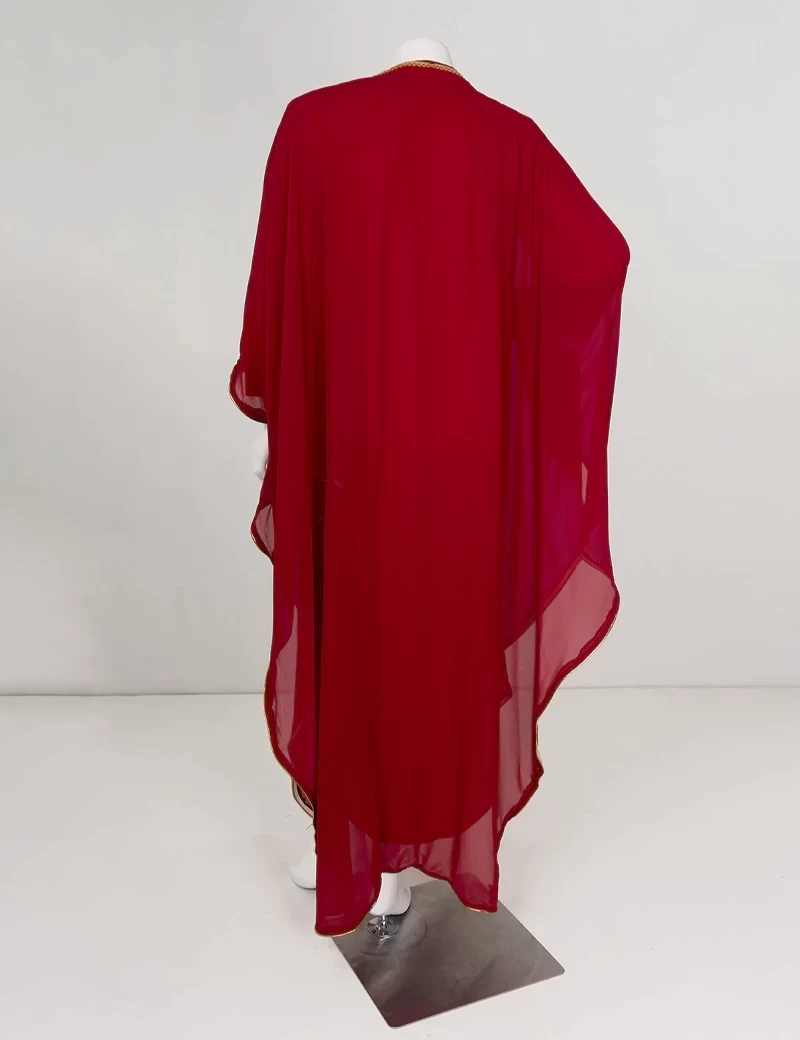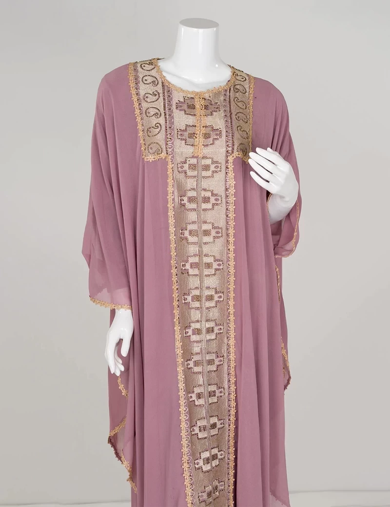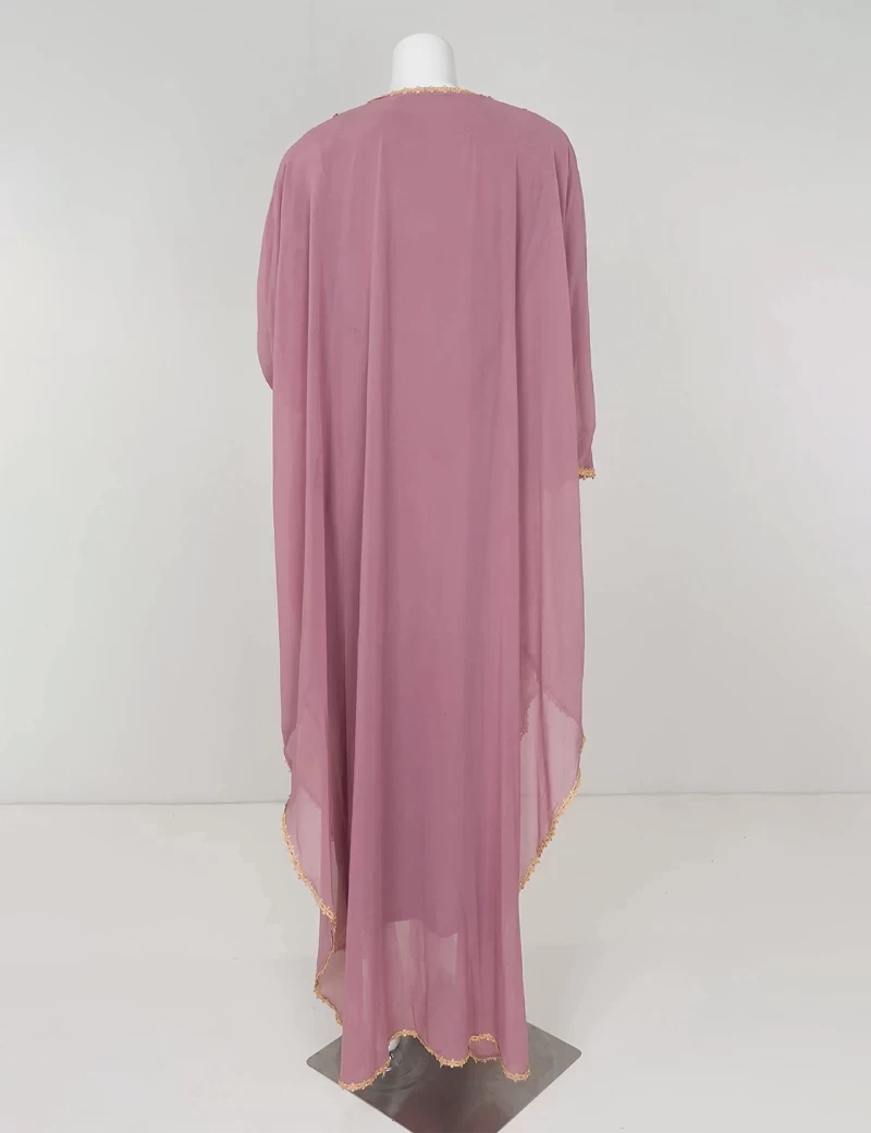 نوع القماش/ شيفونعباية بتصميم مغربي مطرزة من الأمام بشكل كاملقصة رقبة على شكل دائرةأكمام عريضة. |
