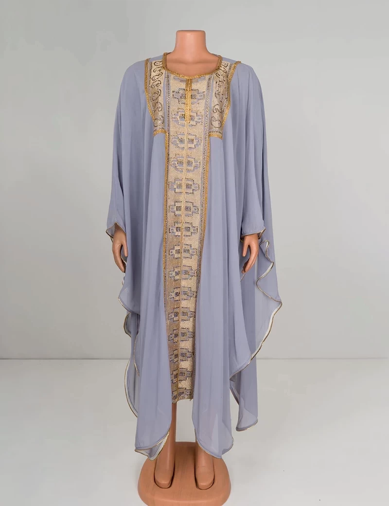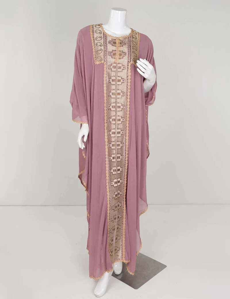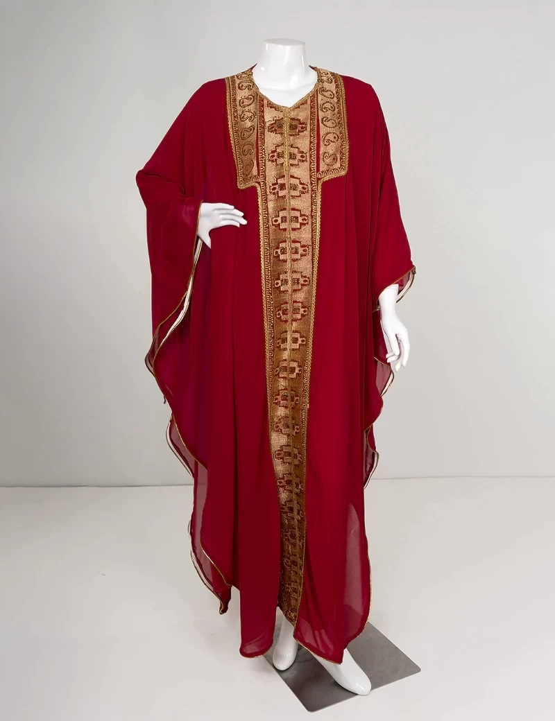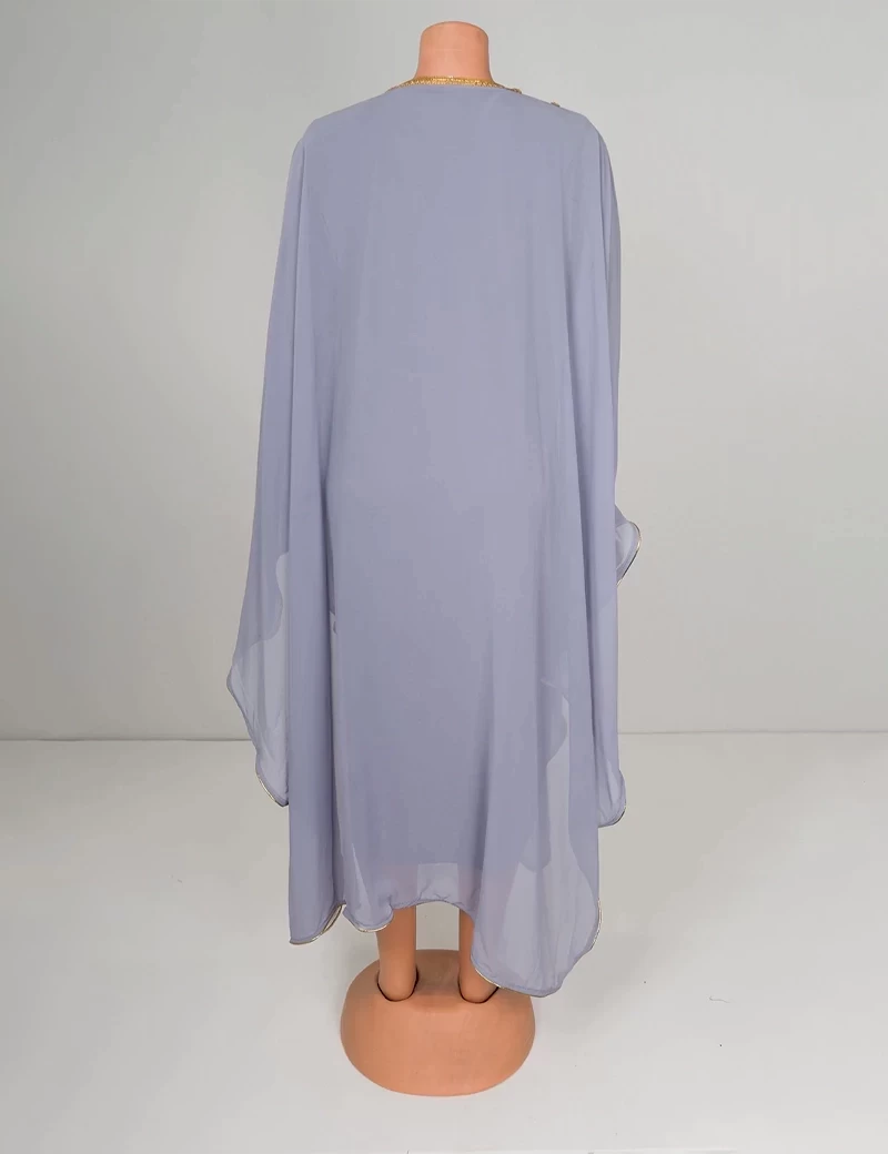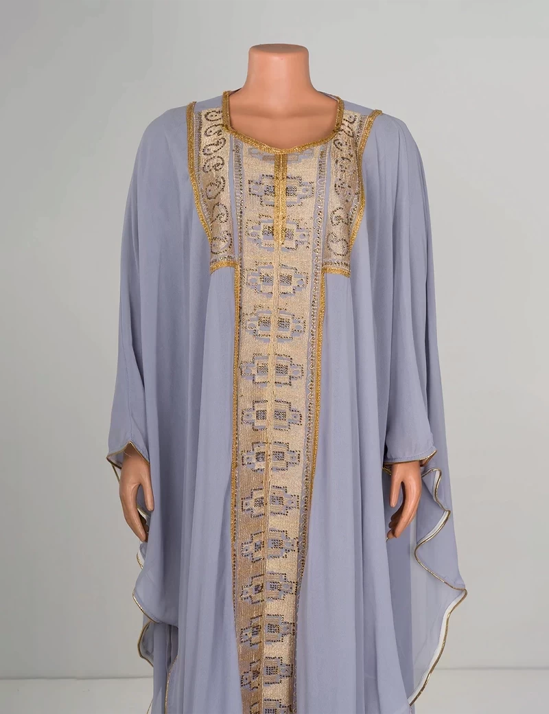 نوع القماش/ شيفونعباية بتصميم مغربي مطرزة من الأمام بشكل كاملقصة رقبة على شكل دائرةأكمام عريضة. |