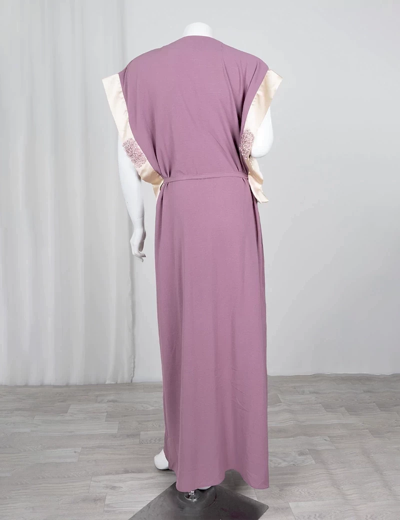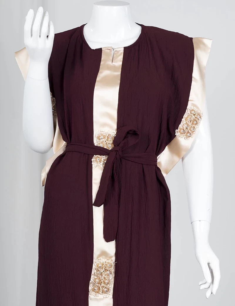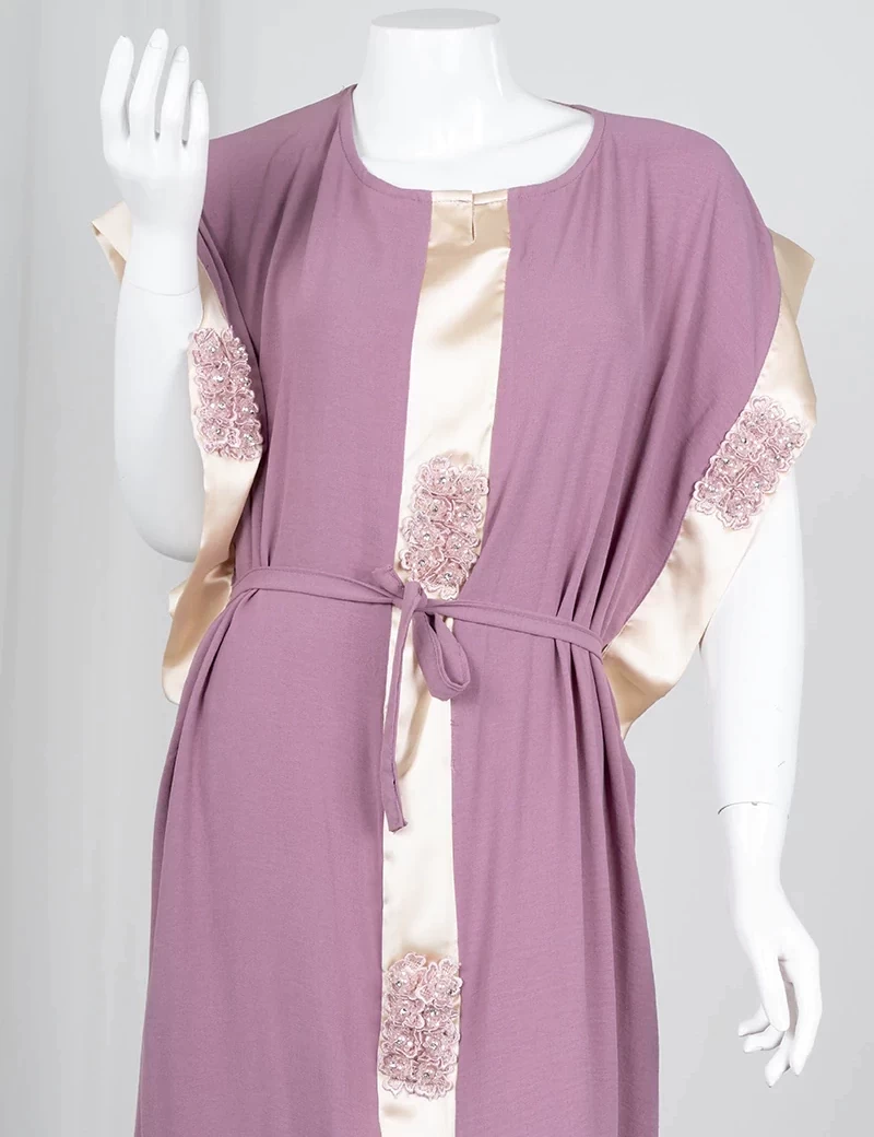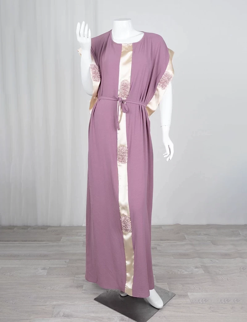 أكمام قصيرة على طرفها قطعة قماش حرير ناعمخط من الأمام بقماش حريري ناعمربطة خصر |