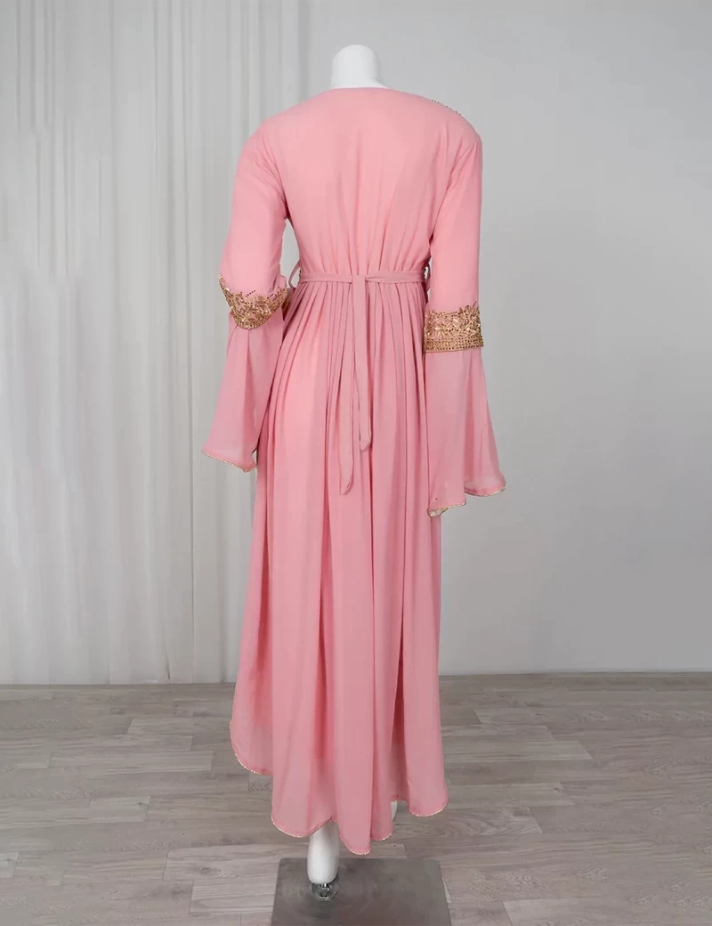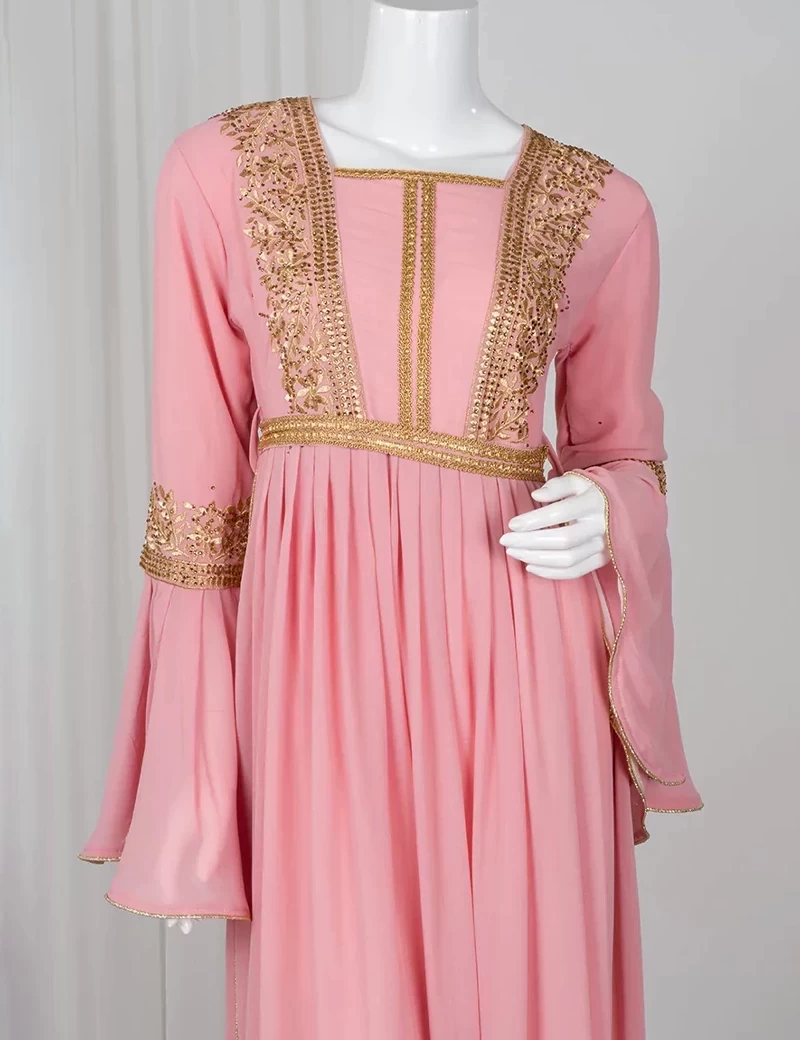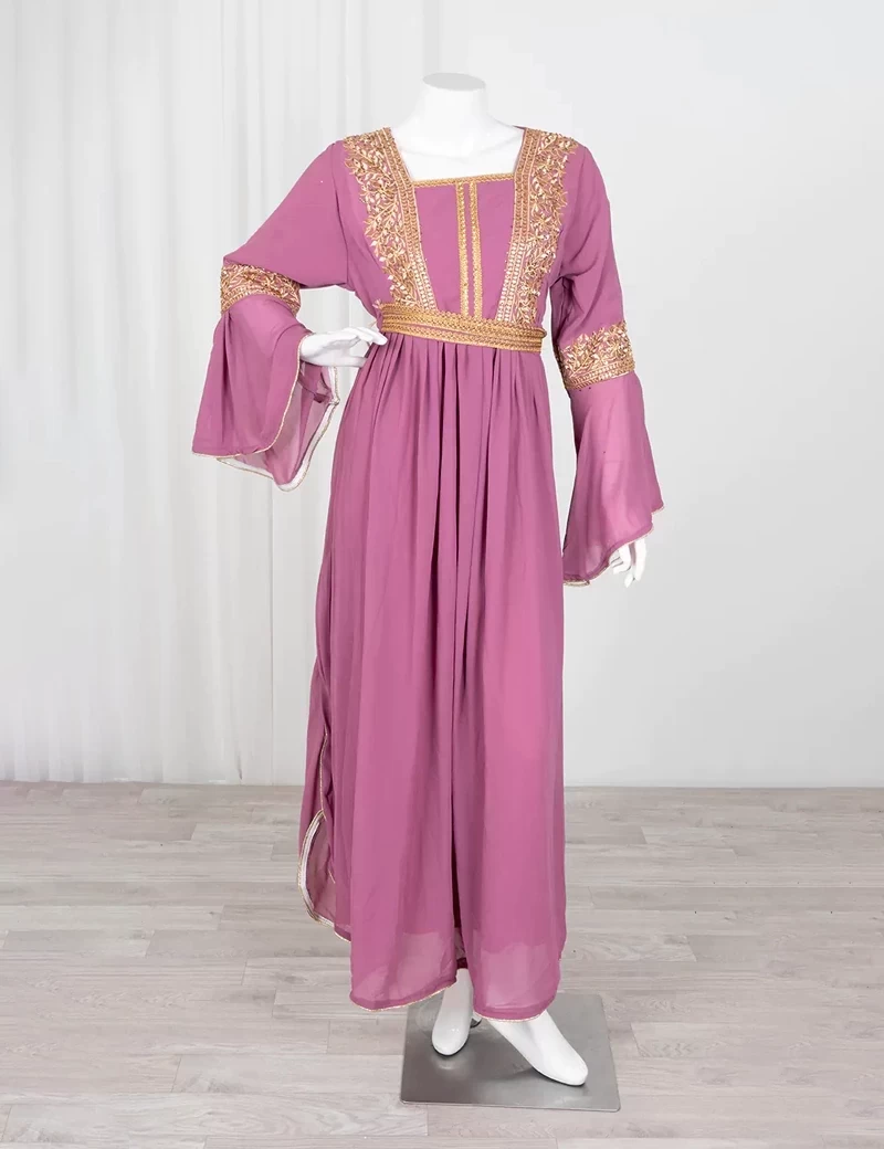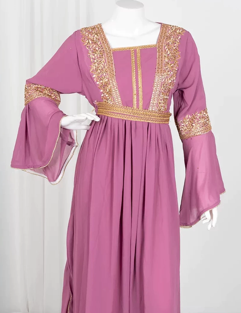 نوع القماش/ شيفونقصة رقبة على شكل مربعمطرزة من الصدرأكمام طويلة مزركشة من الطرفمطرزة بخرز من طرف تنورة الجلابية. |