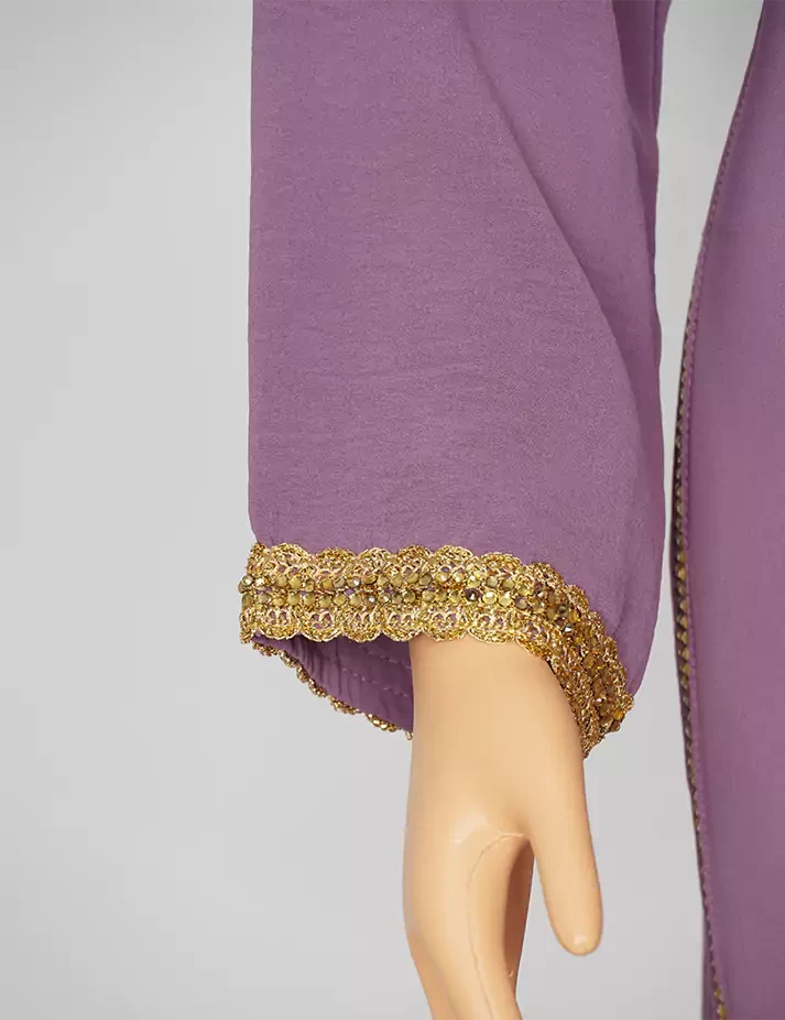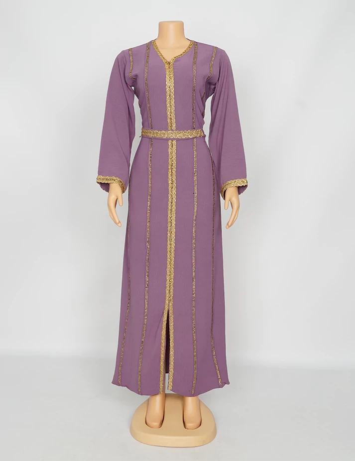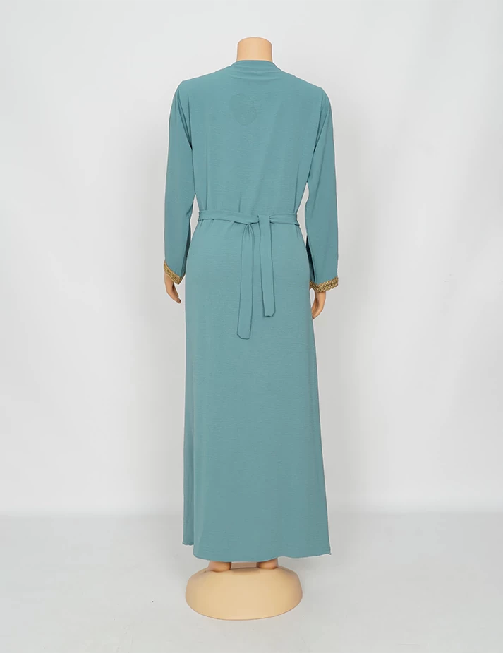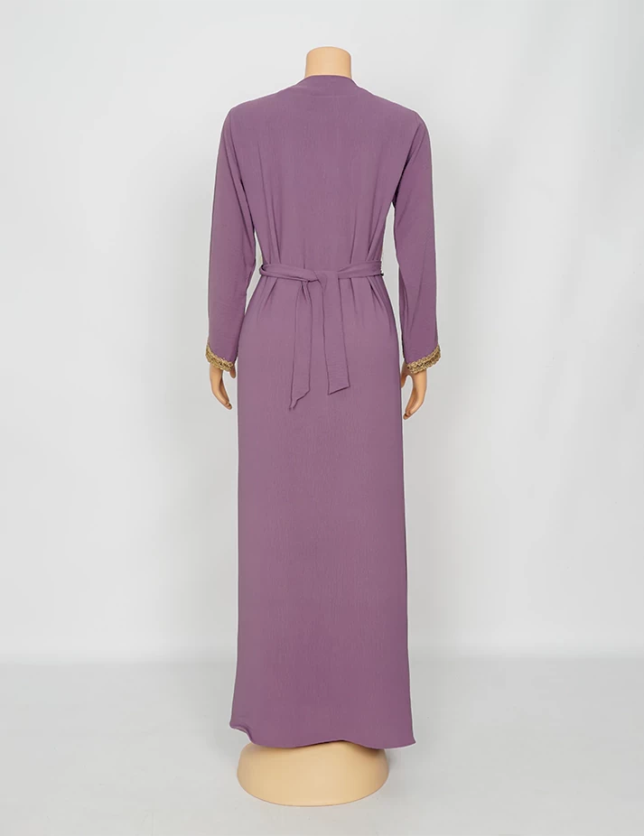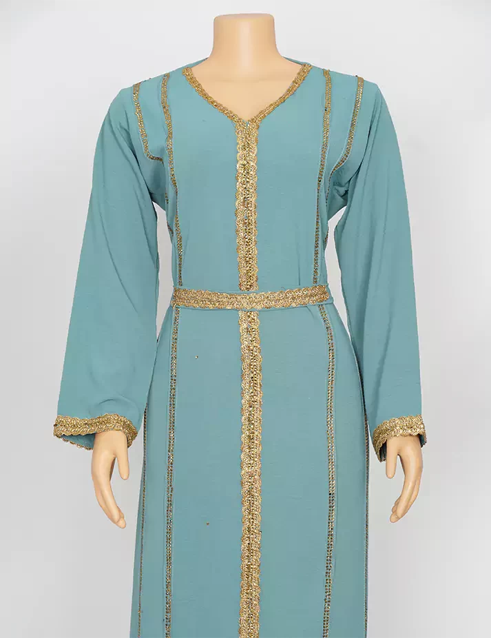 القماش : اليكراءقصةرقبة على شكل سبعة مغلق الامامعلى شلش جبير من الأمام وعلى الأكمامربطة حزام بالخصر الحزام ملفوف بشلش. |