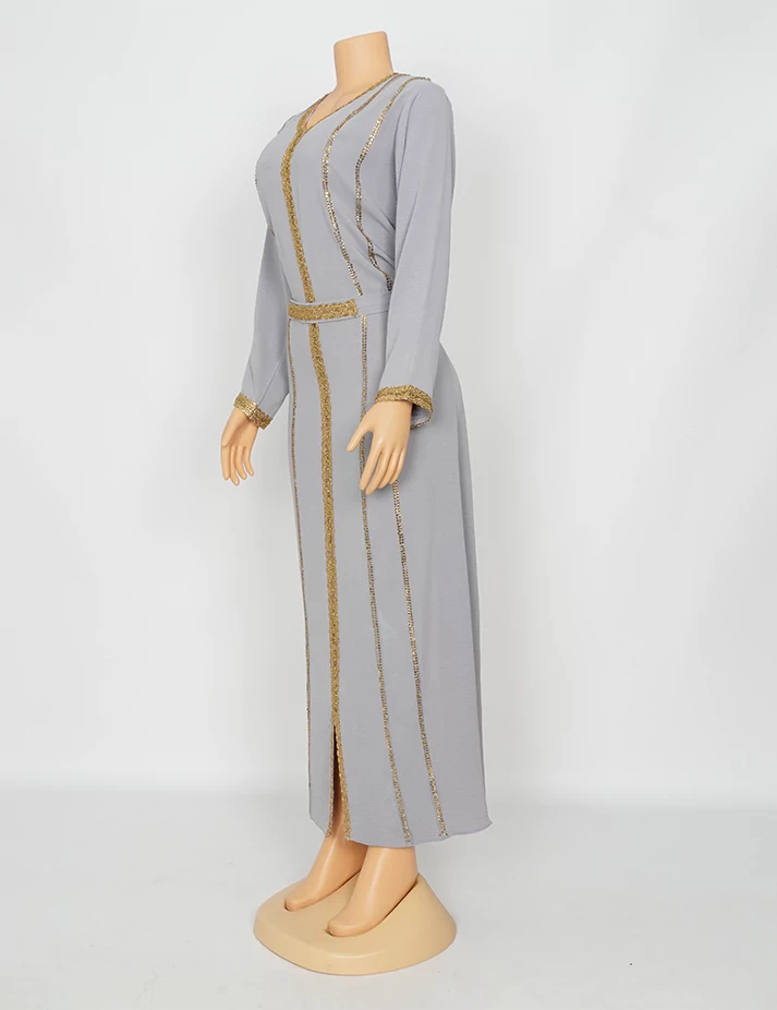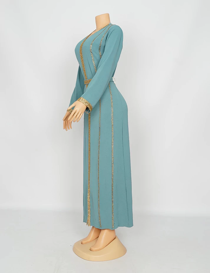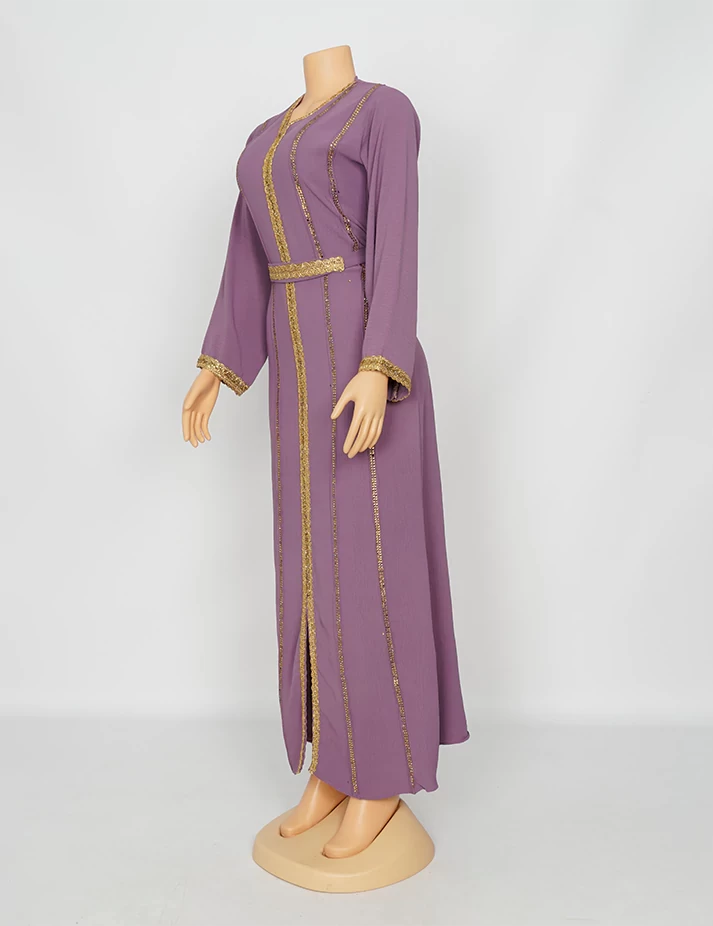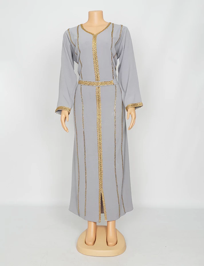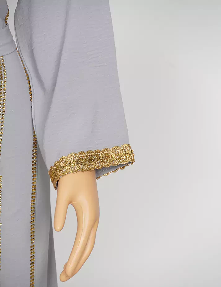 القماش : اليكراءقصةرقبة على شكل سبعة مغلق الامامعلى شلش جبير من الأمام وعلى الأكمامربطة حزام بالخصر الحزام ملفوف بشلش. |