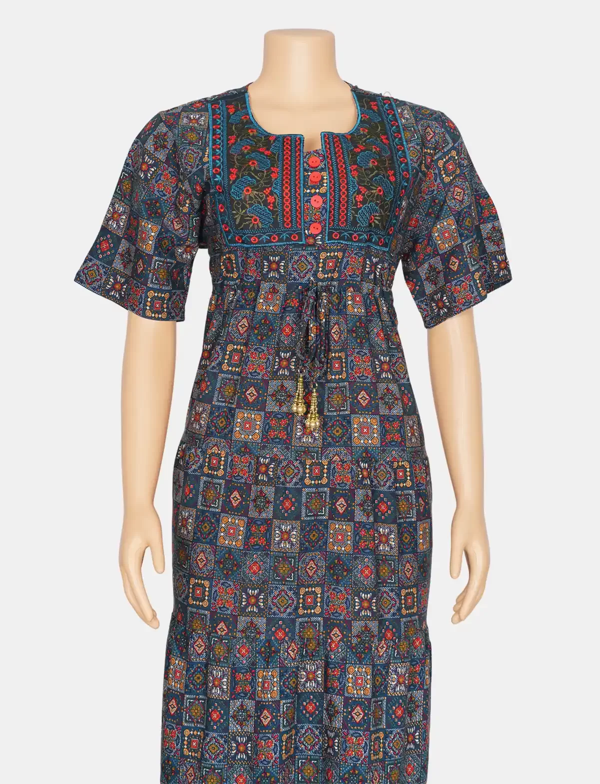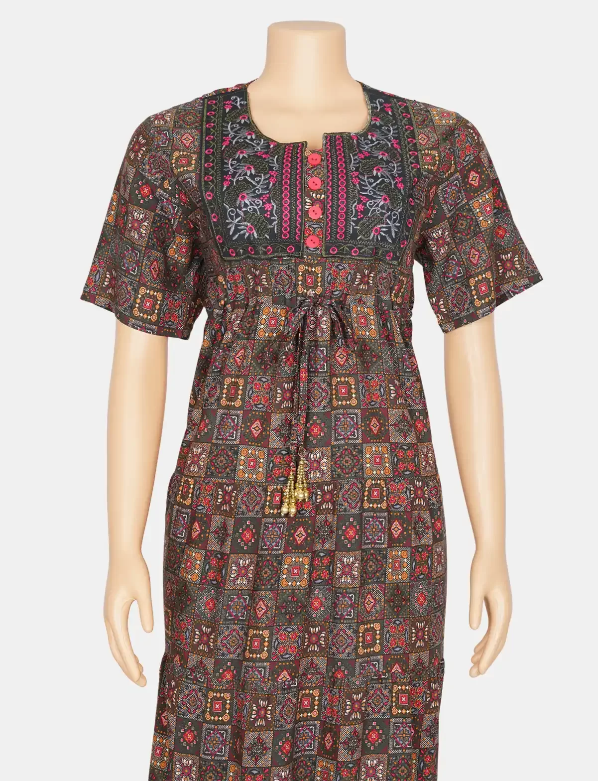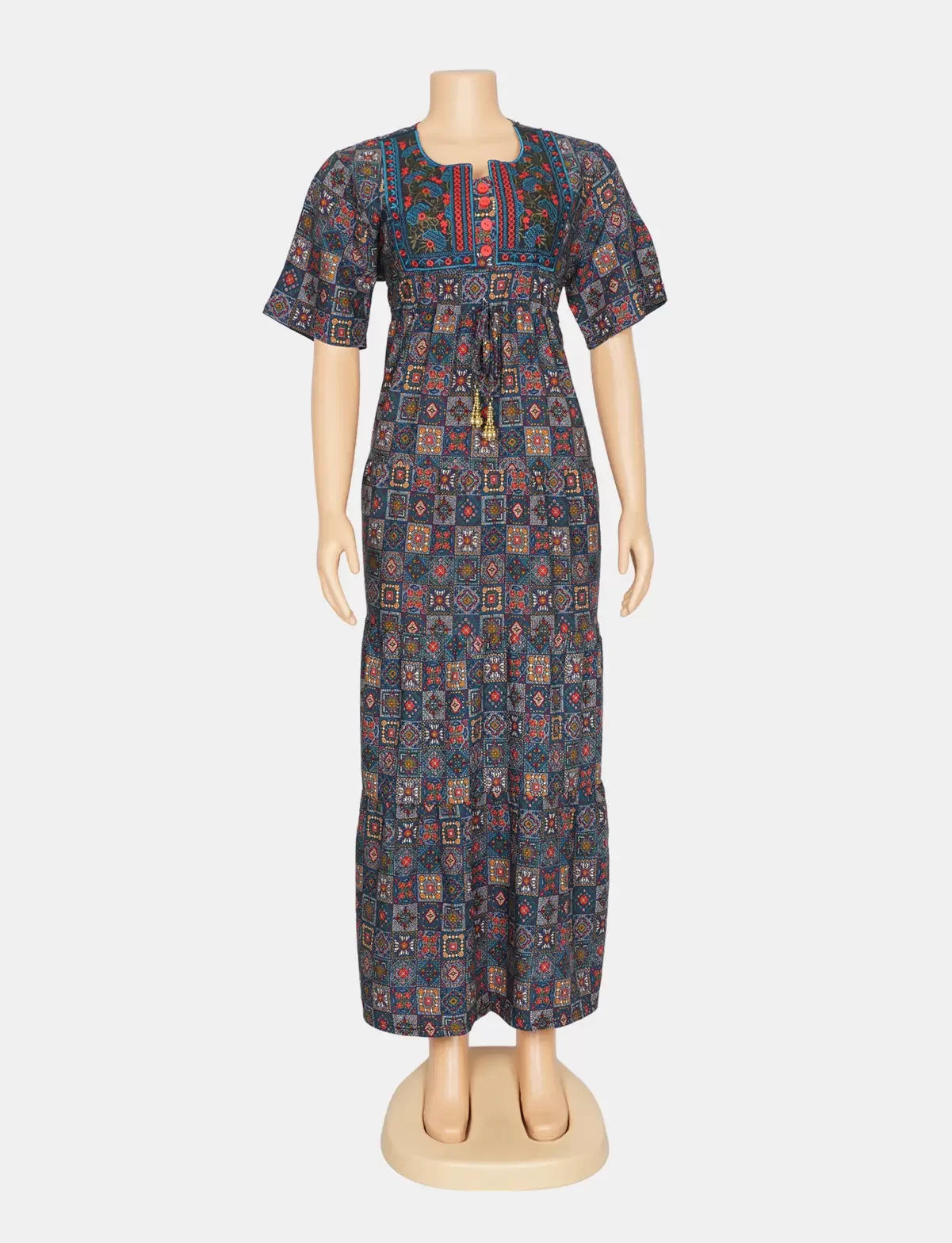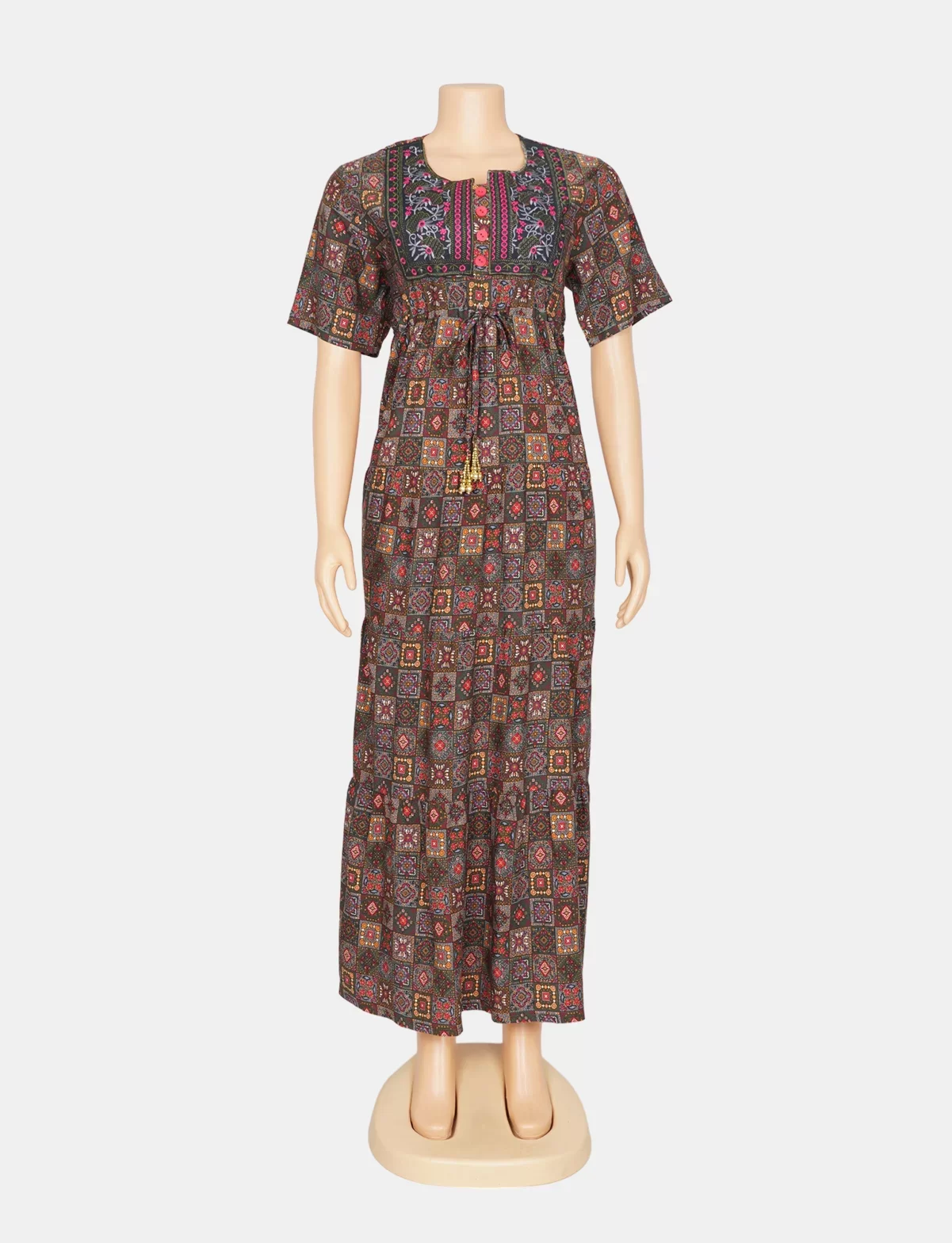 جلابية نسائي بتصاميم جذابة وأنيقة .المميزات والتفاصيل :1. رقبة دائري على فتحة مربعة في الصدر2. زرارات في الأمام غير قابلة للتعديل والإزالة3. طبقة مطرزة مبطنة في الصدر4. ربطة حزام في الخصر مع لول في الأطراف قابلة للتعديل5. أكمام قصيرة نص كمقطن صناعي : 100% رايون