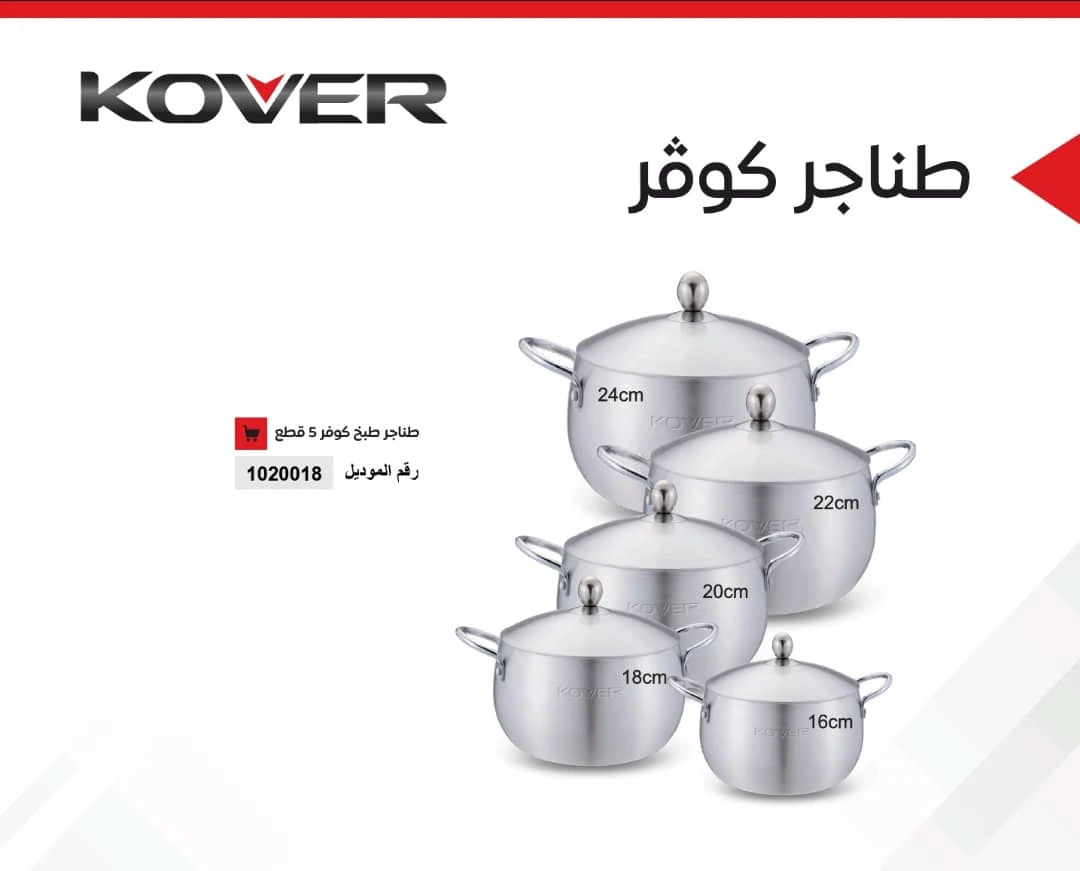 طقم طناجر كوفر عالية الجودة عدد خمس قطع (16,18,20,22,24) سم طقم قدور طهي من الألومنيوم يحمل علامة "Kover".