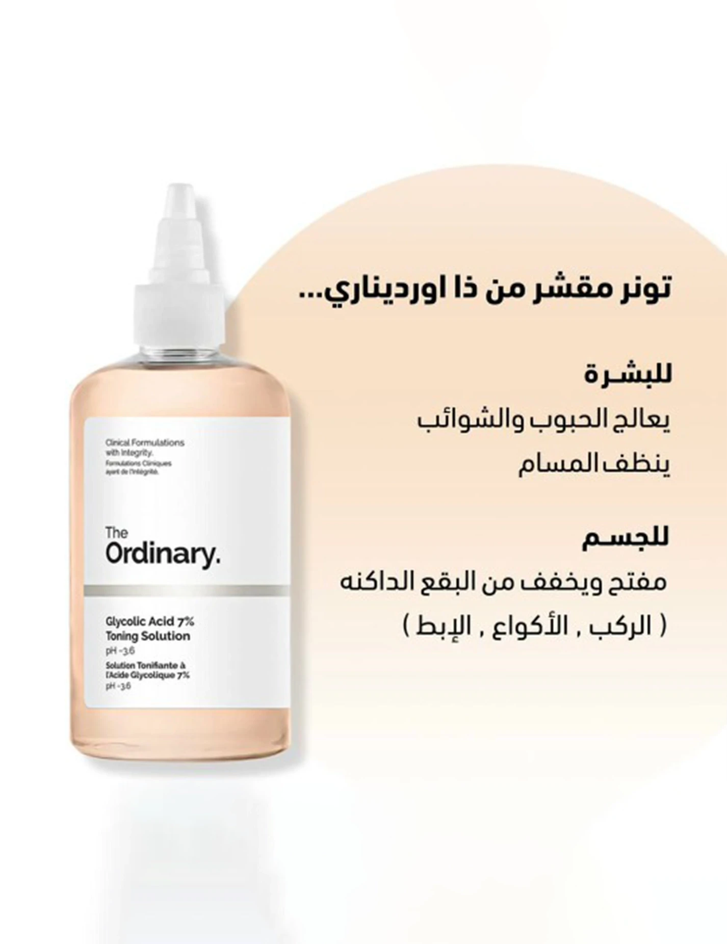 تونر ذا اوردينارى جلايكوليك من أفضل المنتجات الي أعطت نتائج ممتازة في التقشير اللطيف وتفتيح لون البشرة