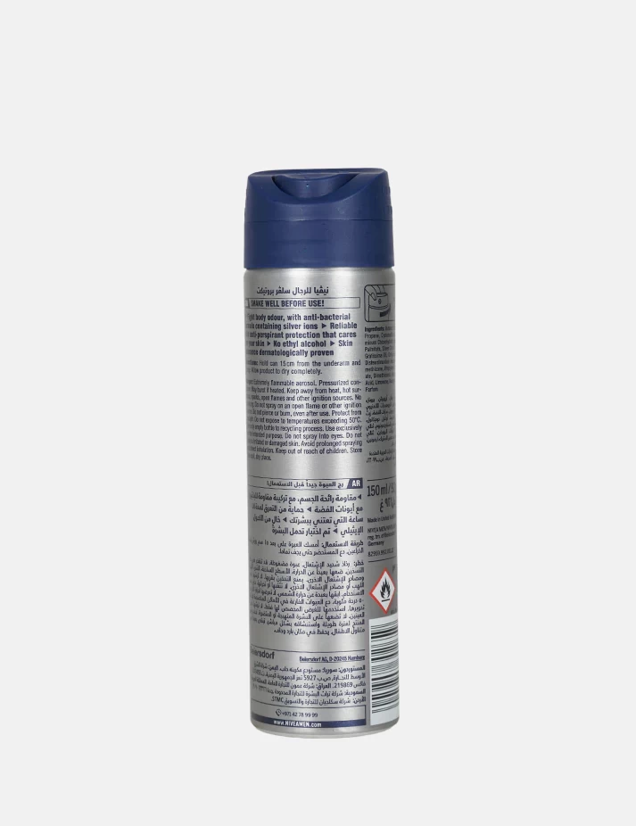 يوفر مزيل العرق سيلفر بروتيكت من نيفيا للرجال حماية قوية تدوم طويلًا، فهو مطوَر خصيصا للتخلص من رائحة الجسم الكريهة والعرق للرجال. تحتوي التركيبة المبتكرة على أيونات الفضة التي أثبت علميا أنها تقضي على البكتيريا المسببة للرائحة الكريهة بدون آثار جانبية. مما يمنع بداية تكون رائحة الجسم الكريهة.وفوق ذلك، فإن تلك التركيبة تحمي الجسم من التعرق.الاستخدامات:ضع بخة واحدة يومياً من نيفيا مضاد للتعرّق لحماية ضد البقع الصفراء للرجال تحت كل إبط لتنعم برائحة زكية وثقة عالية طوال اليوم. سواء اخترت ملابس سوداء أم بيضاء، فالنتيجة مضمونة. للحصول على مظهر متألق، استعمل أولاً نيفيا سائل الاستحمام مرطب البشرة للرجال. ثم استعمل نيفيا لوشن الجسم لمظهر أنيق لتحظى باطلالة مميزة. وأخيراً، استعمل بخاخ نيفيا اليومي للرجال ليكون مظهرك على أكمل وجه. أصبحت جاهزاً الآن، يمكنك الانطلاق.طريقة الأستخدام؟:الاستخدام عن بعد 15 سم من الجسم. مخصص لمنطقة تحت الذراعين فقط او تحت الابط |