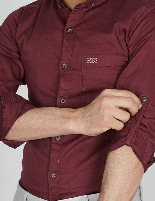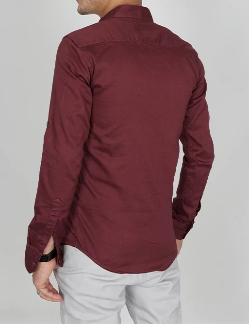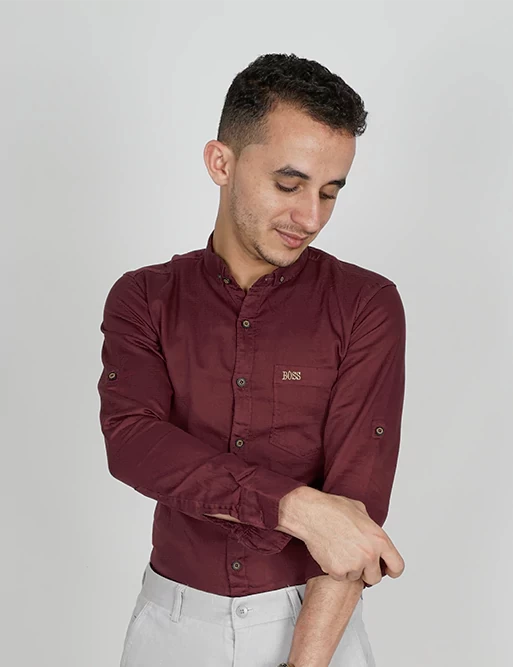 شميز سادة كم طويل وزرارات من الأمام وزرار طرف الكم وجيب واحد على الصدر، لونه الاحمر الداكن الأنيق والجذاب، ورفعة الكم للتحكم بطول الكم. |