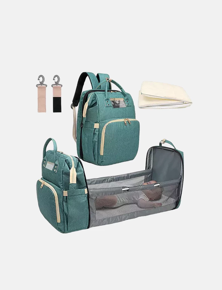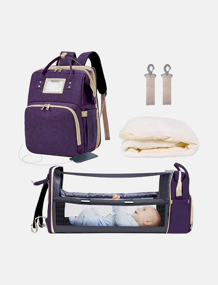 شنطة متعددة الوظائف تغنيكِ عن حمل حقائب عديدة، قابلة للتوسع حيث تتحول إلى سرير متمدد مظلل لينام طفلك براحة وأمان كما يمكن إستعماله لتغيير الحفاضات بشكل فعال وعمليّ. كما تحتوي على الكثير من الجيوب المصممة بإبتكار لتوفير مساحة كبيرة لتخزين أغراض طفلك الأساسية