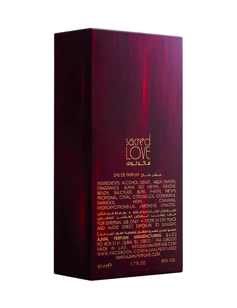 الحب المقدس هو عطر حلو يدفئ قلب المرأة بمشاعر الرومانسية. قمة الزهور الحمضية المنعشة في آن واحد تجعل قلبها منسجمًا مع الشعور المنعش بالفرح الذي لا يمكن أن يخلقه إلا الحب. قلبها المنعش من الأزهار المسكية يعانقها بدفء عاطفي ، ويكشف عن لغزها السحري للعالم معها في كل منعطف. يمتلك العطر قاعدة من الأزهار المسكية المنعشة ، مما يزيد من تعويذته الرومانسية. مع مكونات مثل زنبق الماء والياسمين والخوخ وخشب الصندل ونجيل الهند والعنبر ، فإن الحب المقدس هو الأقرب إلى جرعة الحب الأسطورية