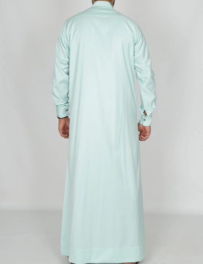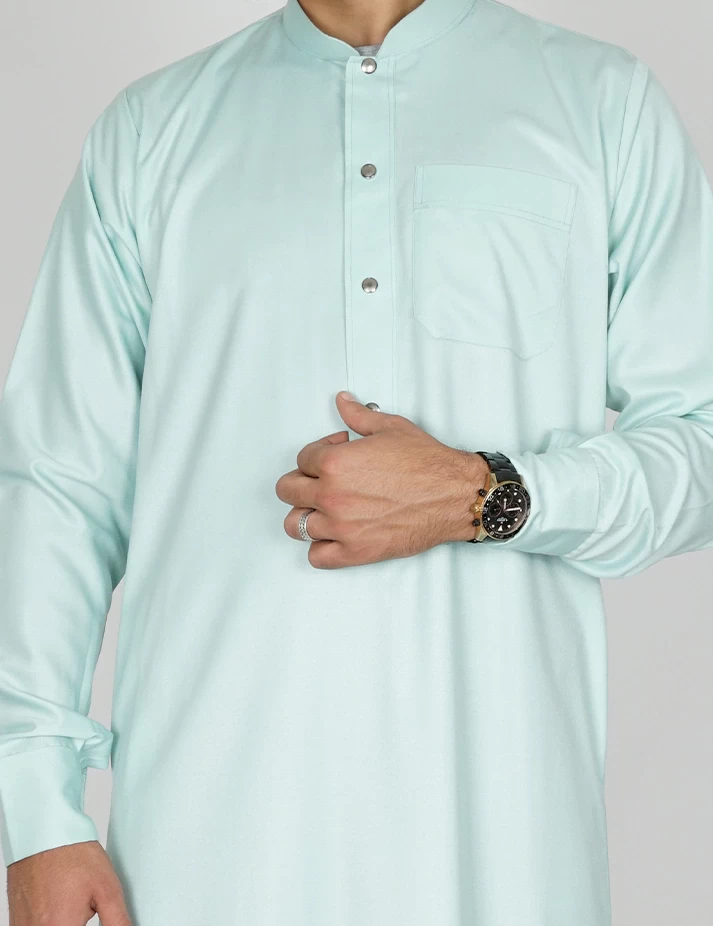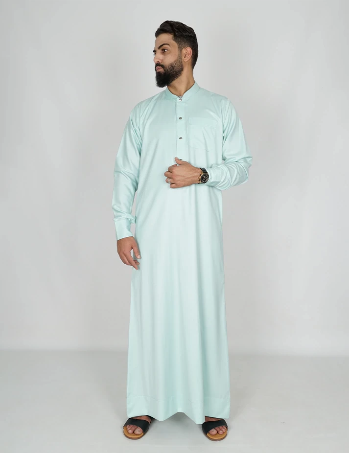 ثوب على ياقة سادة وزرارات فضية من الأمام وجيب، وجيوب على الجنب لونه أنيق وقماشه جودته عالية. |