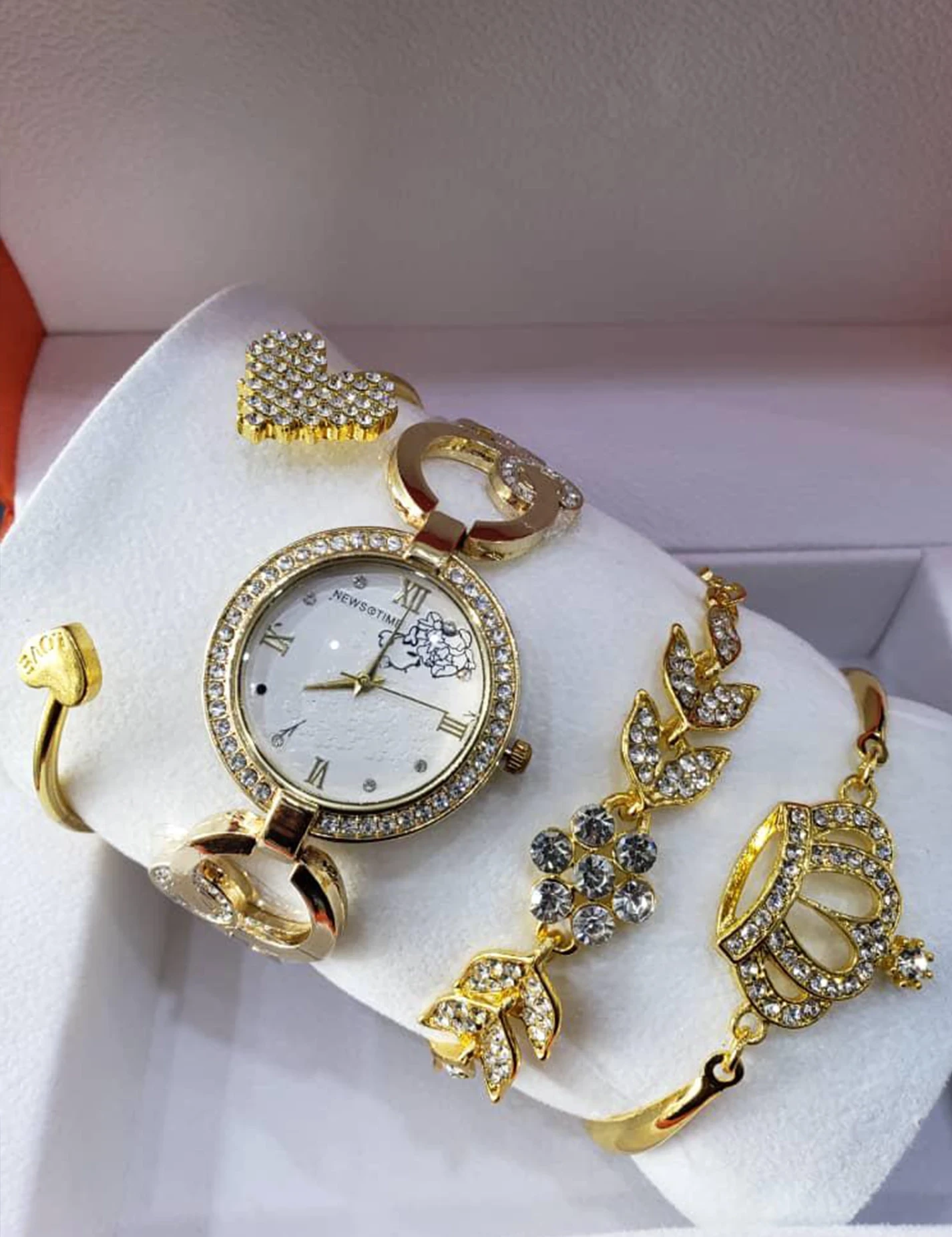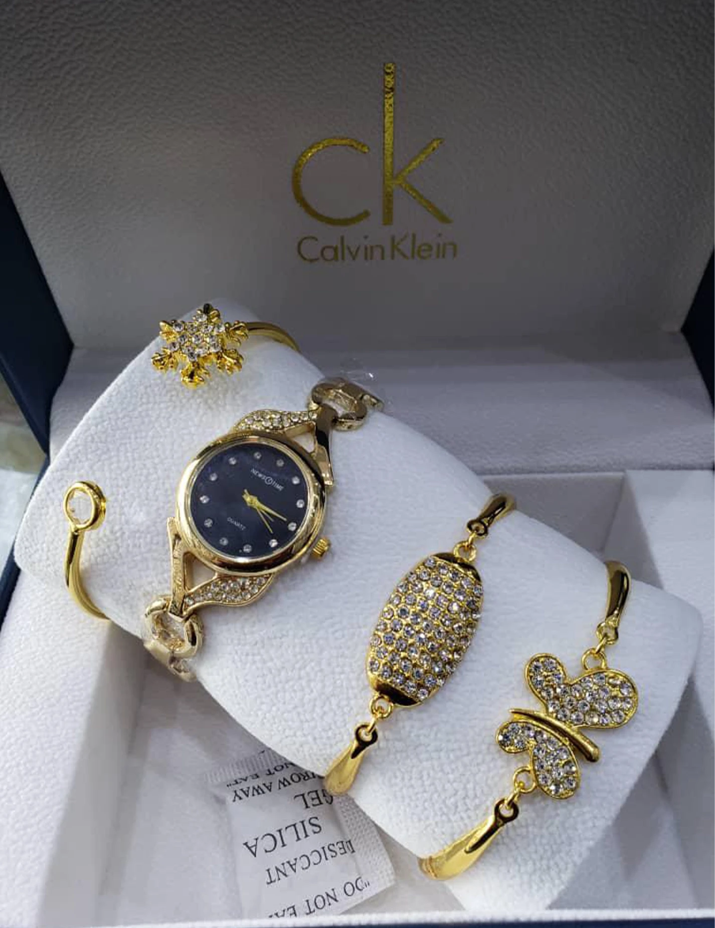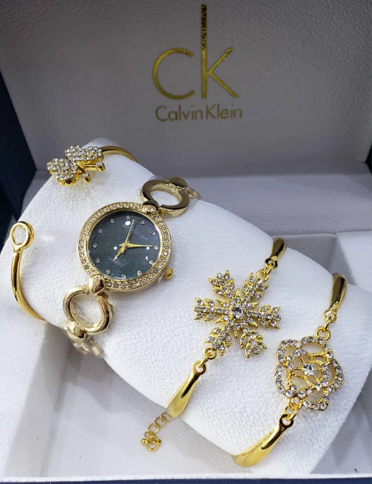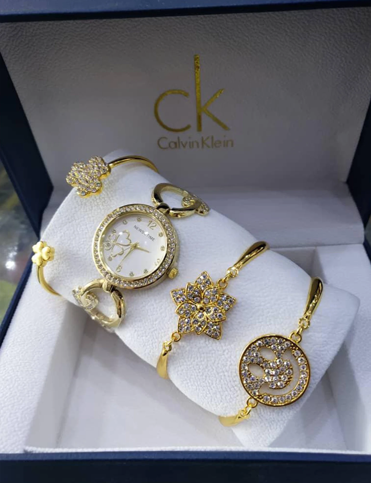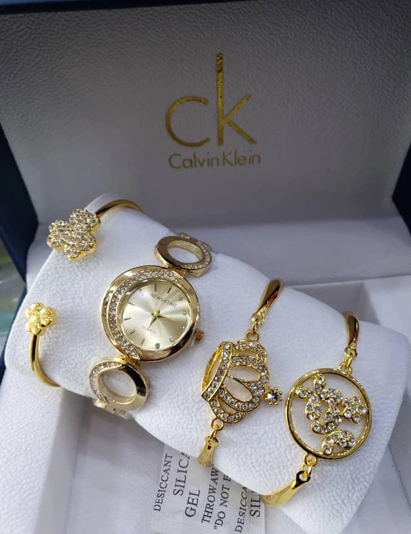 * مجموعة مميزة مكونة من ساعة من الستانلس ستيل مُزينة بالفصوص مع ثلاث أساور من الستانلس - جولد |
