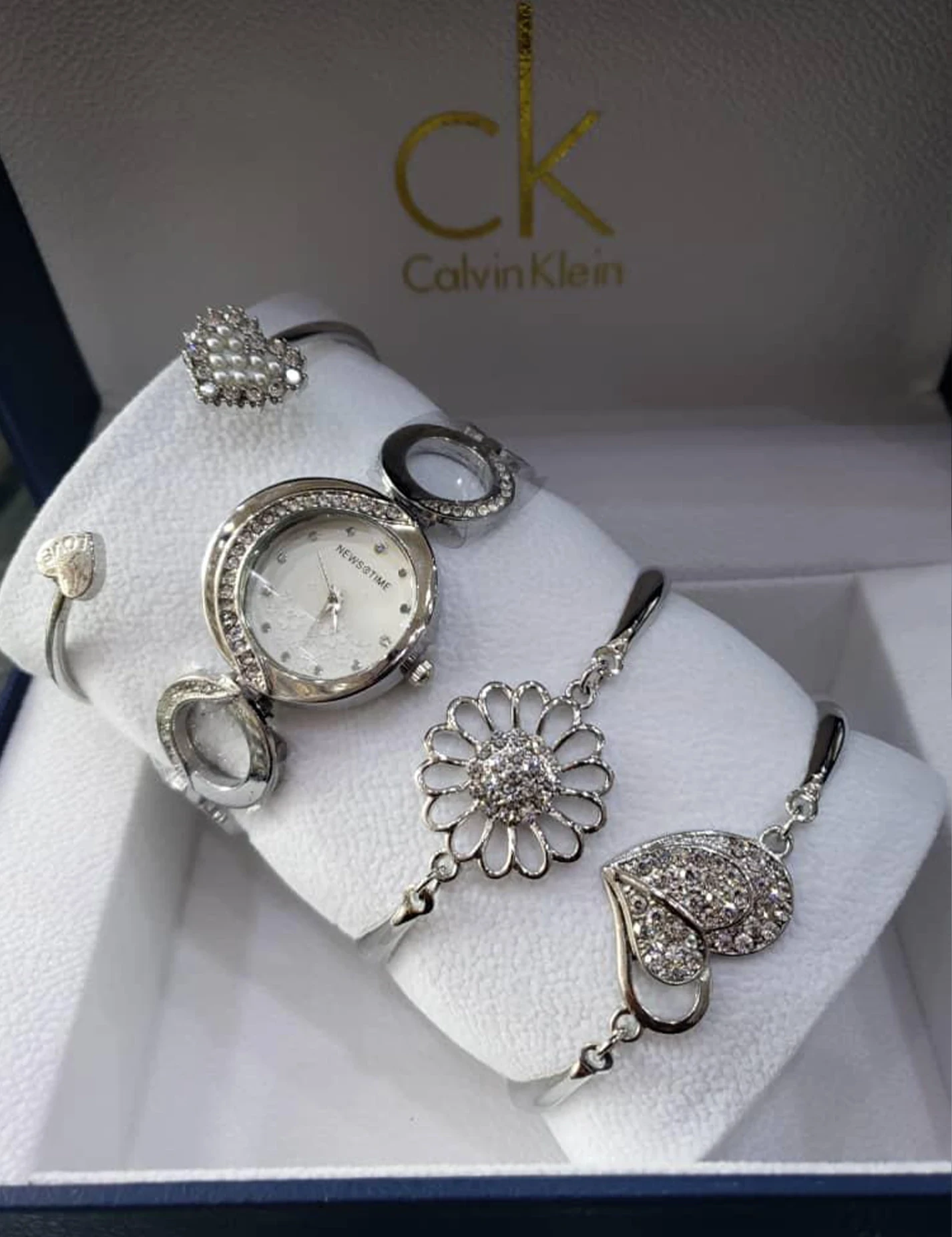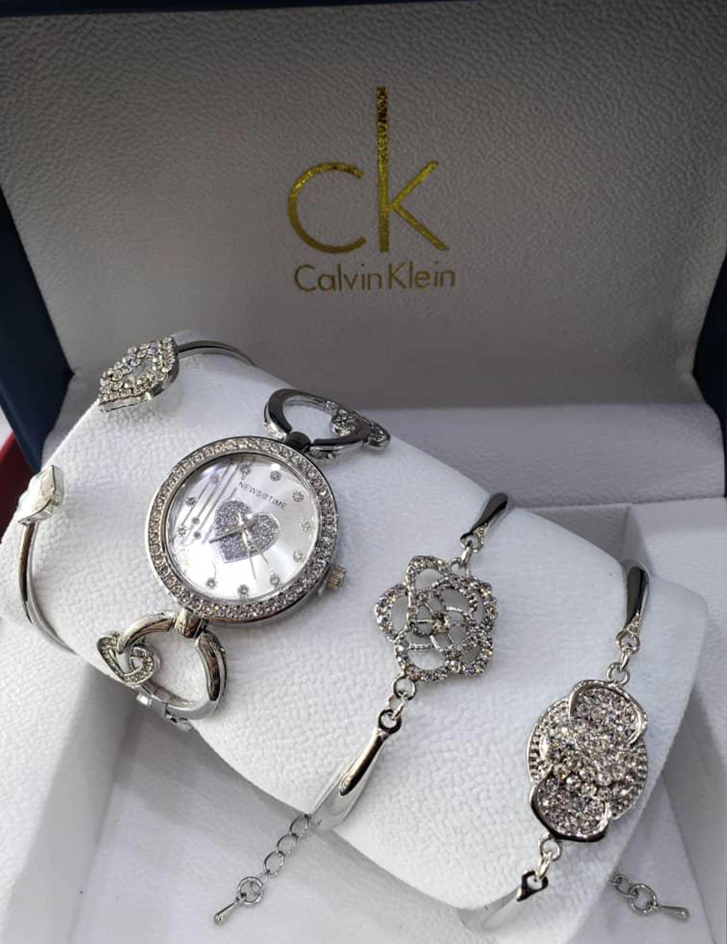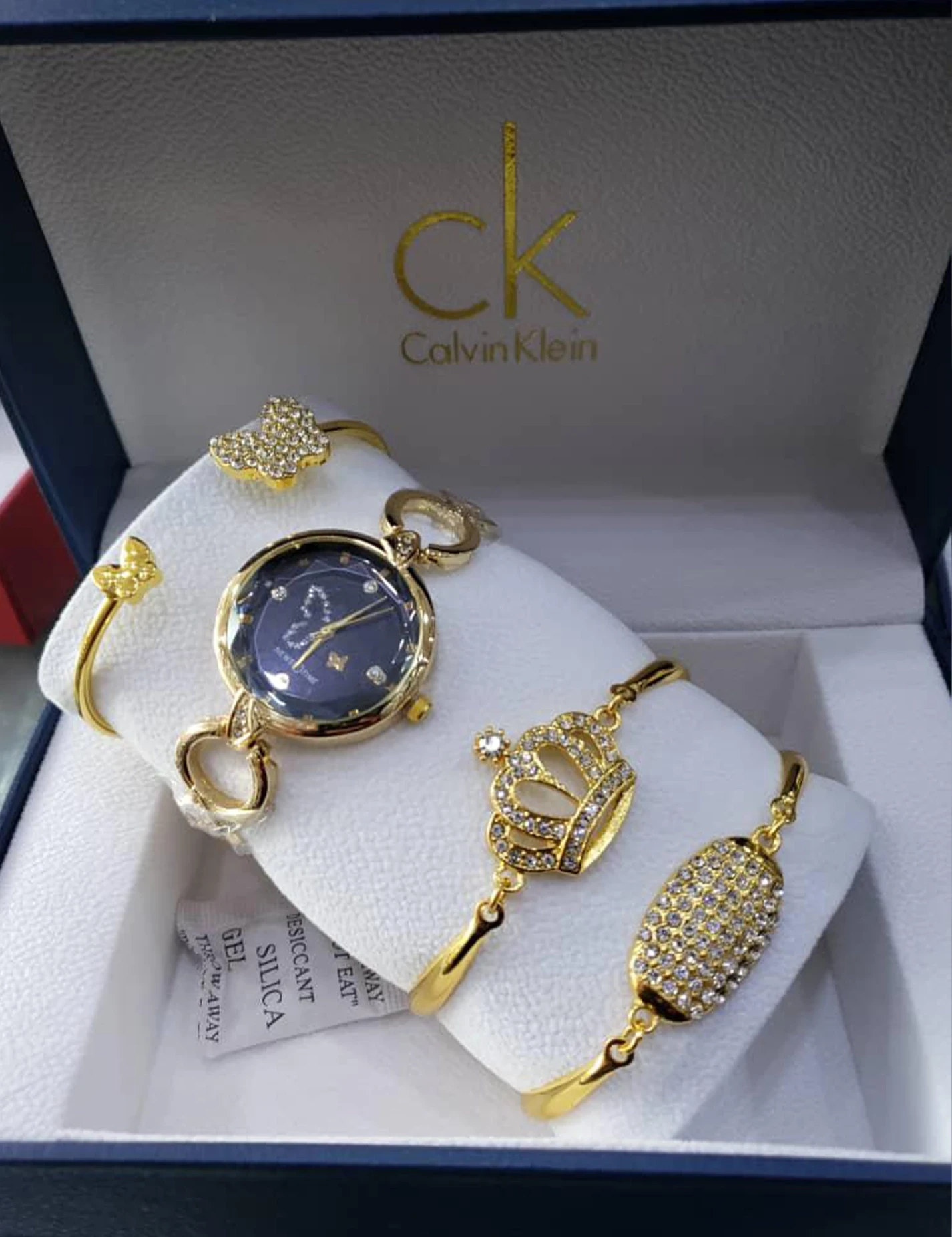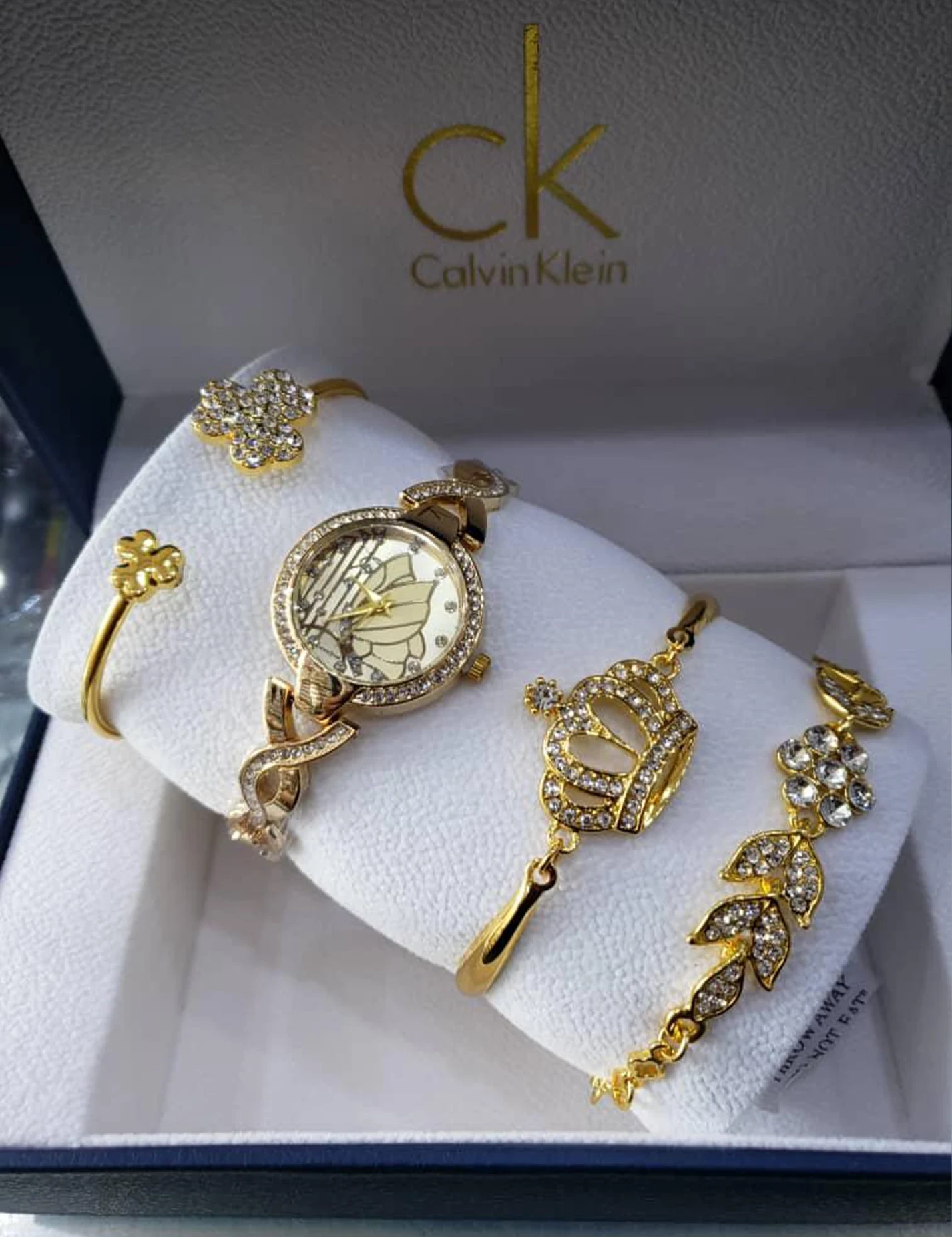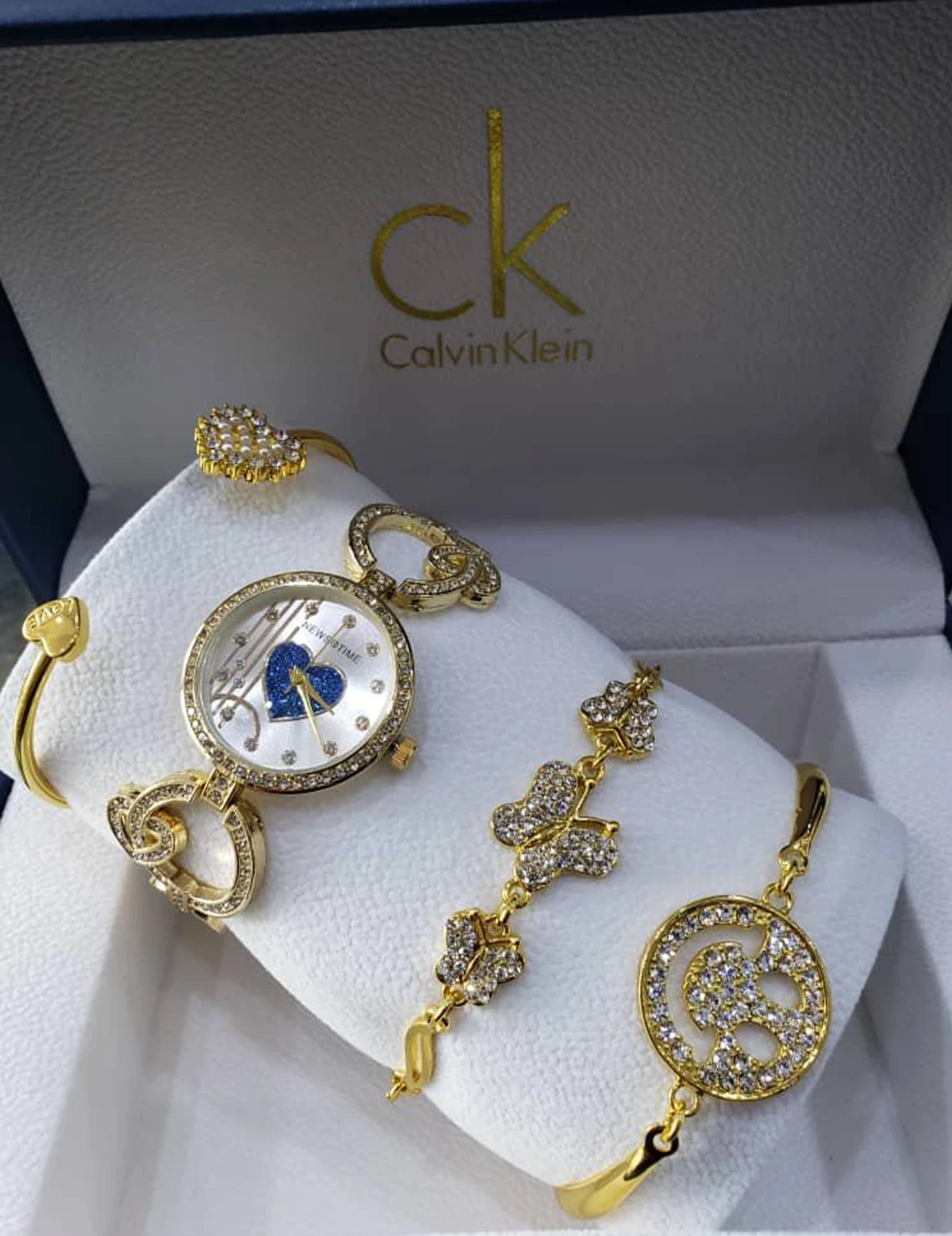 * مجموعة مميزة مكونة من ساعة من الستانلس ستيل مُزينة بالفصوص مع ثلاث أساور من الستانلس - جولد |