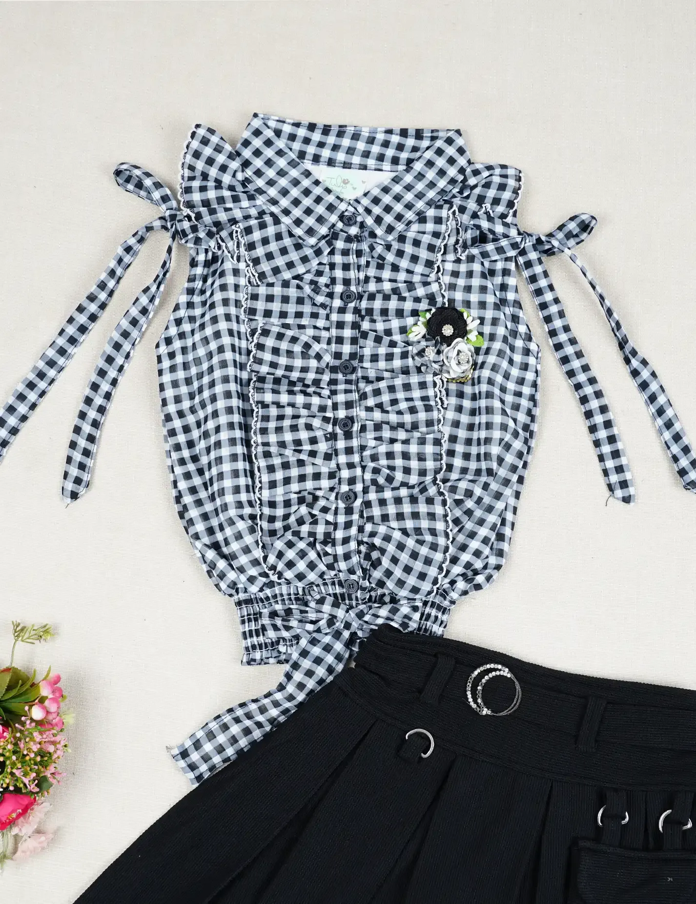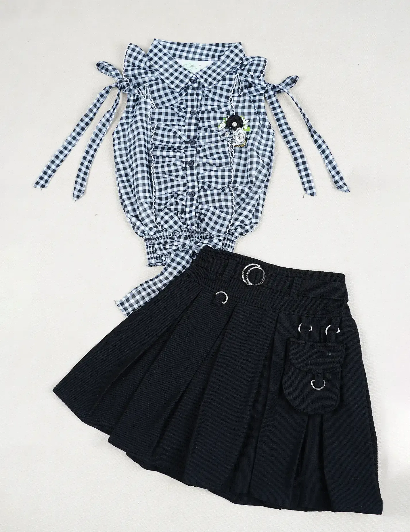 الطقم يتكون من قطعتين: - البلوزة على قبضة استرتش - قماش البلوزة شيفون مبطن * الفوطة على حزام خصر استرتش * نوعية القماش قماش محفر استرتش * الخصر فيه فتحات لاستخدام حزام خارجي |