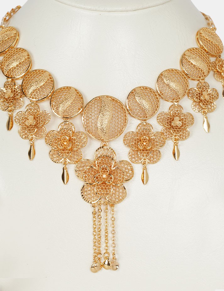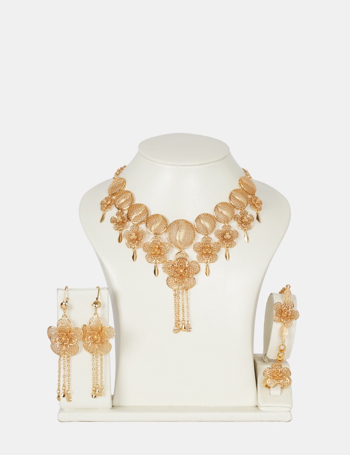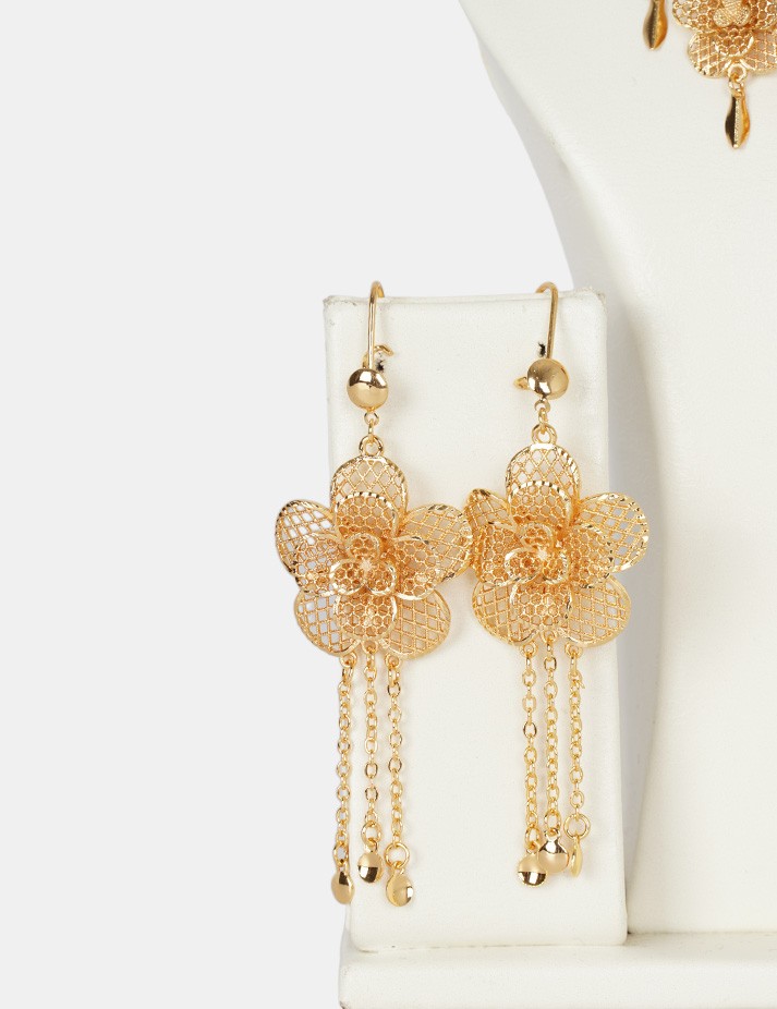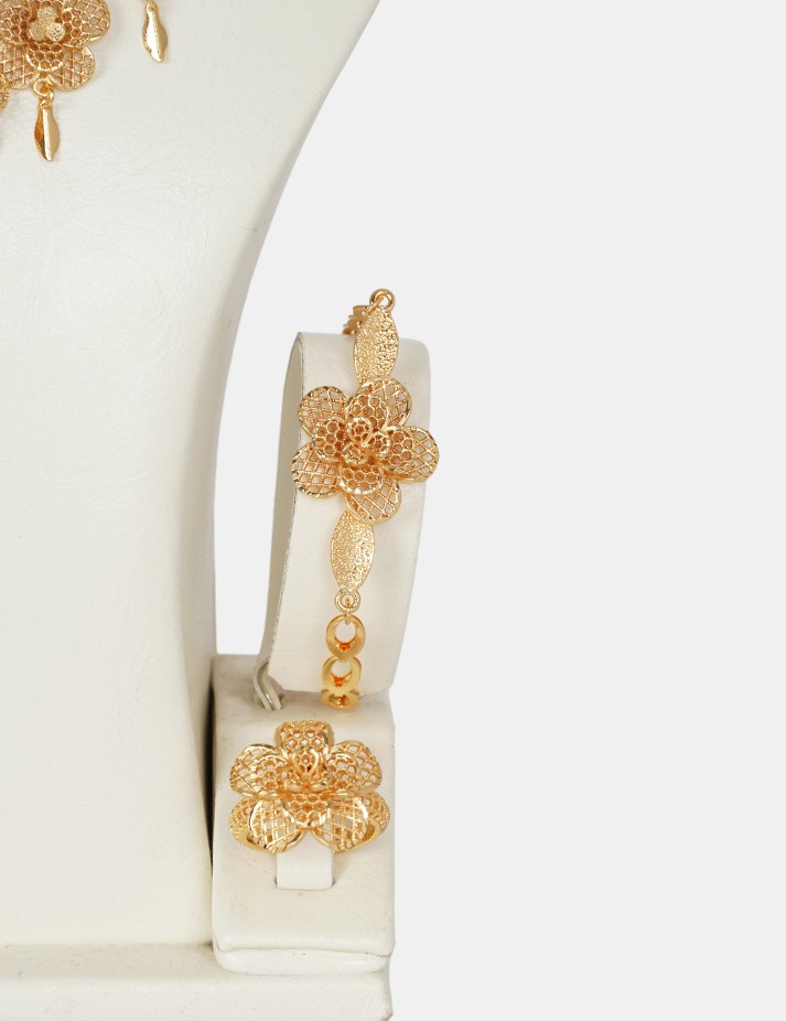 طقم مطلي ذهب معه خاتم وأسوارة وحلقات أذن طويلة، يتميز بتصميمه الذي على شكل زهورودوائر، يضفي لأطلالتك لمسة ساحرة وأنيقة. |