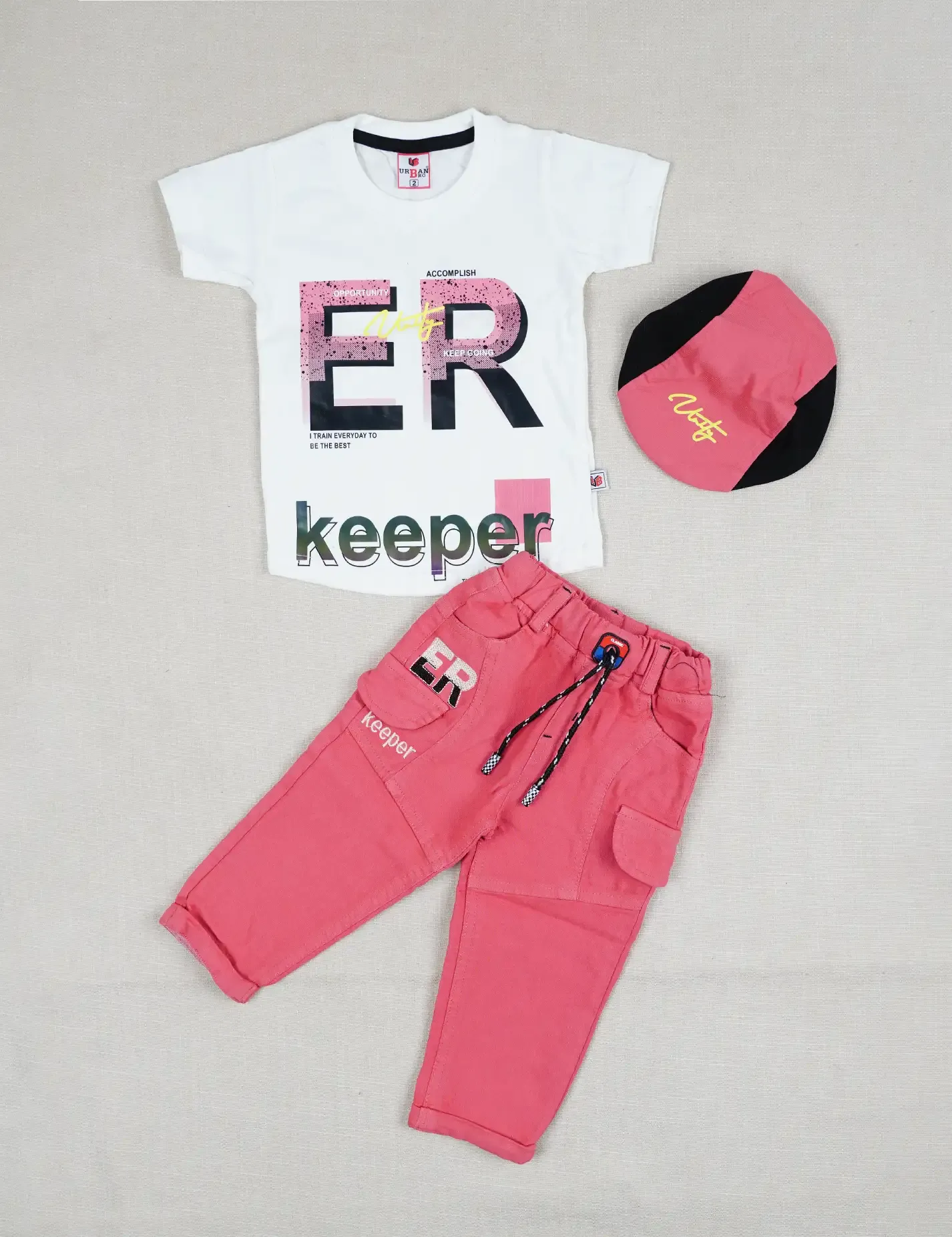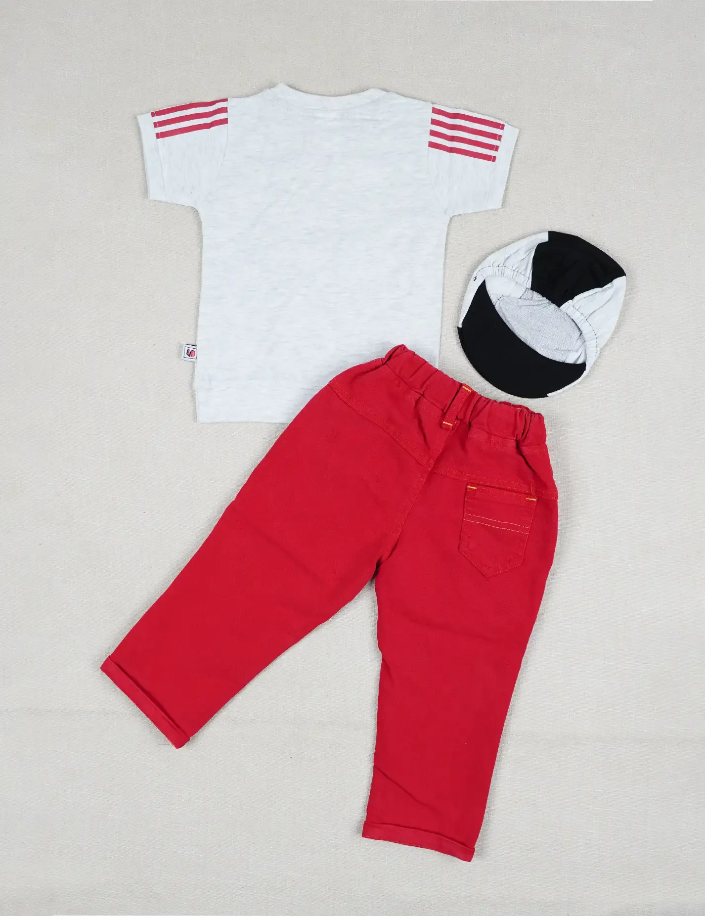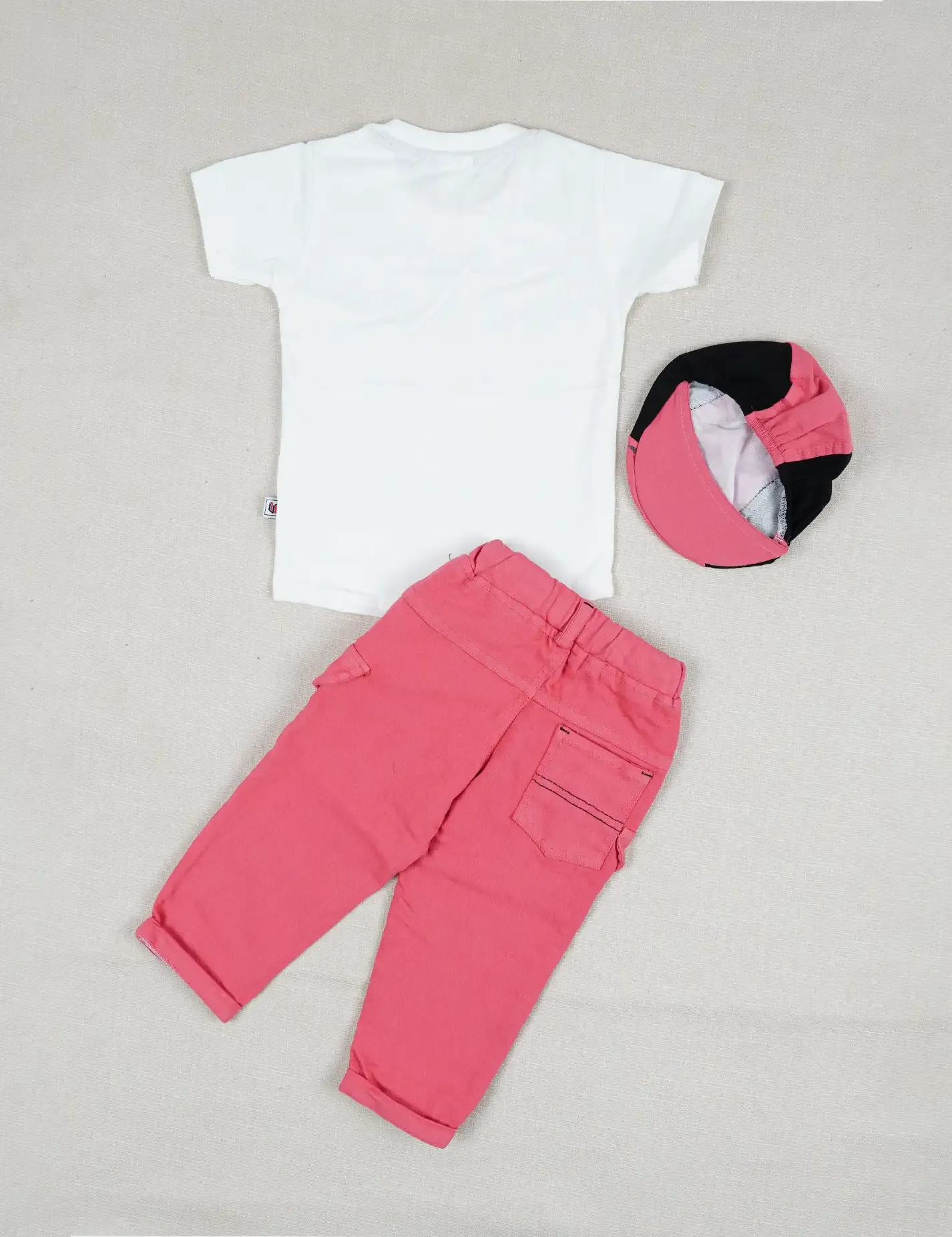 الطقم يتكون من 3 قطع:- - تيشرت نوعية القماش قطن - بنطلون بخامة ممتازة وحزام خصر استرتش - طاقية قطنية على ربل |