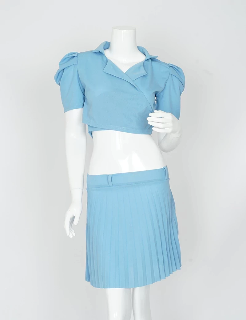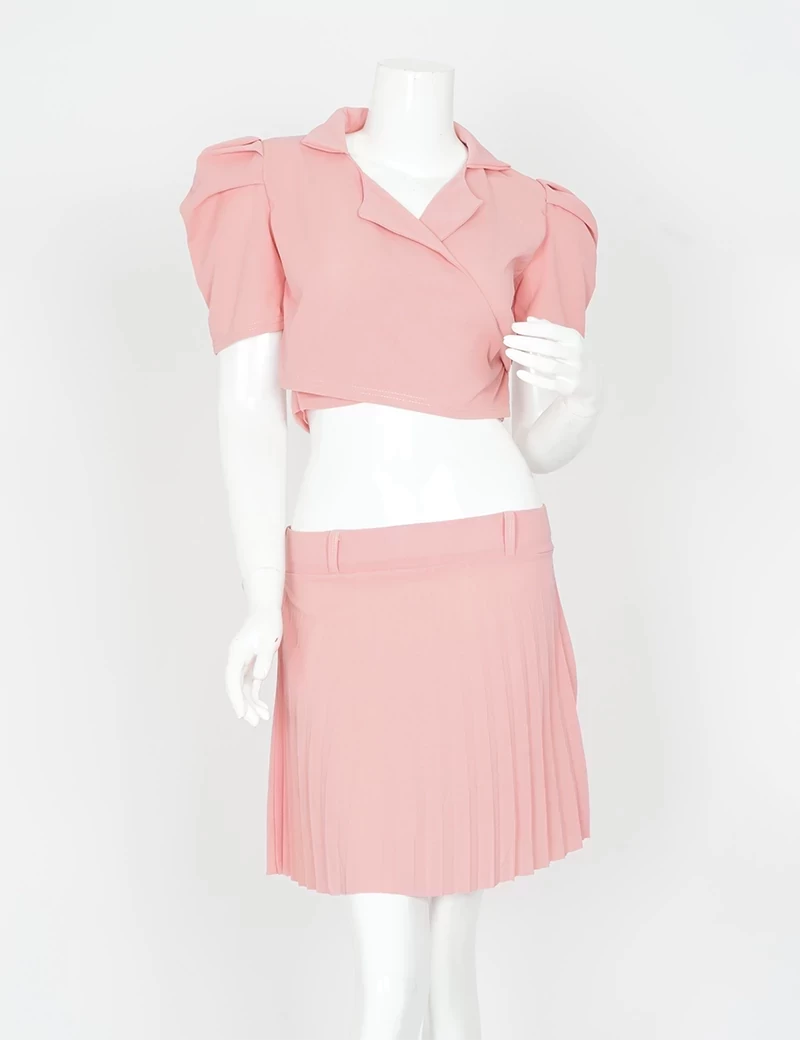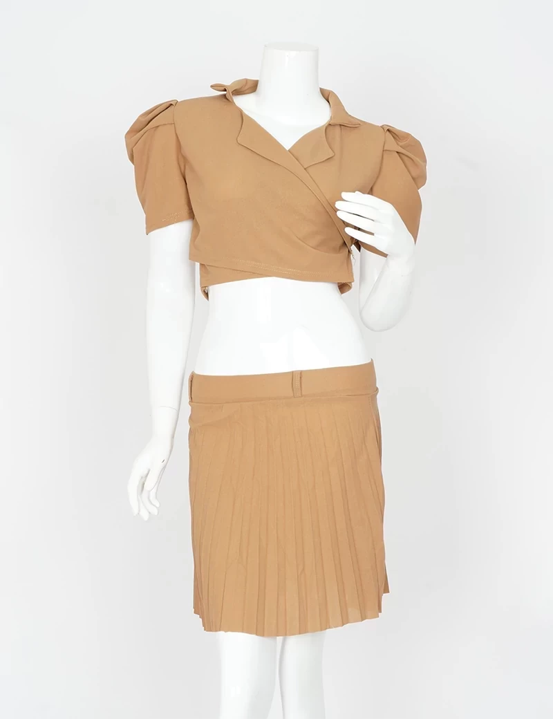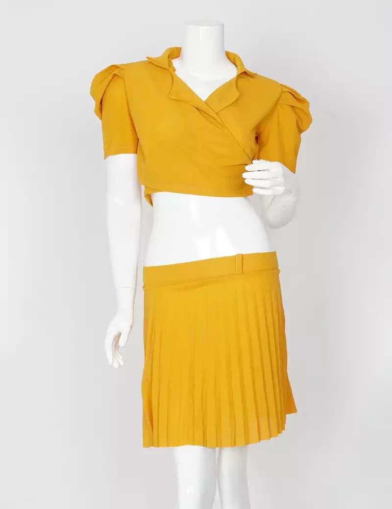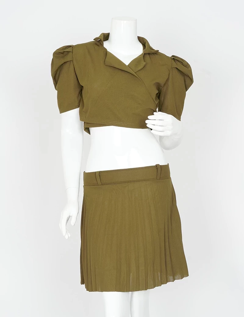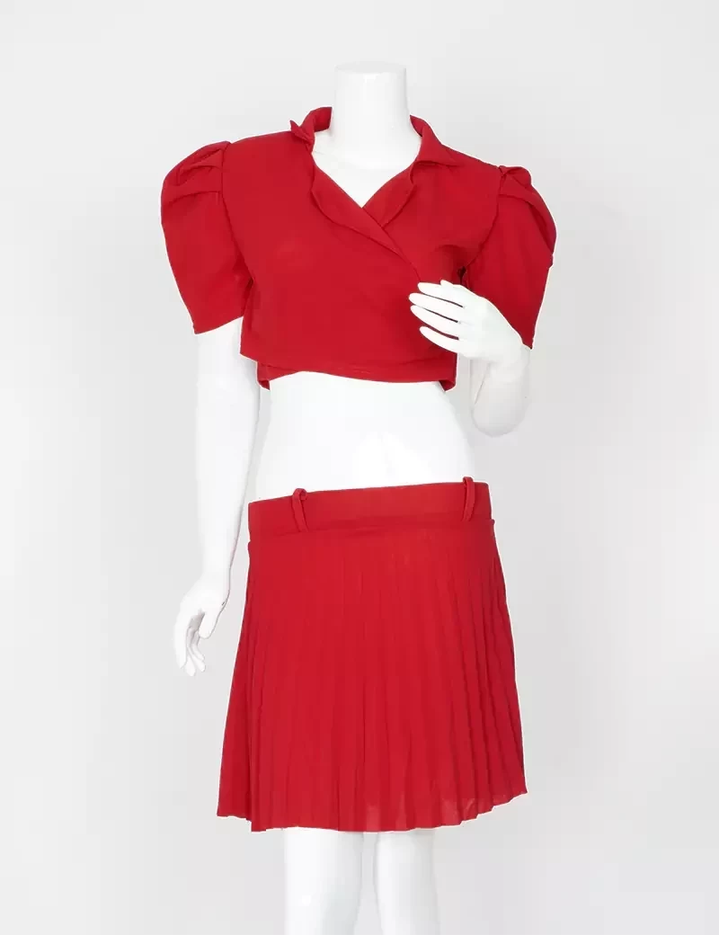 طقم قطعتين بلوزة بأكمام قصيرة كسرات من الكتف وقصة صدر متعاكسة، وتنورة قصرة كسراتيتوفر منه ستة ألوان الأحمر والبني والزيتوني والأصفر والسماوي والوردي. |