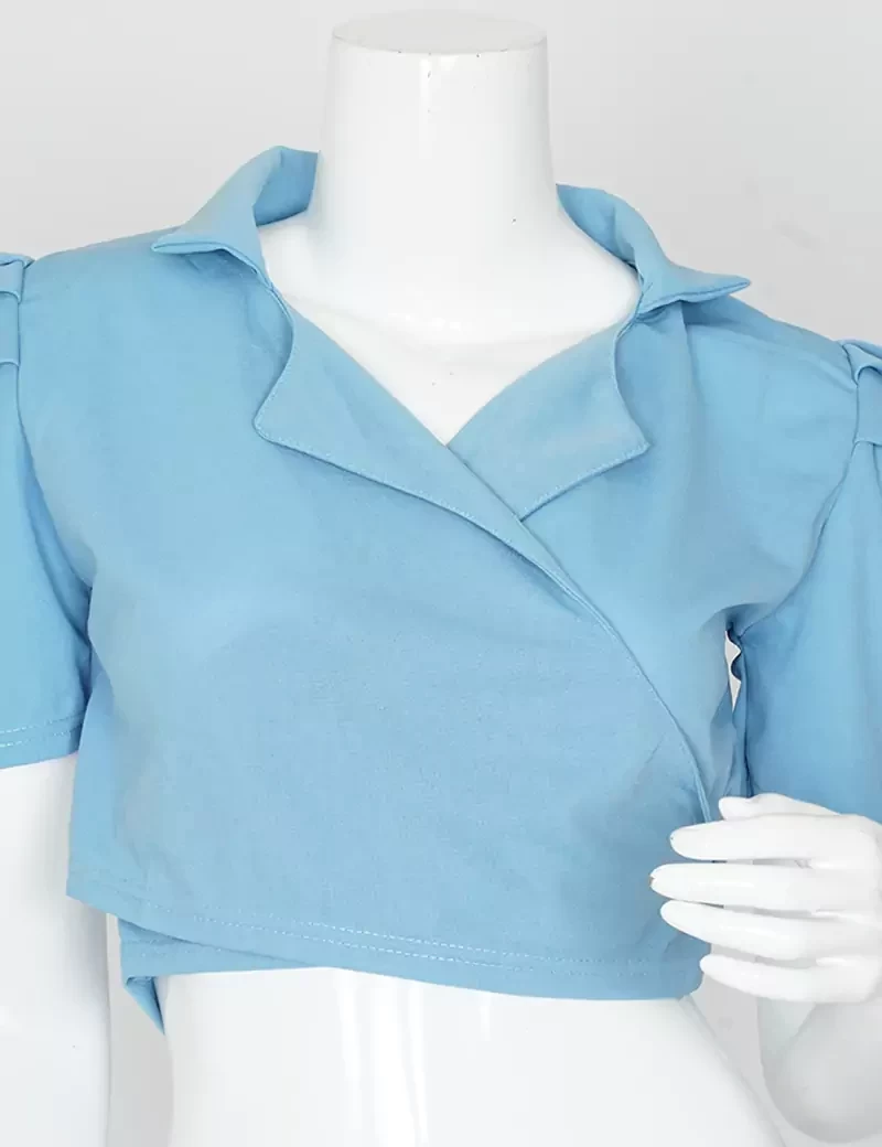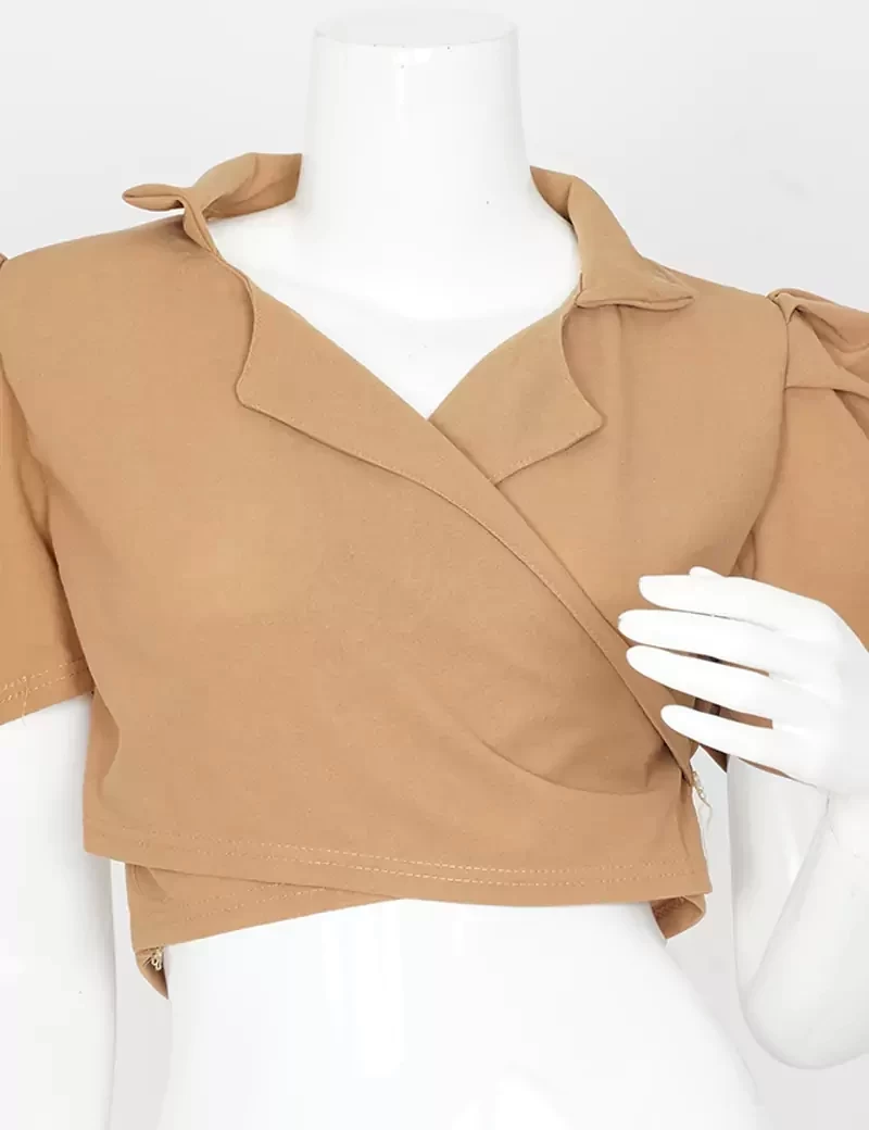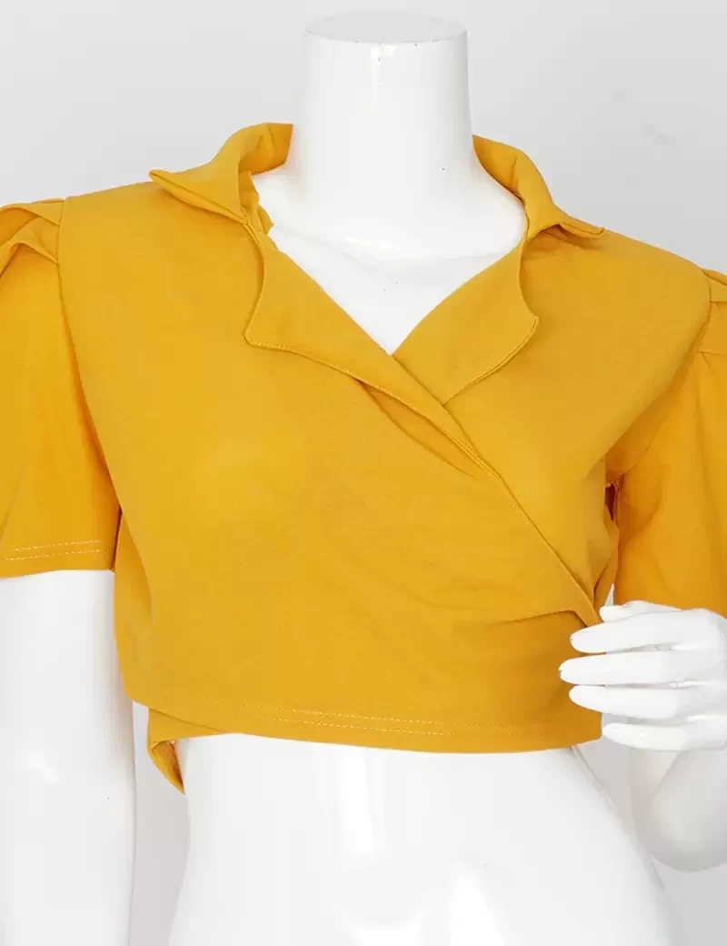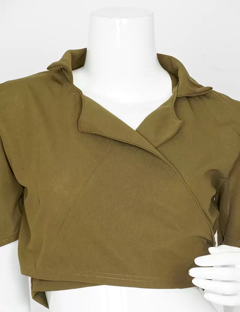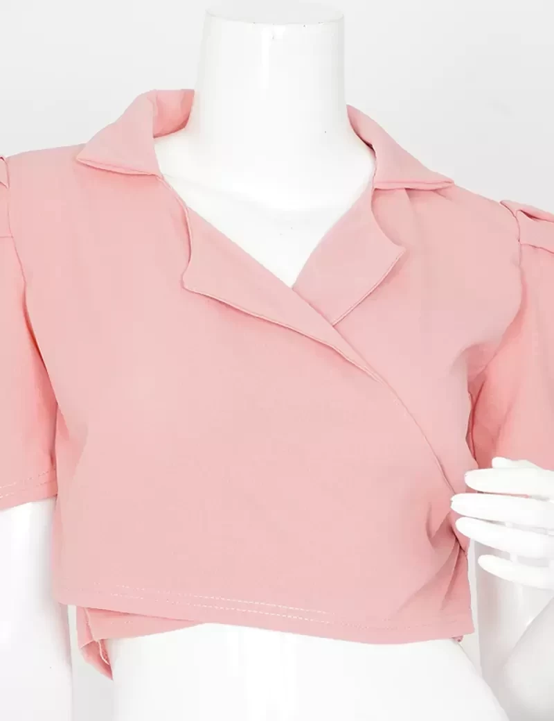 طقم قطعتين بلوزة بأكمام قصيرة كسرات من الكتف وقصة صدر متعاكسة، وتنورة قصرة كسراتيتوفر منه ستة ألوان الأحمر والبني والزيتوني والأصفر والسماوي والوردي. |