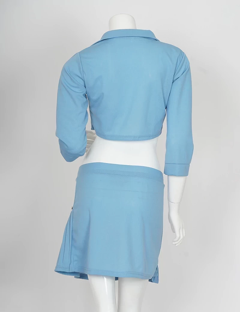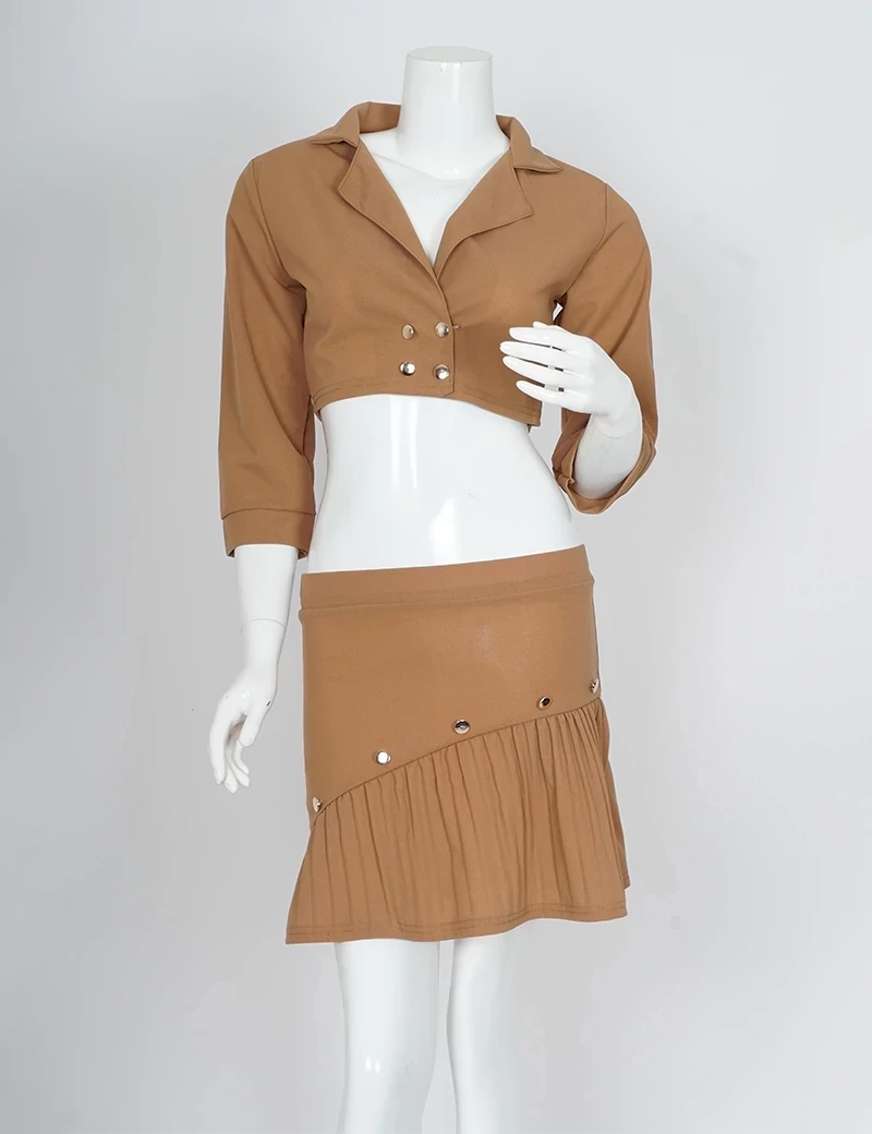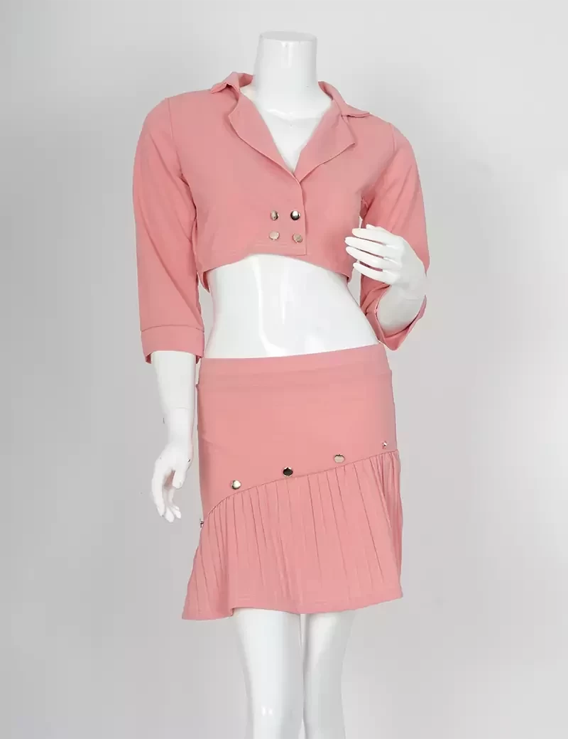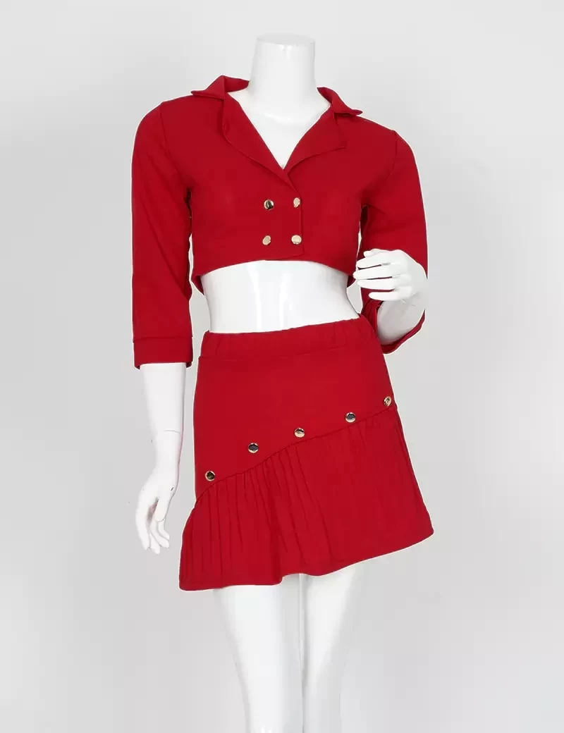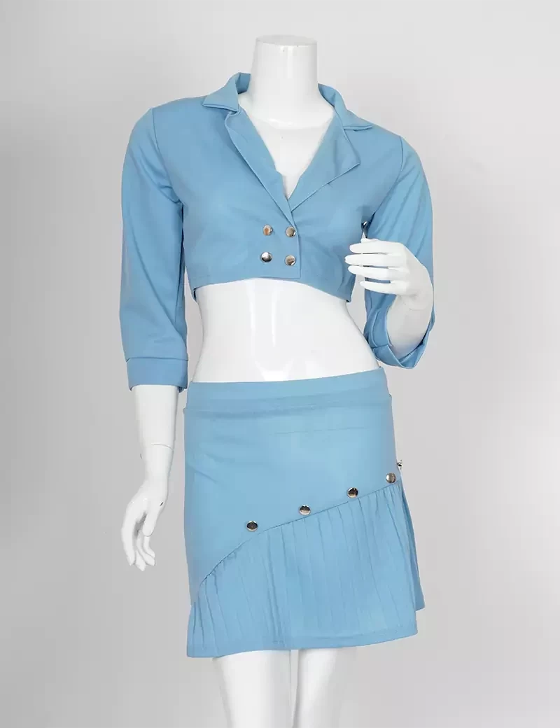 طقم مكون من قطعتين بلوزة على ياقة وزرارات من الأمام وأكمام متوسطة الطول " كم حيران" تنورة على زرارات وكسرات من الأماميتوفر منه ستة ألوان السماوي والأحمر والبني والبرتقالي والزيتوني والوردي |