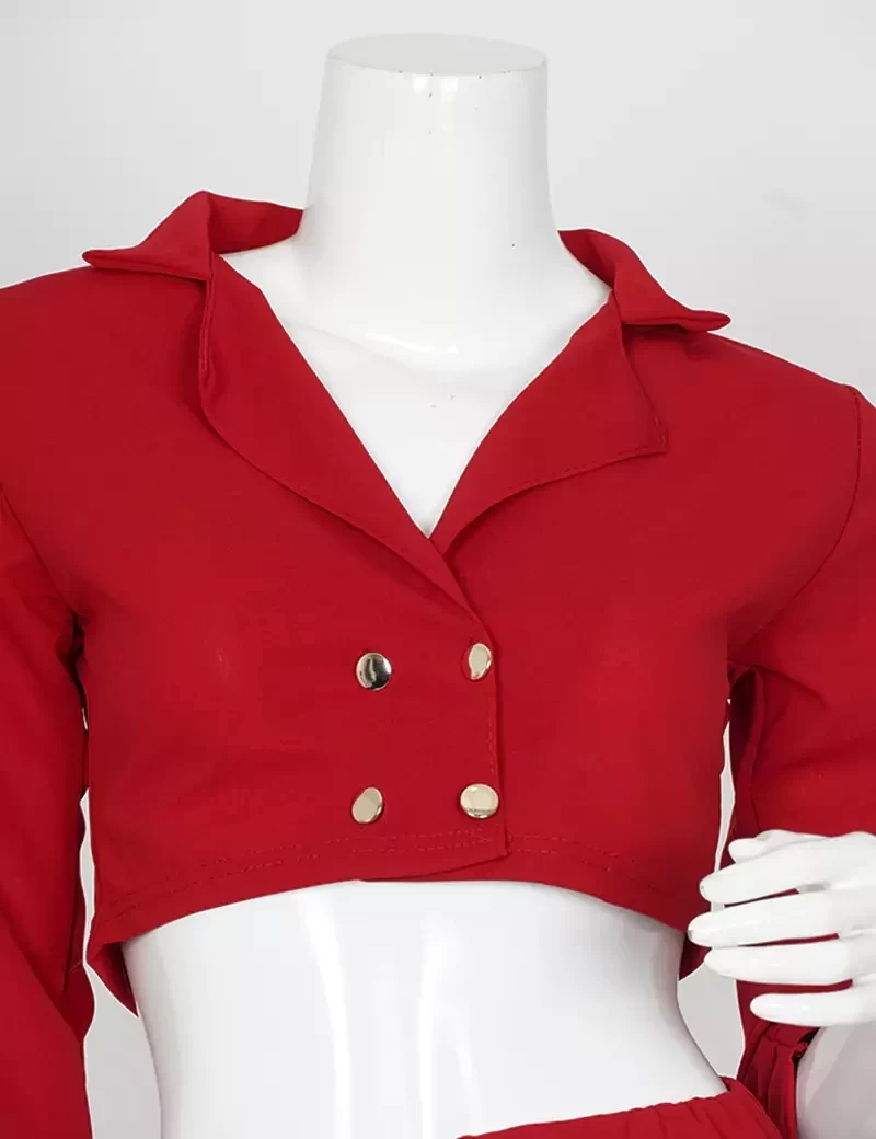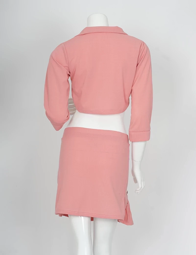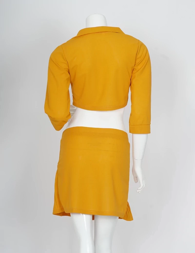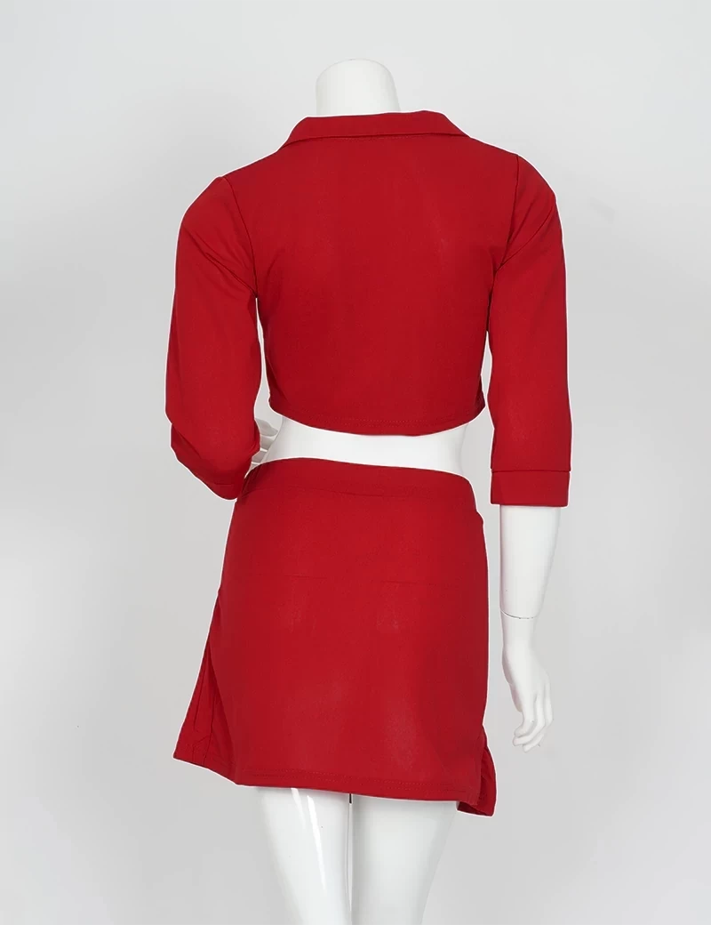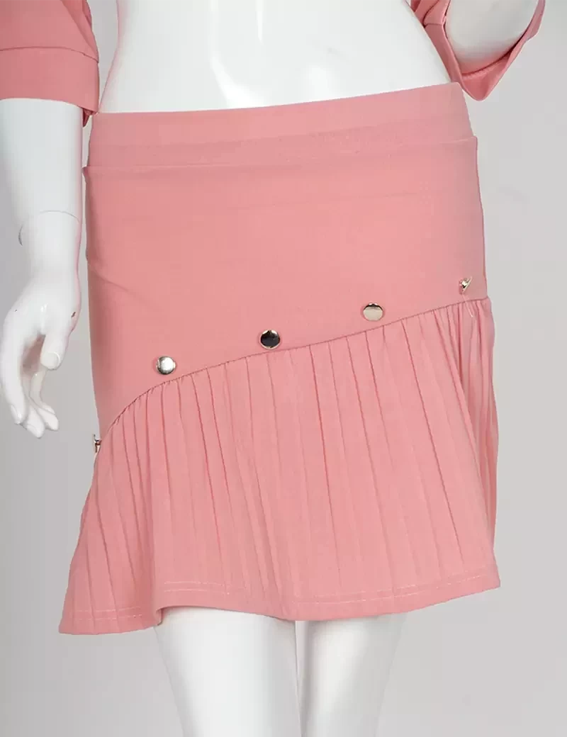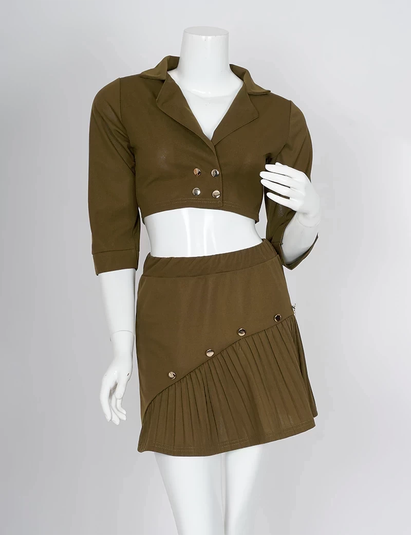 طقم مكون من قطعتين بلوزة على ياقة وزرارات من الأمام وأكمام متوسطة الطول " كم حيران" تنورة على زرارات وكسرات من الأماميتوفر منه ستة ألوان السماوي والأحمر والبني والبرتقالي والزيتوني والوردي |