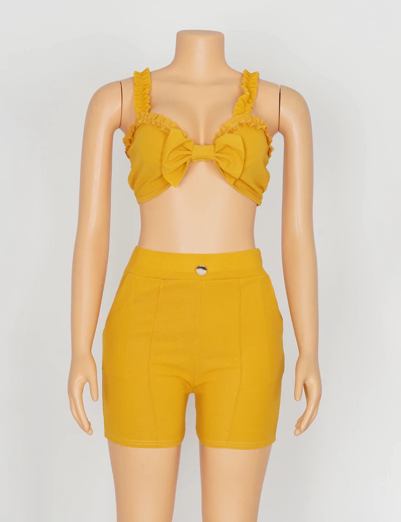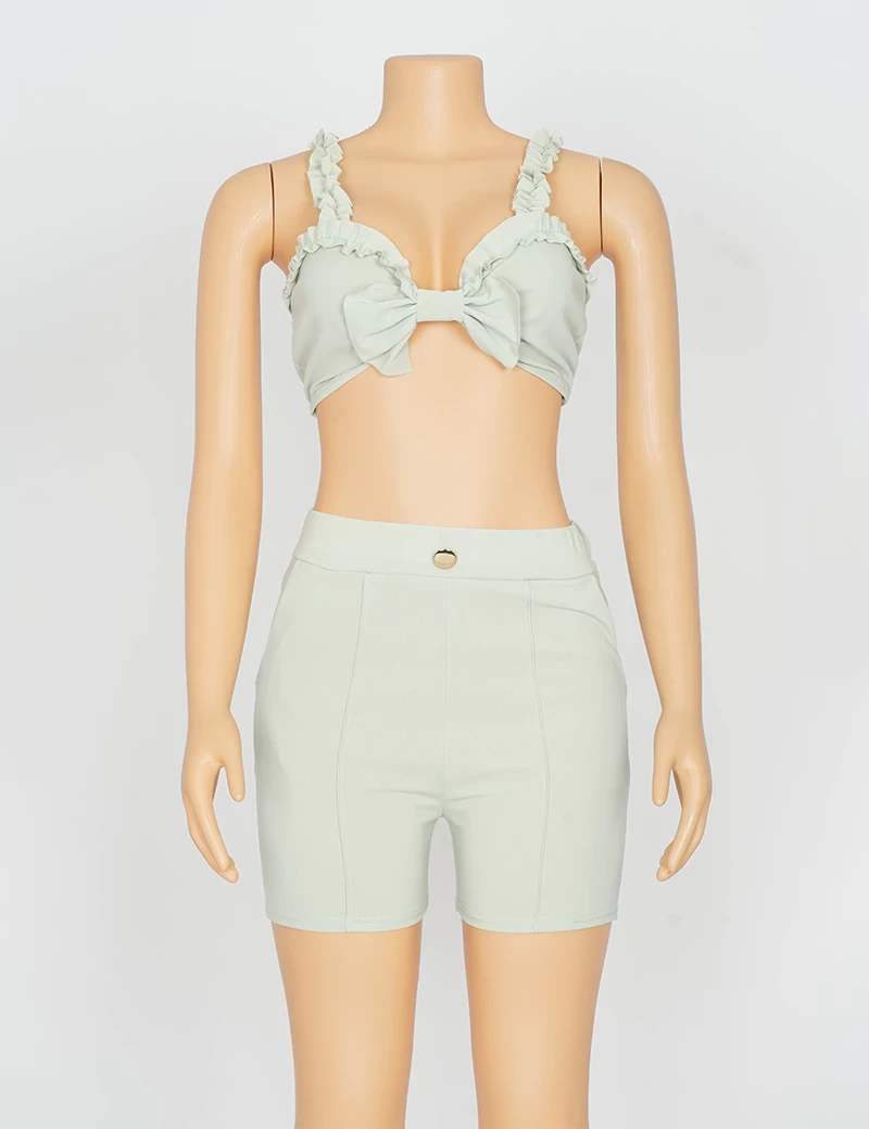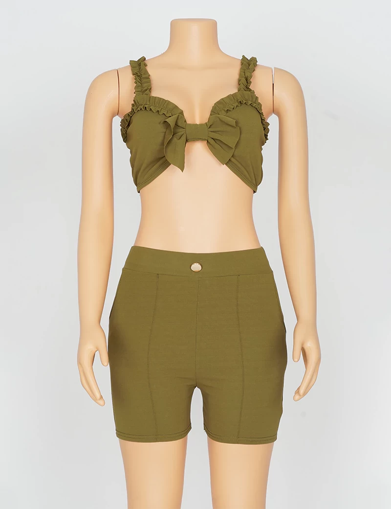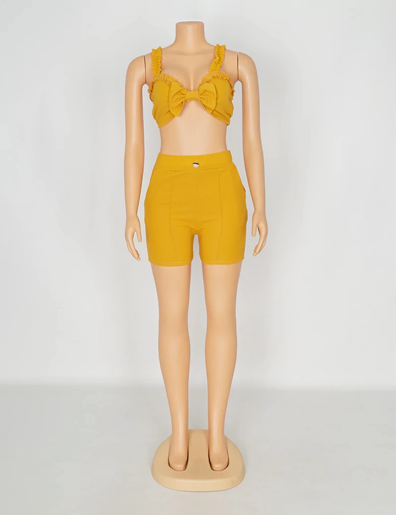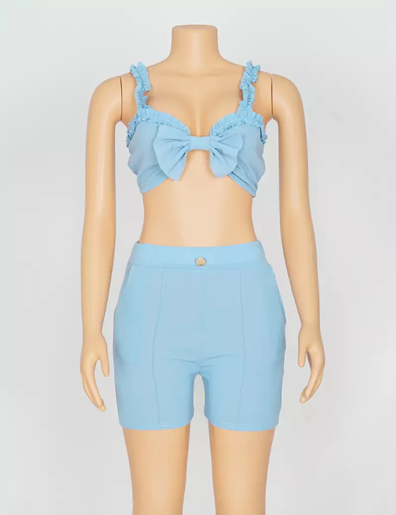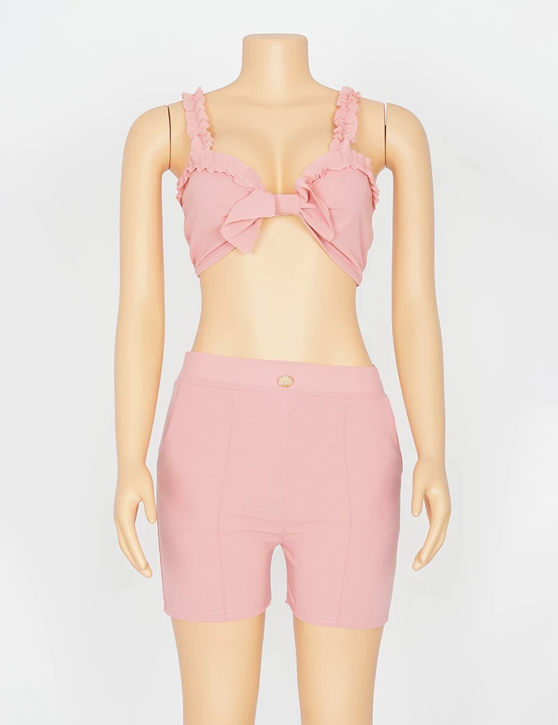 نوع القماش/ استرتشمتوفر بستة ألوان السماوي والبرتقالي الزيتوني والوردي والأحمر والرمادي الفاتحيتكون من قطعتين حمالة صدر على شكل فينكة، وبنطنول شورت. |